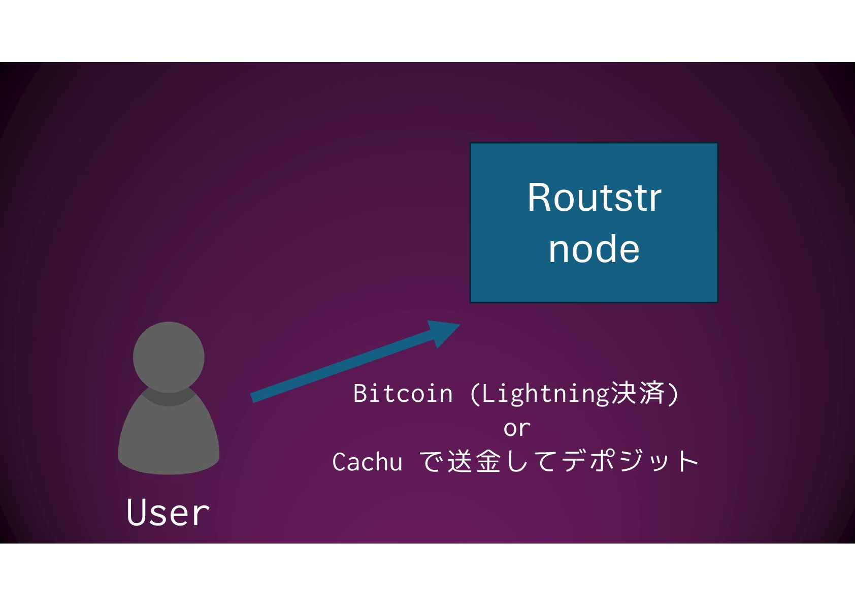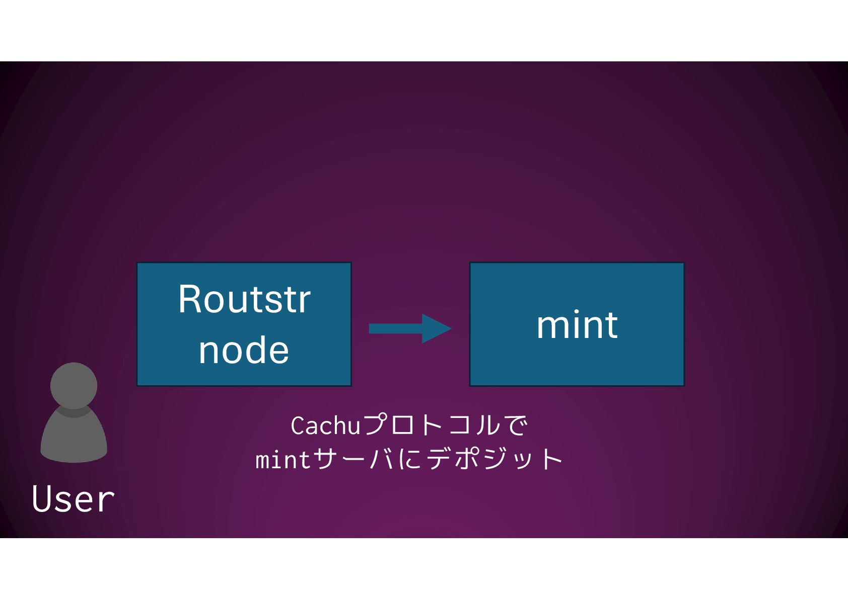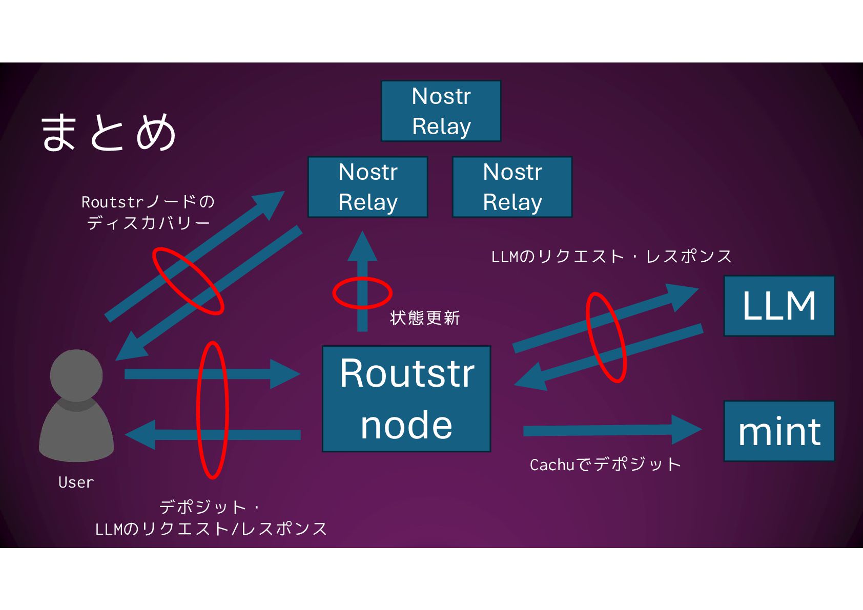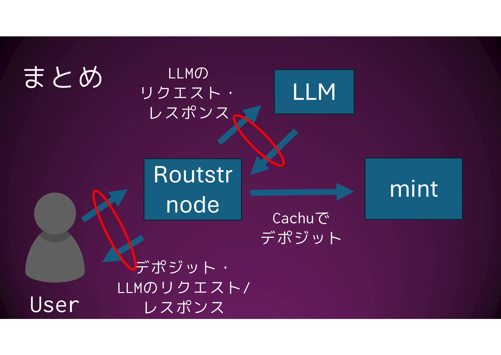 Routstr node User LLM デポジット・ LLMのリクエスト/レスポンス mint LLMのリクエスト・レスポンス Cachuでデポジット まとめ