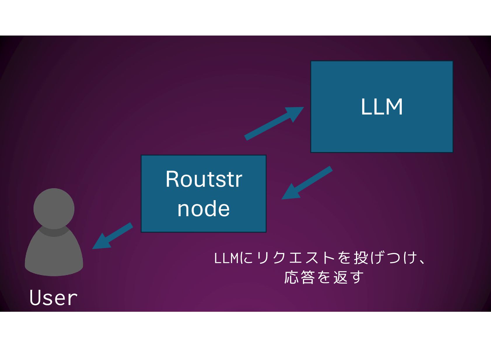 Routstr node User LLM LLMにリクエストを投げつけ、 応答を返す