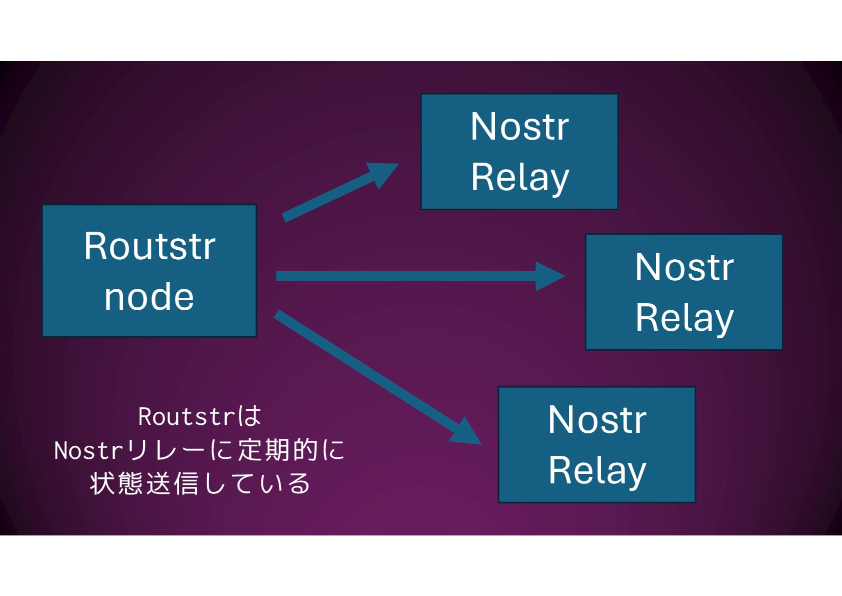 Routstr node Nostr Relay Routstrは Nostrリレーに定期的に 状態送信している Nostr Relay Nostr