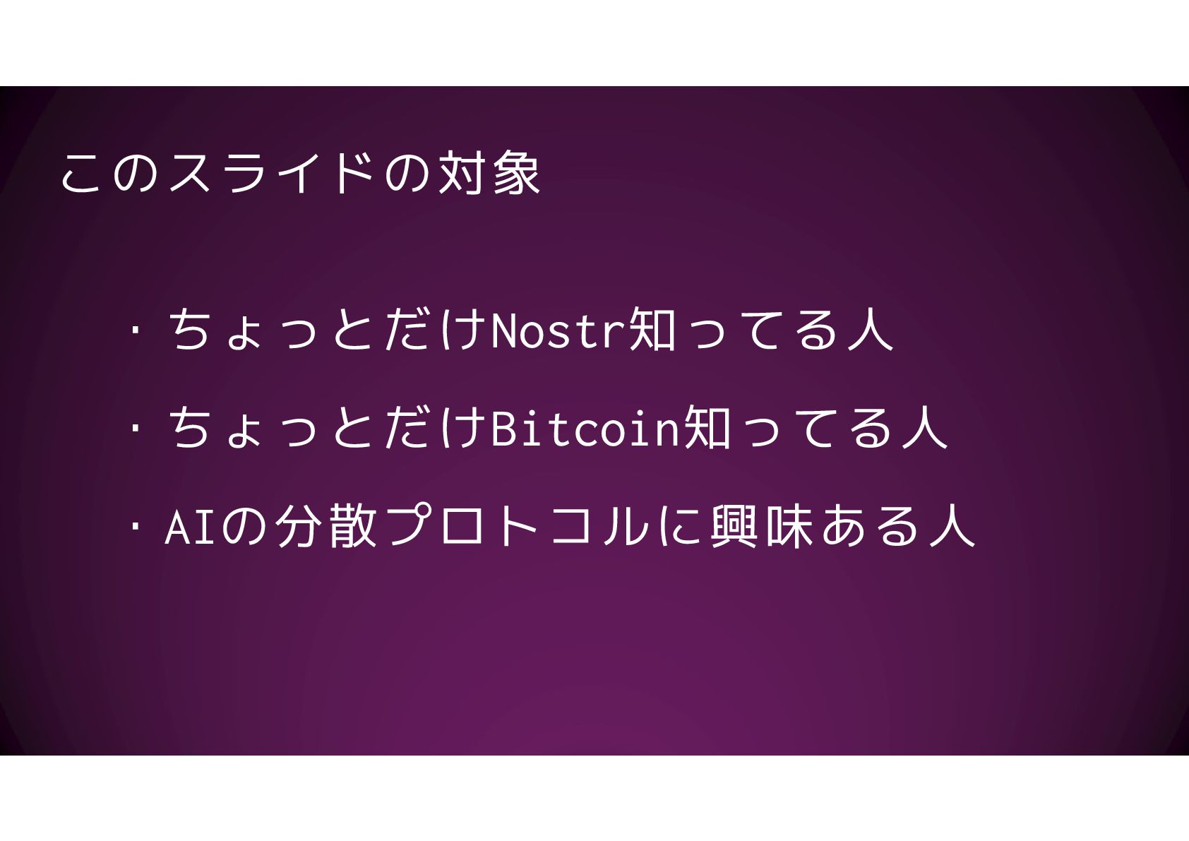 ・ちょっとだけNostr知ってる人 ・ちょっとだけBitcoin知ってる人 ・AIの分散プロトコルに興味ある人 このスライドの対象