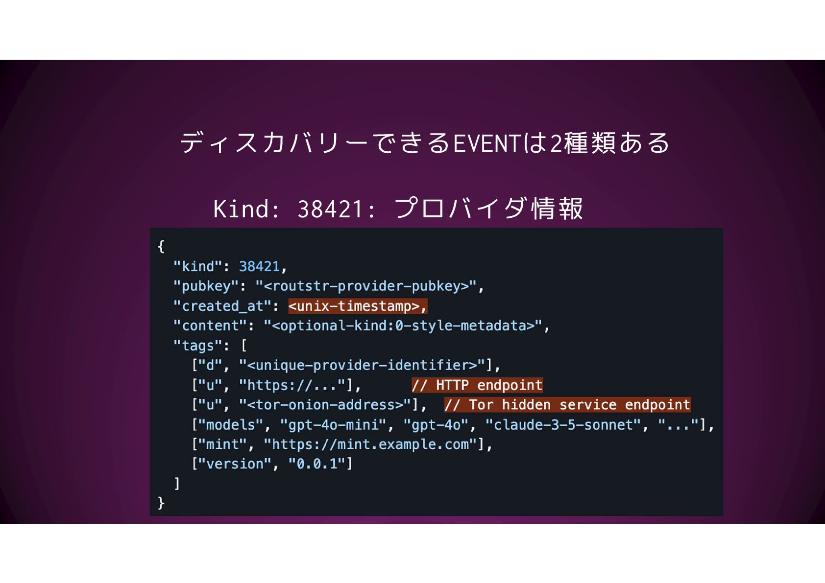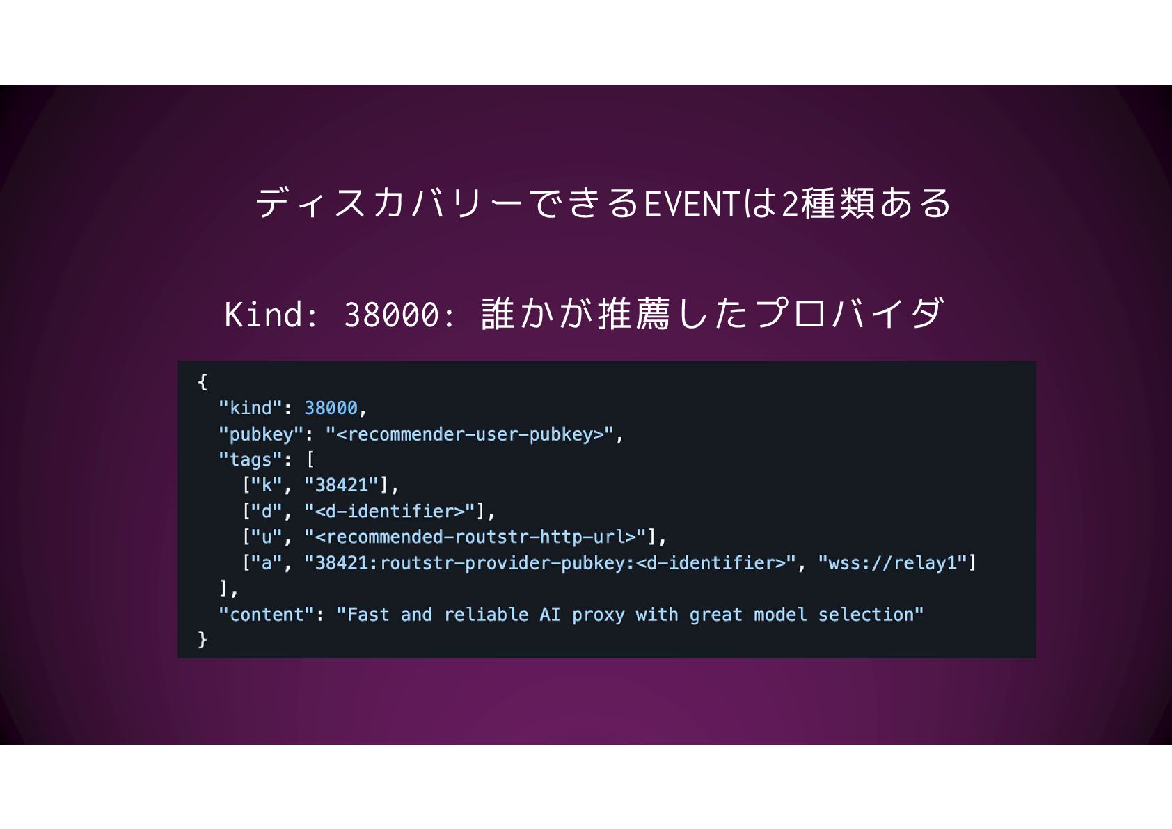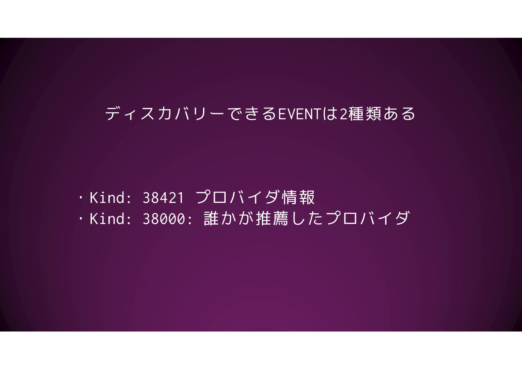 ディスカバリーできるEVENTは2種類ある Kind: 38421: プロバイダ情報