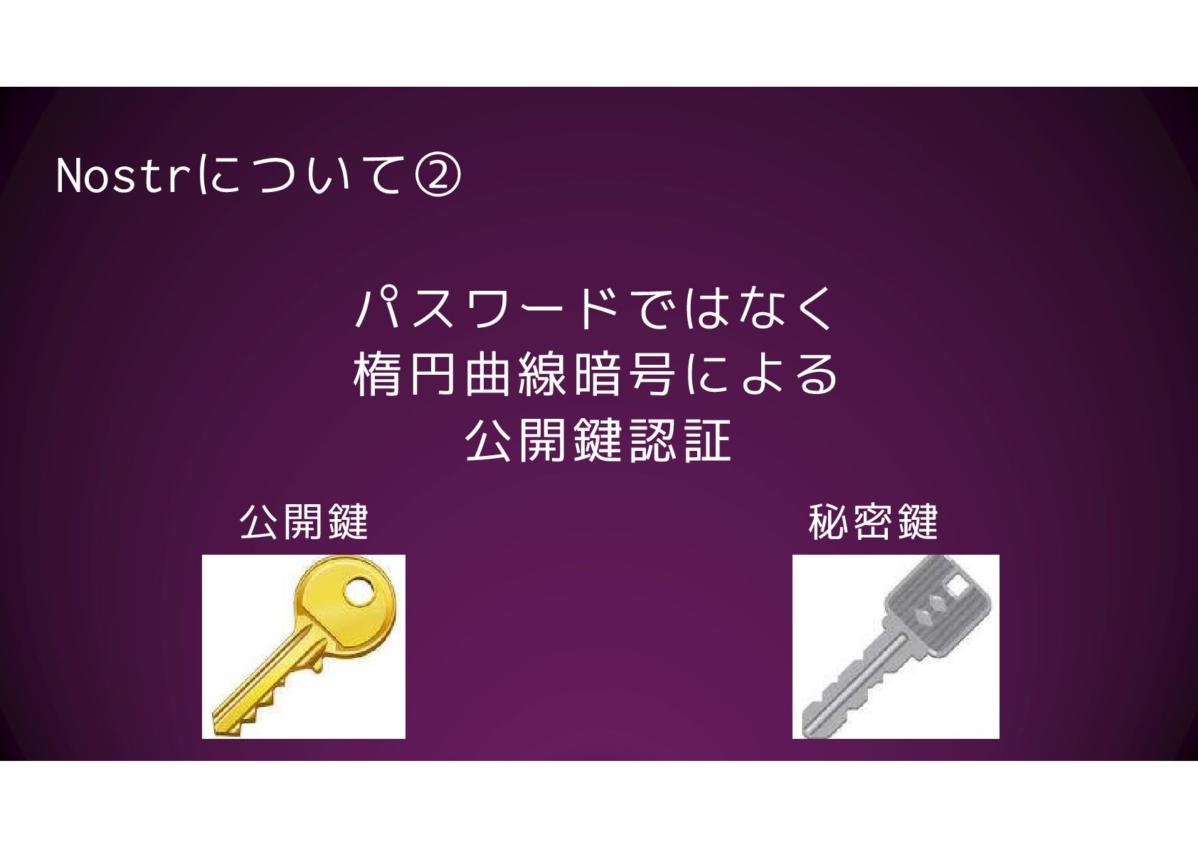 Nostrについて② パスワードではなく 楕円曲線暗号による 公開鍵認証 公開鍵 秘密鍵