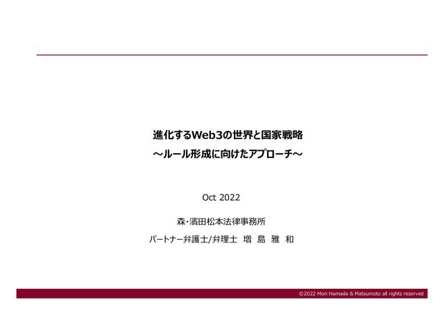 - 0 - ©2022 Mori Hamada & Matsumoto all rights reserved Oct 2022 森・濱⽥松本法律事務所 パートナー弁護⼠/弁理⼠ 増 島 雅 和 進化するWeb3の世界と国家戦略 〜ルール形成に向けたアプローチ〜