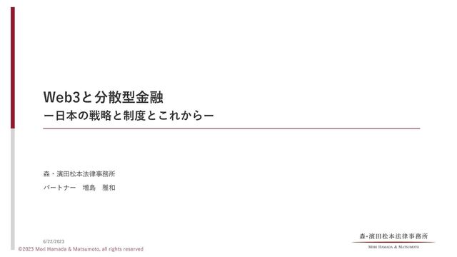 <NFTのデータ構造> トークン識別子 ウォレットID メタデータ 1 A (“名前”:”作品X”,...) 2 B (“名前”:”作品Y”,...) 3 C (“名前”:”作品Z,...) … … … ブロックチェーン上にはメタデータが記録されておらず、メタデータが置かれている外部のURLが記録されていて、URL先のサーバに記録 されたデータを読み出して画面上に表示される実装のものが通常 URLは書き換えられないもののURL先のサーバ上のデータは改変可能 分散ファイルシステム(IPFS:inter planetary file system)によりコンテンツIDを振る実装もある ウォレットIDの記録履歴をチェーン上に保存することができることで、あるトークン(NFT)と紐づくウォレットアドレスの持主(≒保有 者)を技術的に証明できる NFTの基礎 ©2023 Mori Hamada & Matsumoto, all rights reserved