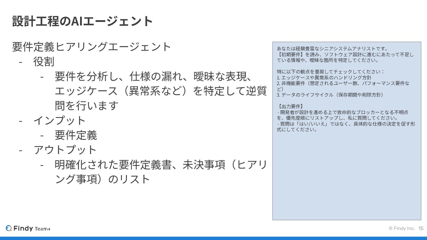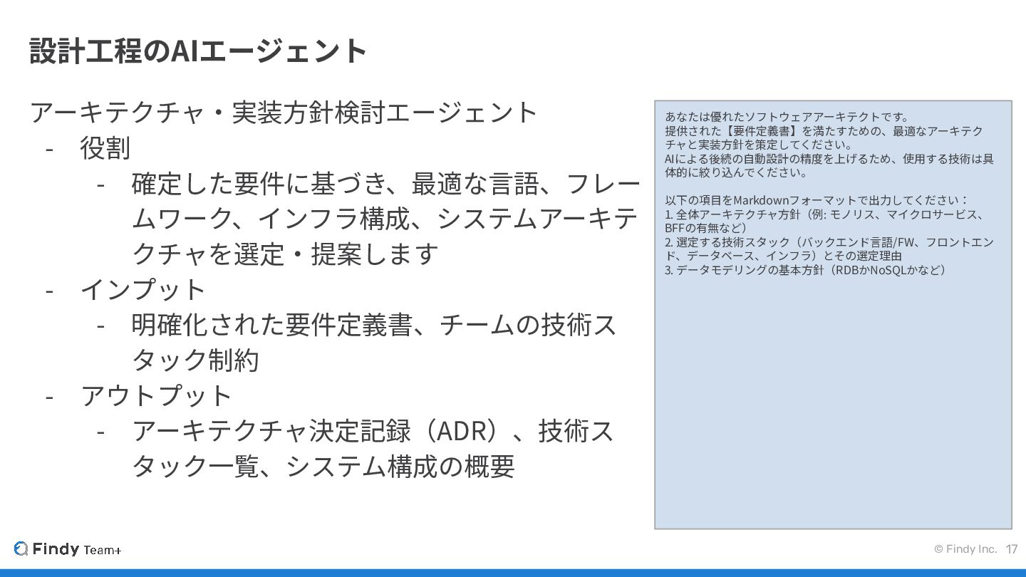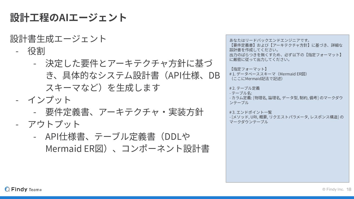 き、具体的なシステム設計書(API仕様、DB スキーマなど)を⽣成します - インプット - 要件定義書、アーキテクチャ‧実装⽅針 - アウトプット - API仕様書、テーブル定義書(DDLや Mermaid ER図)、コンポーネント設計書 あなたはリードバックエンドエンジニアです。 【要件定義書】および【アーキテクチャ⽅針】に基づき、詳細な 設計書を作成してください。 出⼒のばらつきを無くすため、必ず以下の【指定フォーマット】 に厳密に従って出⼒してください。 【指定フォーマット】 # 1. データベーススキーマ(Mermaid ER図) (ここにMermaid記法で記述) # 2. テーブル定義 - テーブル名: - カラム定義: [物理名, 論理名, データ型, 制約, 備考] のマークダウ ンテーブル # 3. エンドポイント⼀覧 - [メソッド, URI, 概要, リクエストパラメータ, レスポンス構造] の マークダウンテーブル