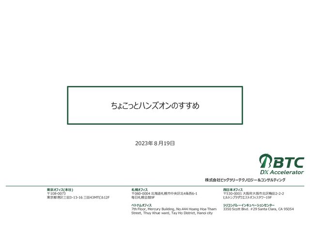 Hoang Hoa Tham Street, Thuy Khue ward, Tay Ho District, Hanoi city 西日本オフィス 〒530-0001 大阪府大阪市北区梅田2-2-2 ヒルトンプラザウエストオフィスタワー19F シリコンバレーインキュベーションセンター 3350 Scott Blvd. #29 Santa Clara, CA 95054 東京オフィス(本社) 〒108-0073 東京都港区三田3-13-16 三田43MTビル12F 株式会社ビッグツリーテクノロジー&コンサルティング ちょこっとハンズオンのすすめ 2023年8月19日