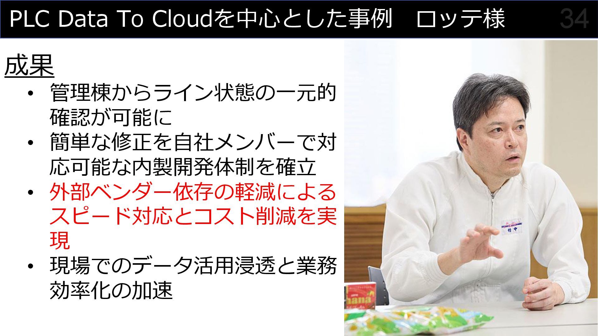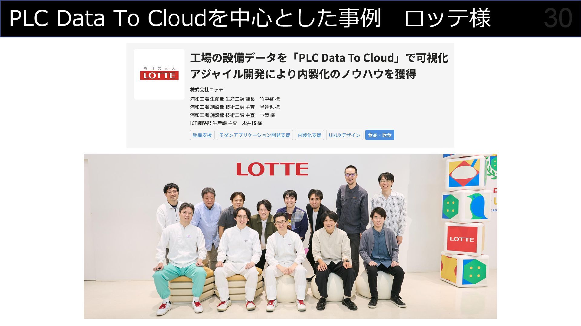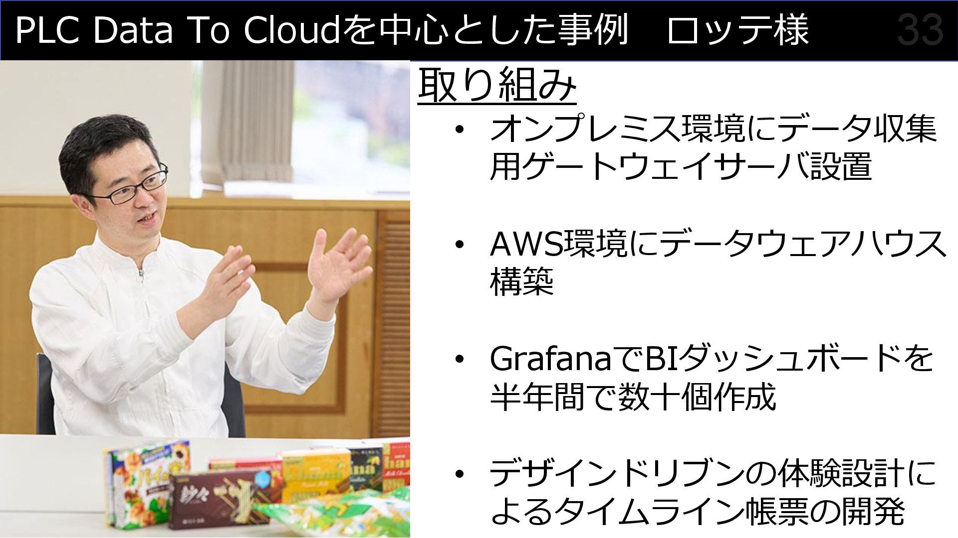 「クラウドとリアルの融合により、製造業の新しい可能性を切り拓く」をミッションに、PLC Data to Cloudを活用した工場データの可視化やアジャイル開発による内製化支援について解説。ロッテ浦和工場でのガーナチョコレート製造ラインにおける実例を交え、Grafanaダッシュボードやデータ分析AIチャットボットなど、具体的なソリューションをご紹介しています。