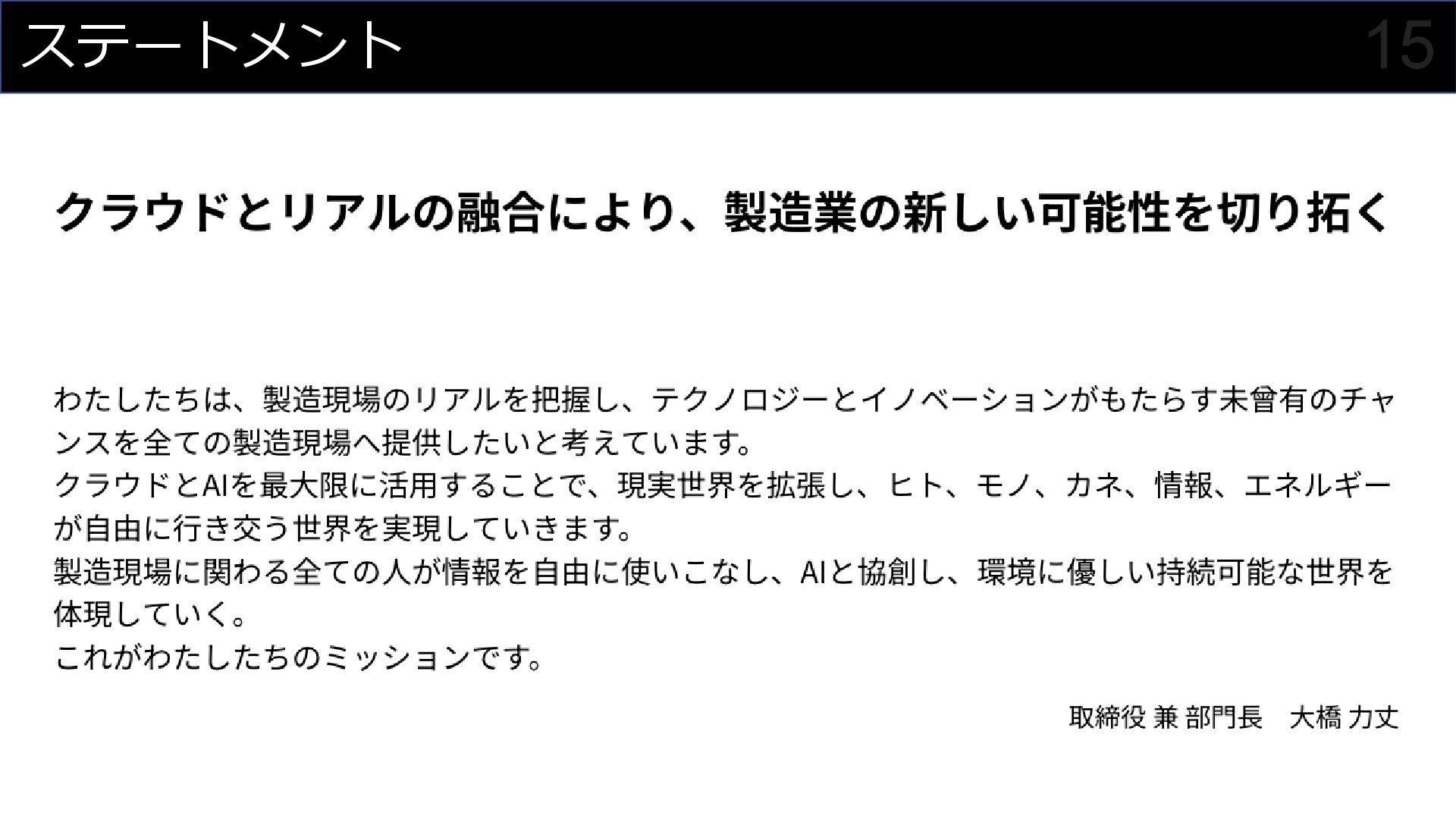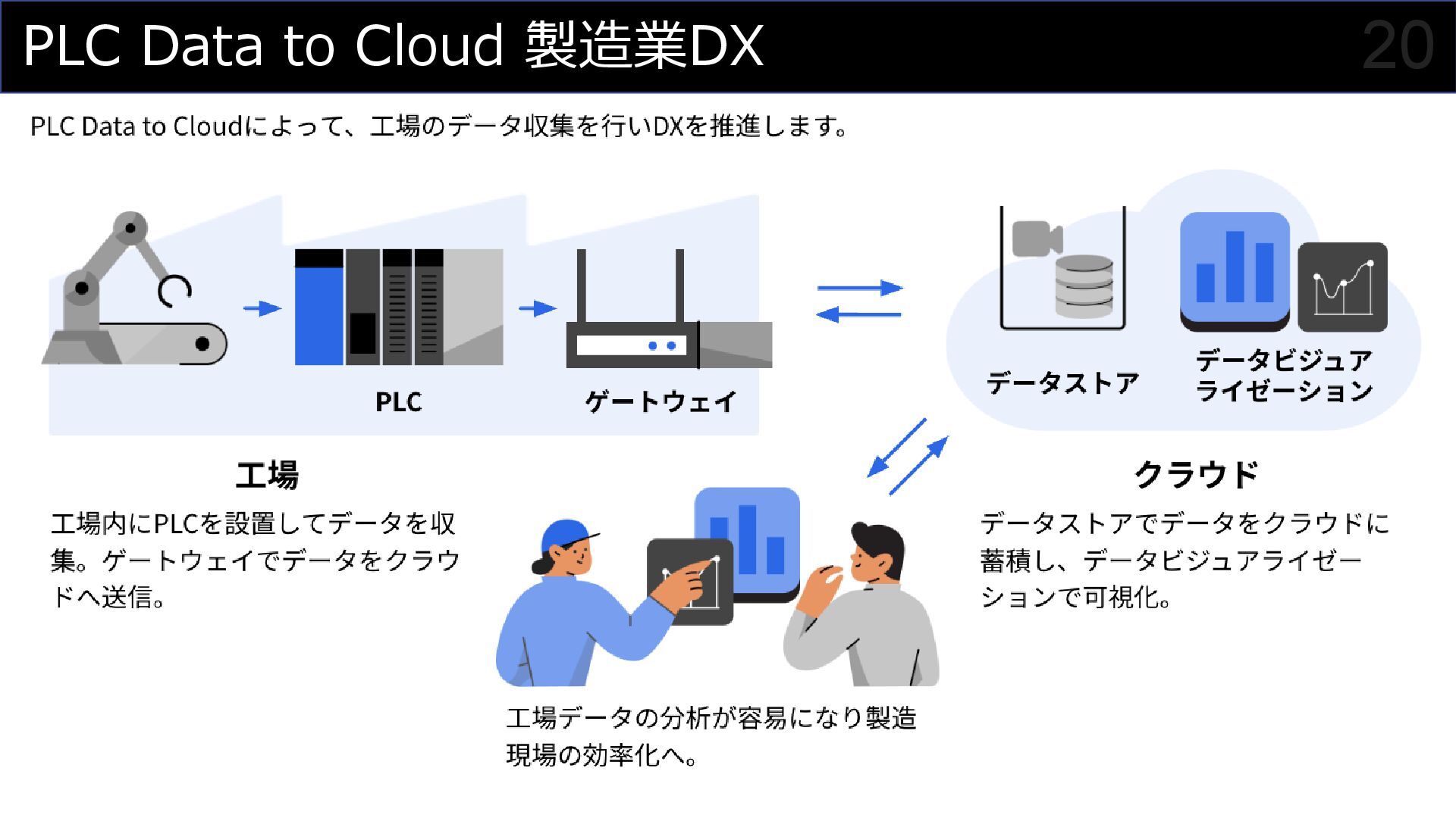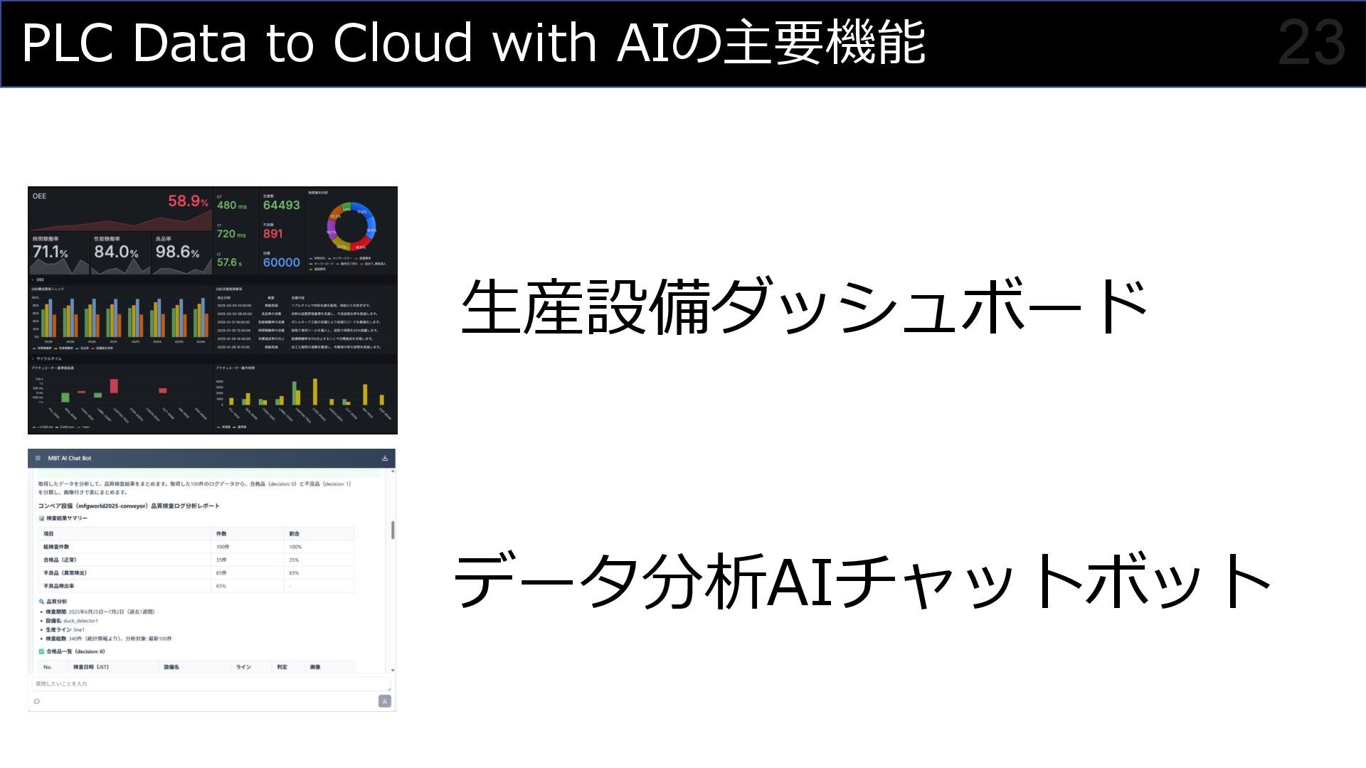 「クラウドとリアルの融合により、製造業の新しい可能性を切り拓く」をミッションに、PLC Data to Cloudを活用した工場データの可視化やアジャイル開発による内製化支援について解説。ロッテ浦和工場でのガーナチョコレート製造ラインにおける実例を交え、Grafanaダッシュボードやデータ分析AIチャットボットなど、具体的なソリューションをご紹介しています。