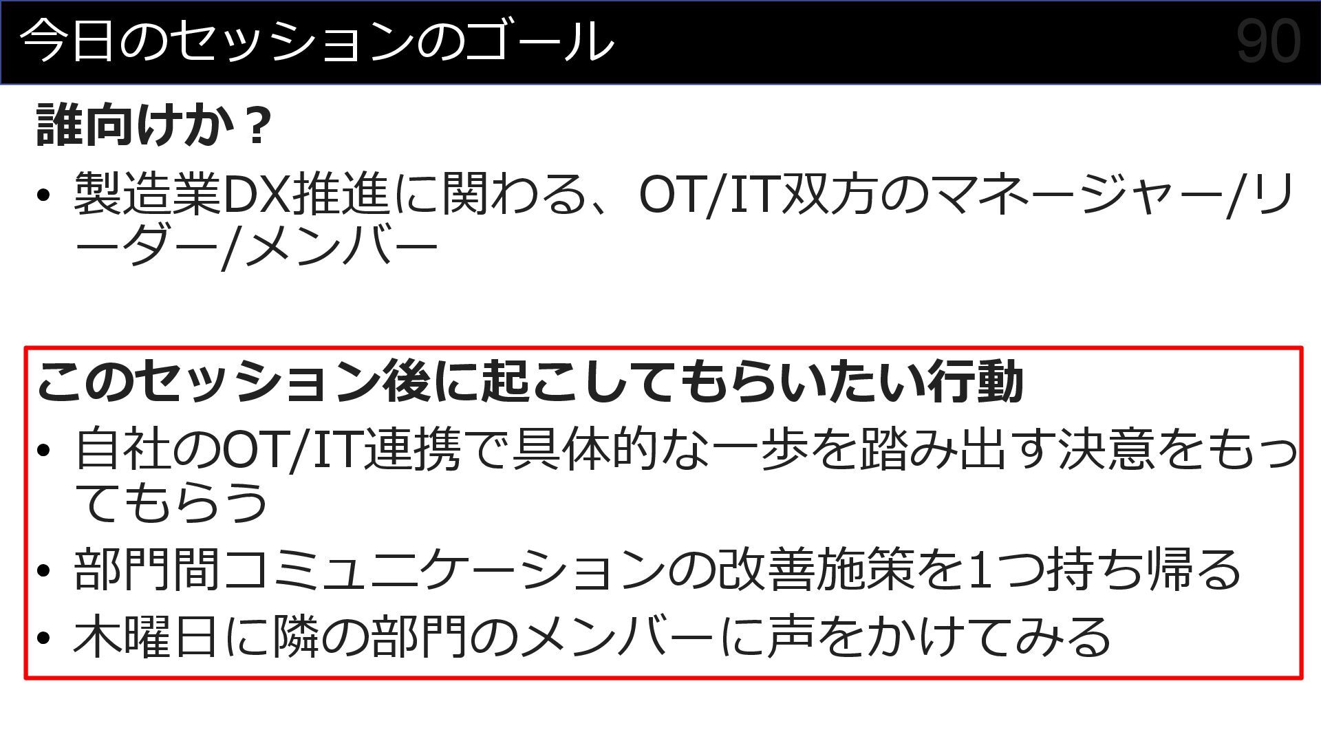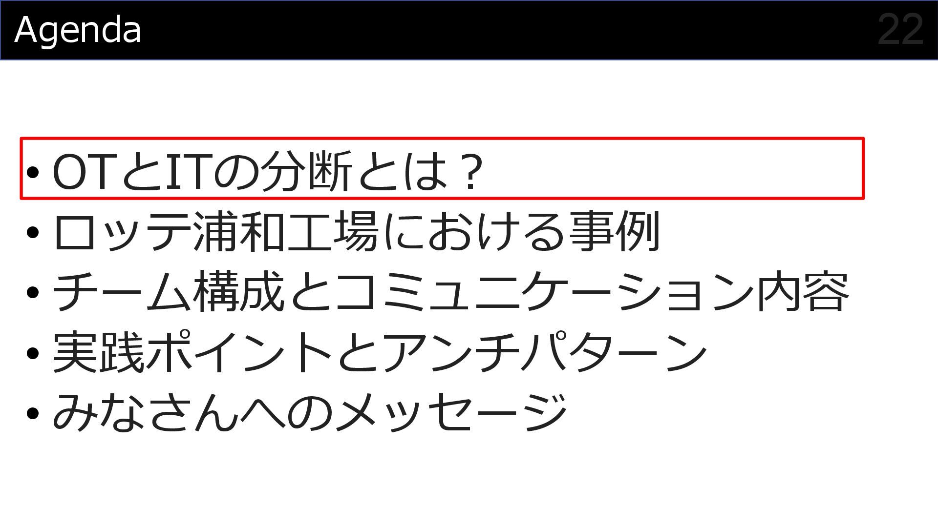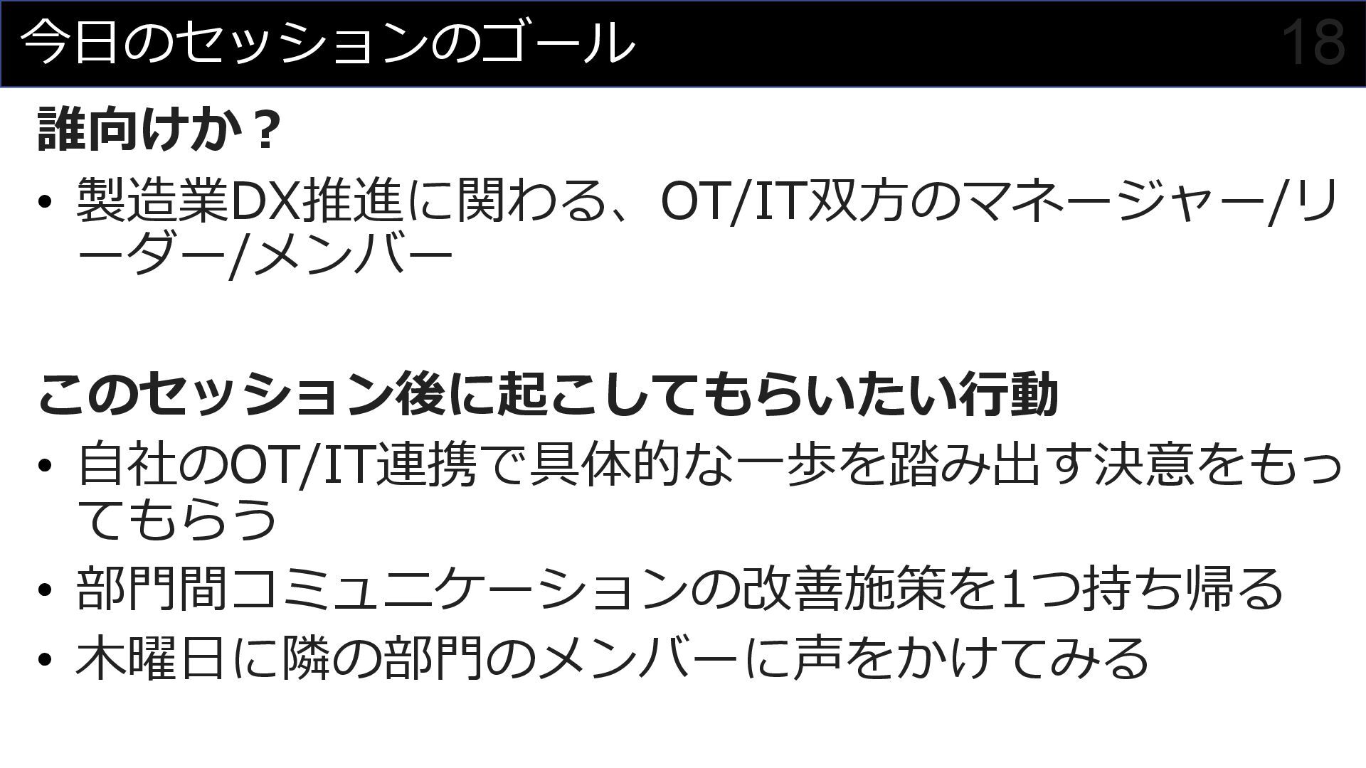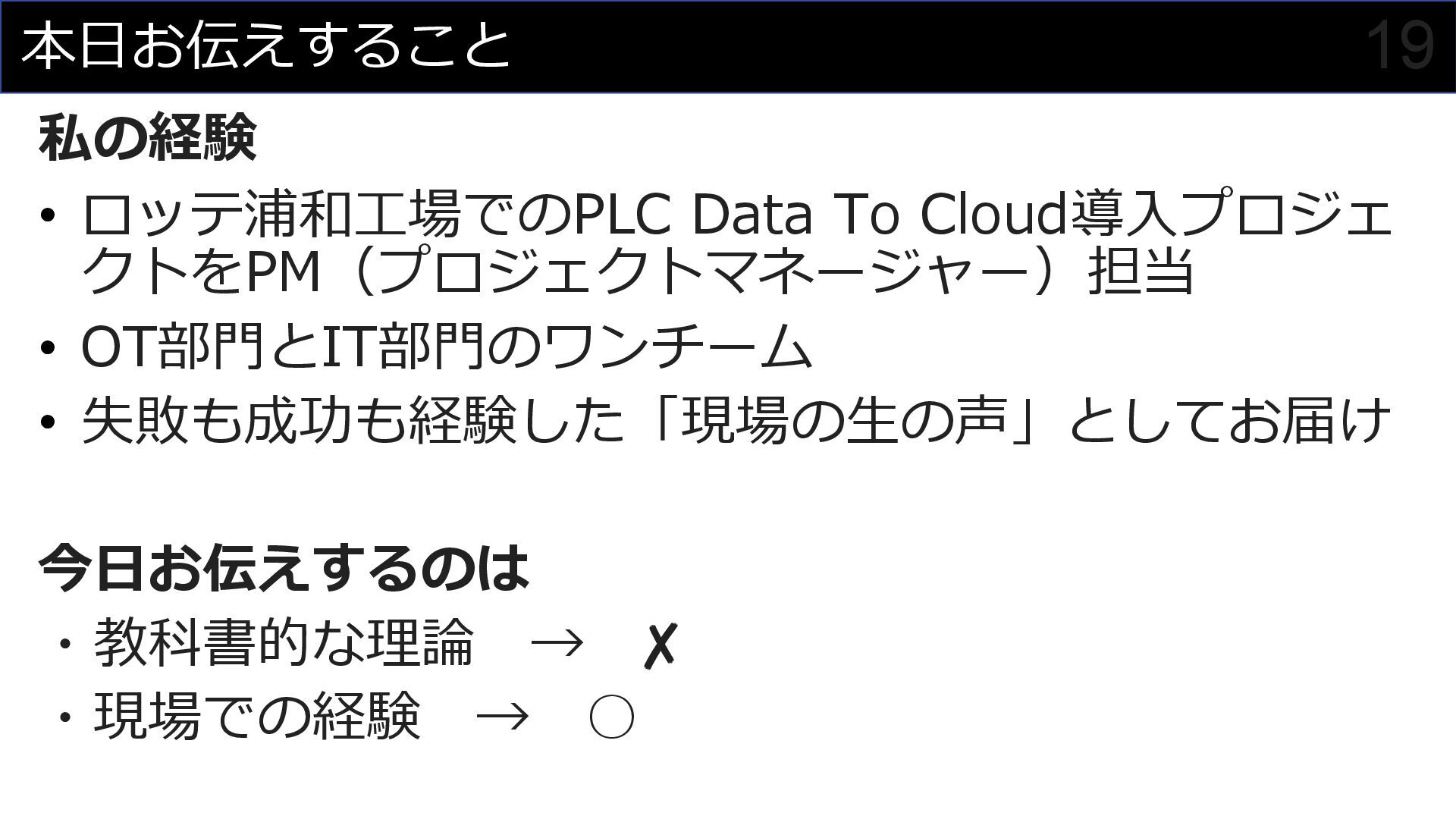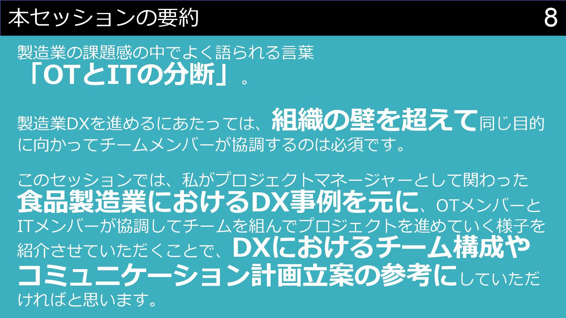 このセッションでは、私がプロジェクトマネージャーとして関わった食品製造業におけるDX事例を元に、OTメンバーとITメンバーが協調してチームを組んでプロジェクトを進めていく様子を紹介させていただくことで、DXにおけるチーム構成やコミュニケーション計画立案の参考にしていただければと思います。