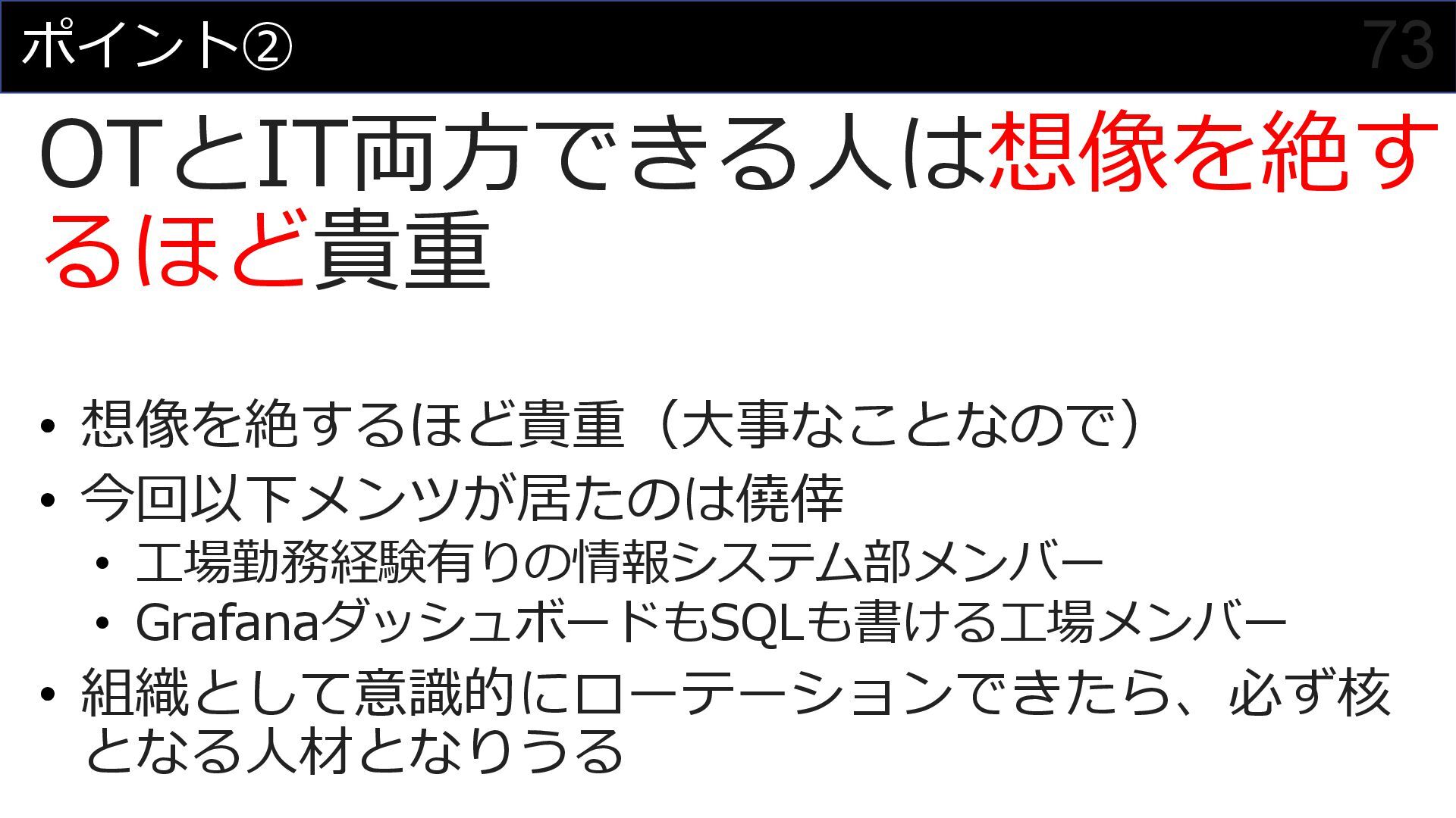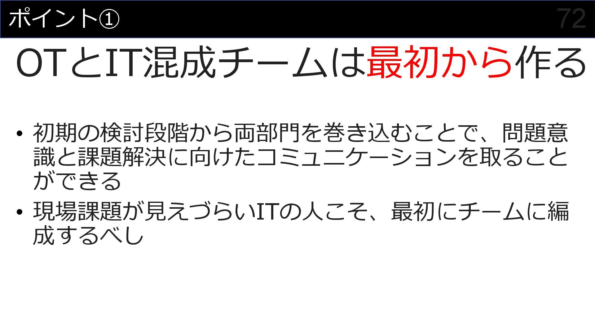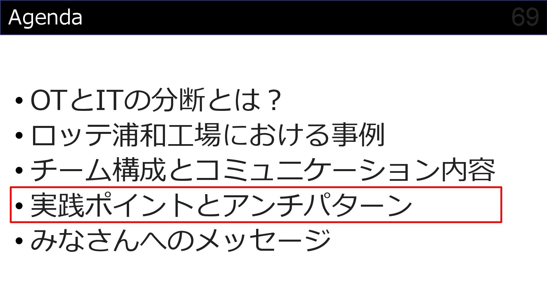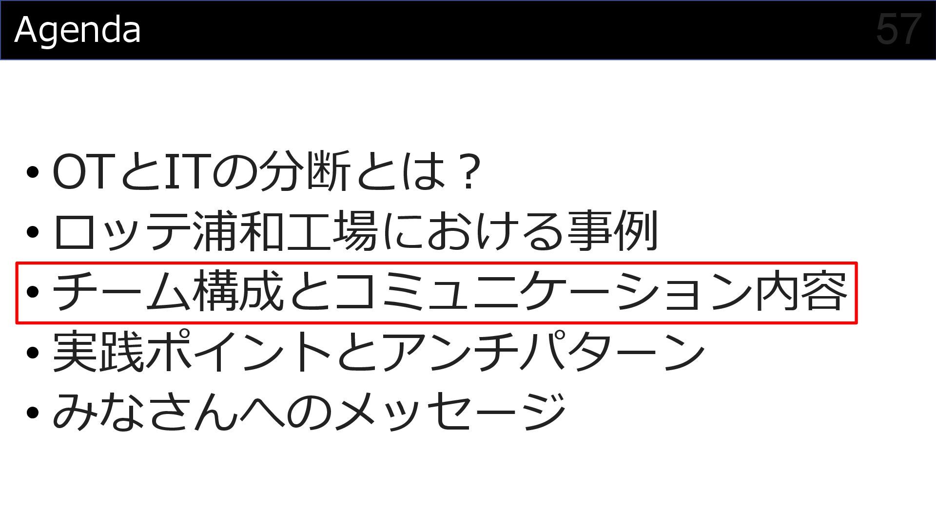 このセッションでは、私がプロジェクトマネージャーとして関わった食品製造業におけるDX事例を元に、OTメンバーとITメンバーが協調してチームを組んでプロジェクトを進めていく様子を紹介させていただくことで、DXにおけるチーム構成やコミュニケーション計画立案の参考にしていただければと思います。