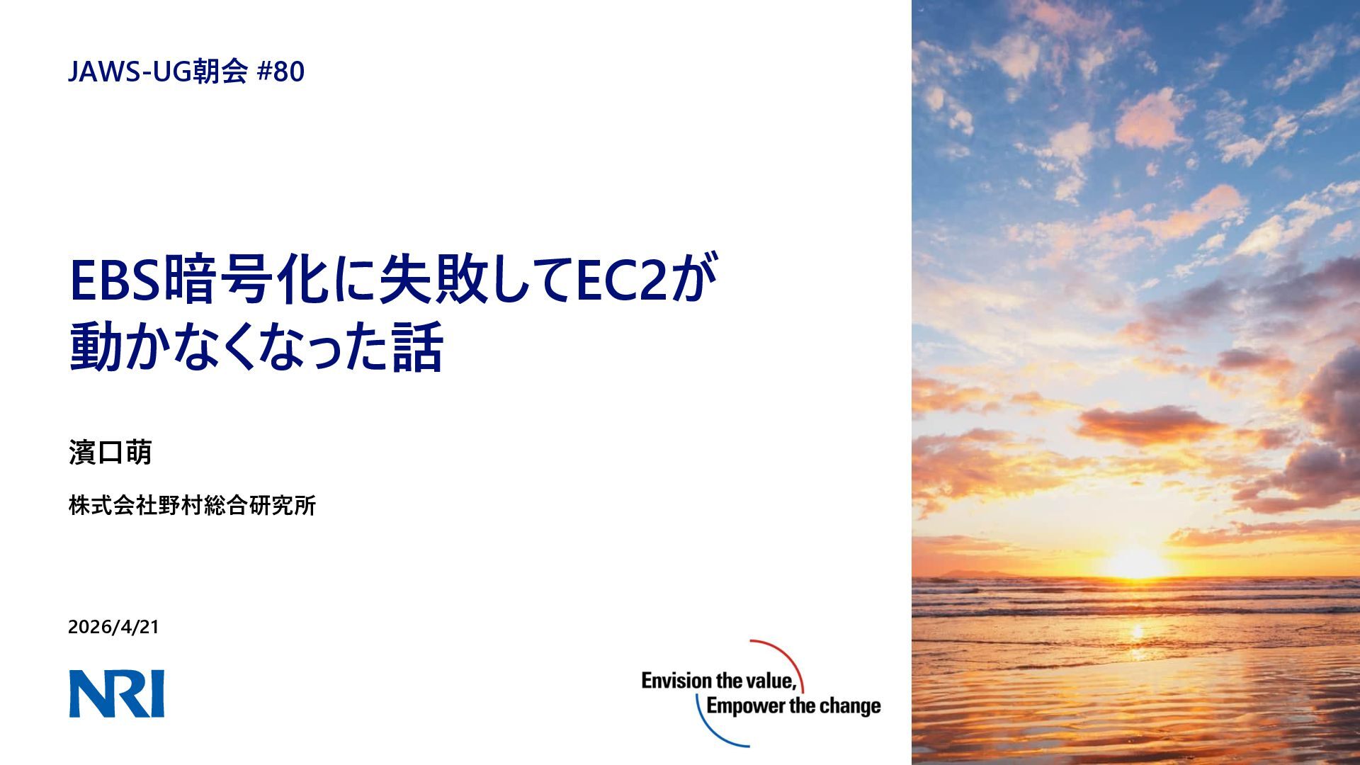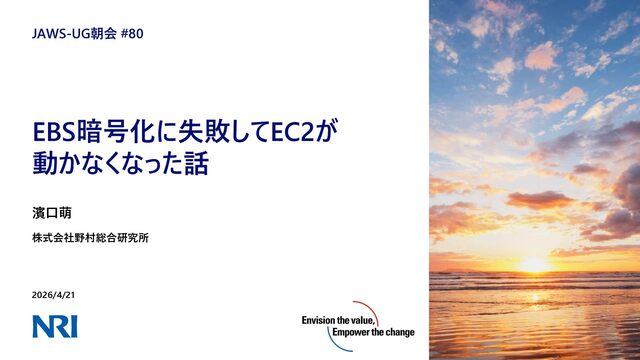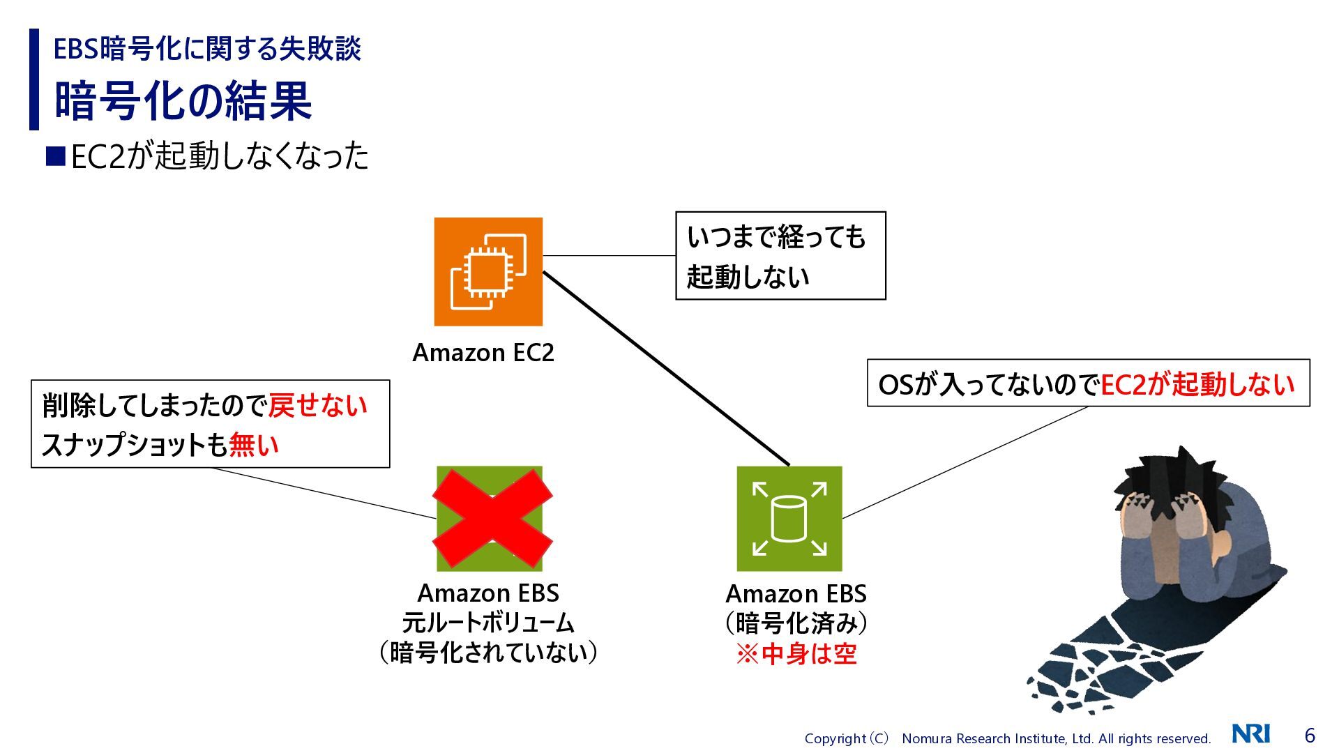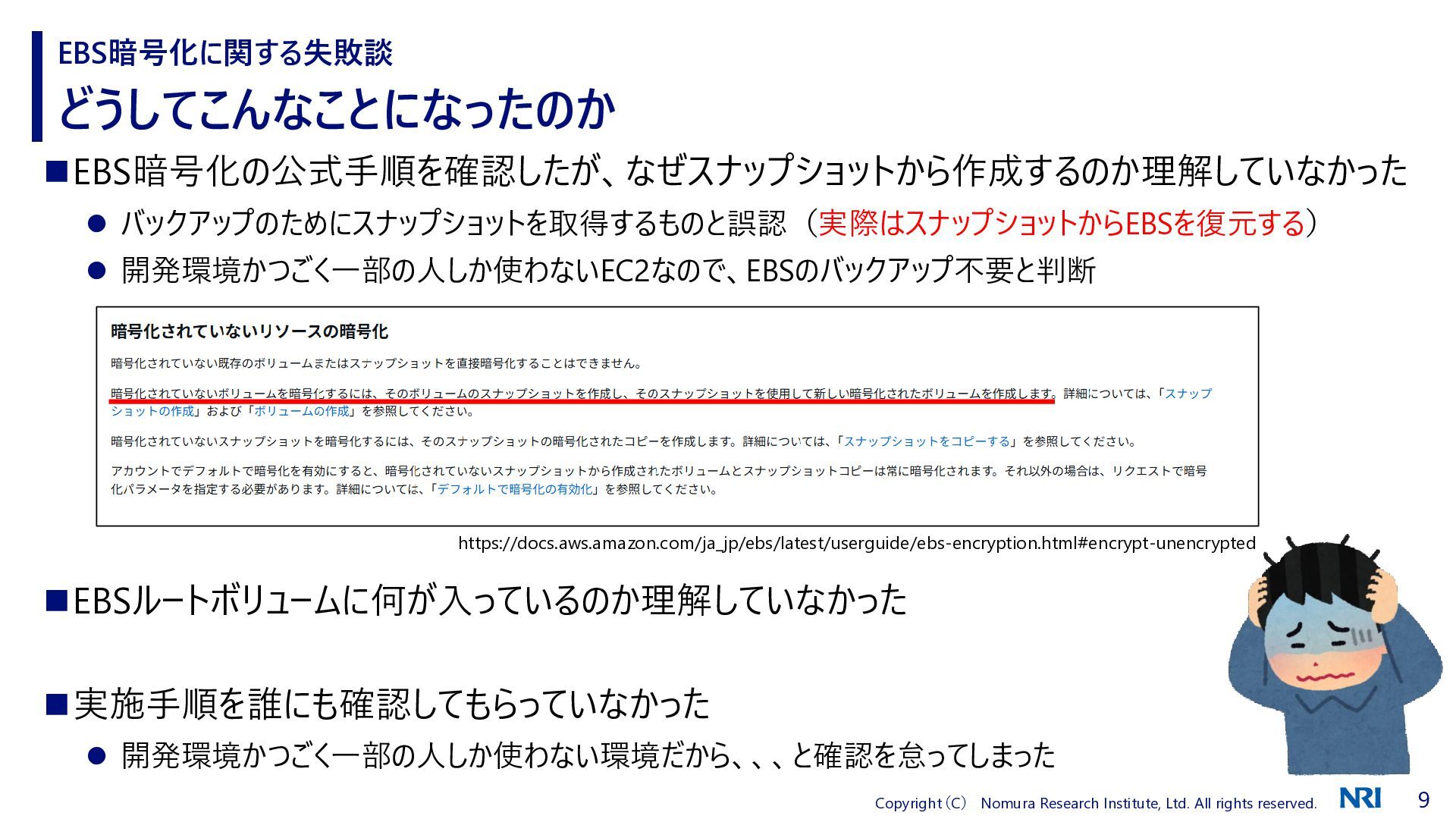 どうしてこんなことになったのか EBS暗号化に関する失敗談 ◼EBS暗号化の公式手順を確認したが、なぜスナップショットから作成するのか理解していなかった ⚫ バックアップのためにスナップショットを取得するものと誤認(実際はスナップショットからEBSを復元する) ⚫ 開発環境かつごく一部の人しか使わないEC2なので、EBSのバックアップ不要と判断 ◼EBSルートボリュームに何が入っているのか理解していなかった ◼実施手順を誰にも確認してもらっていなかった ⚫ 開発環境かつごく一部の人しか使わない環境だから、、、と確認を怠ってしまった https://docs.aws.amazon.com/ja_jp/ebs/latest/userguide/ebs-encryption.html#encrypt-unencrypted