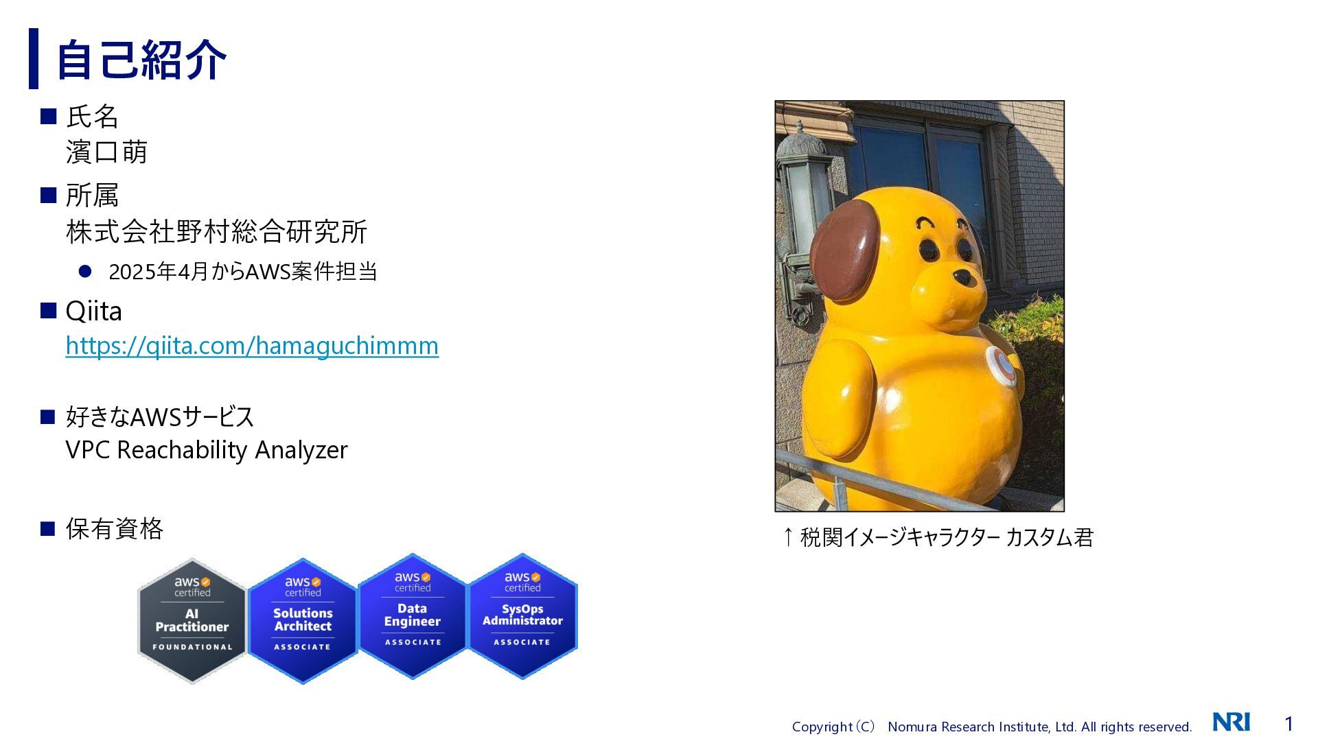 ◼ 氏名 濱口萌 ◼ 所属 株式会社野村総合研究所 ⚫ 2025年4月からAWS案件担当 ◼ Qiita https://qiita.com/hamaguchimmm ◼ 好きなAWSサービス VPC Reachability Analyzer ◼ 保有資格 自己紹介 ↑税関イメージキャラクター カスタム君
