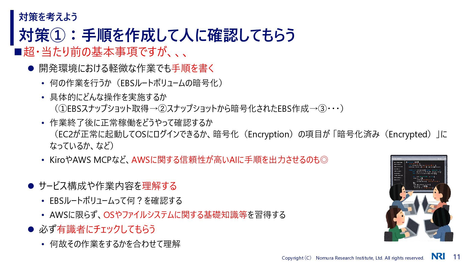 対策①:手順を作成して人に確認してもらう 対策を考えよう ◼超・当たり前の基本事項ですが、、、 ⚫ 開発環境における軽微な作業でも手順を書く • 何の作業を行うか(EBSルートボリュームの暗号化) • 具体的にどんな操作を実施するか (①EBSスナップショット取得→②スナップショットから暗号化されたEBS作成→③・・・) • 作業終了後に正常稼働をどうやって確認するか (EC2が正常に起動してOSにログインできるか、暗号化(Encryption)の項目が 「暗号化済み(Encrypted)」に なっているか、など) • KiroやAWS MCPなど、AWSに関する信頼性が高いAIに手順を出力させるのも◎ ⚫ サービス構成や作業内容を理解する • EBSルートボリュームって何?を確認する • AWSに限らず、OSやファイルシステムに関する基礎知識等を習得する ⚫ 必ず有識者にチェックしてもらう • 何故その作業をするかを合わせて理解