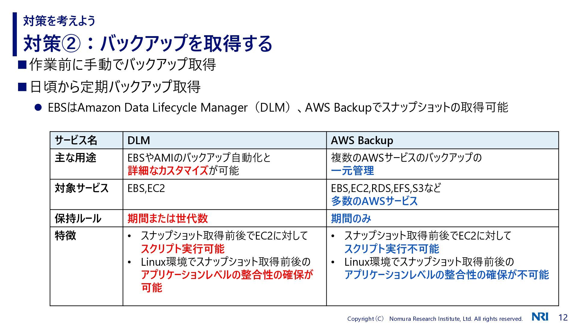 対策②:バックアップを取得する 対策を考えよう ◼作業前に手動でバックアップ取得 ◼日頃から定期バックアップ取得 ⚫ EBSはAmazon Data Lifecycle Manager(DLM)、AWS Backupでスナップショットの取得可能 サービス名 DLM AWS Backup 主な用途 EBSやAMIのバックアップ自動化と 詳細なカスタマイズが可能 複数のAWSサービスのバックアップの 一元管理 対象サービス EBS,EC2 EBS,EC2,RDS,EFS,S3など 多数のAWSサービス 保持ルール 期間または世代数 期間のみ 特徴 • スナップショット取得前後でEC2に対して スクリプト実行可能 • Linux環境でスナップショット取得前後の アプリケーションレベルの整合性の確保が 可能 • スナップショット取得前後でEC2に対して スクリプト実行不可能 • Linux環境でスナップショット取得前後の アプリケーションレベルの整合性の確保が不可能