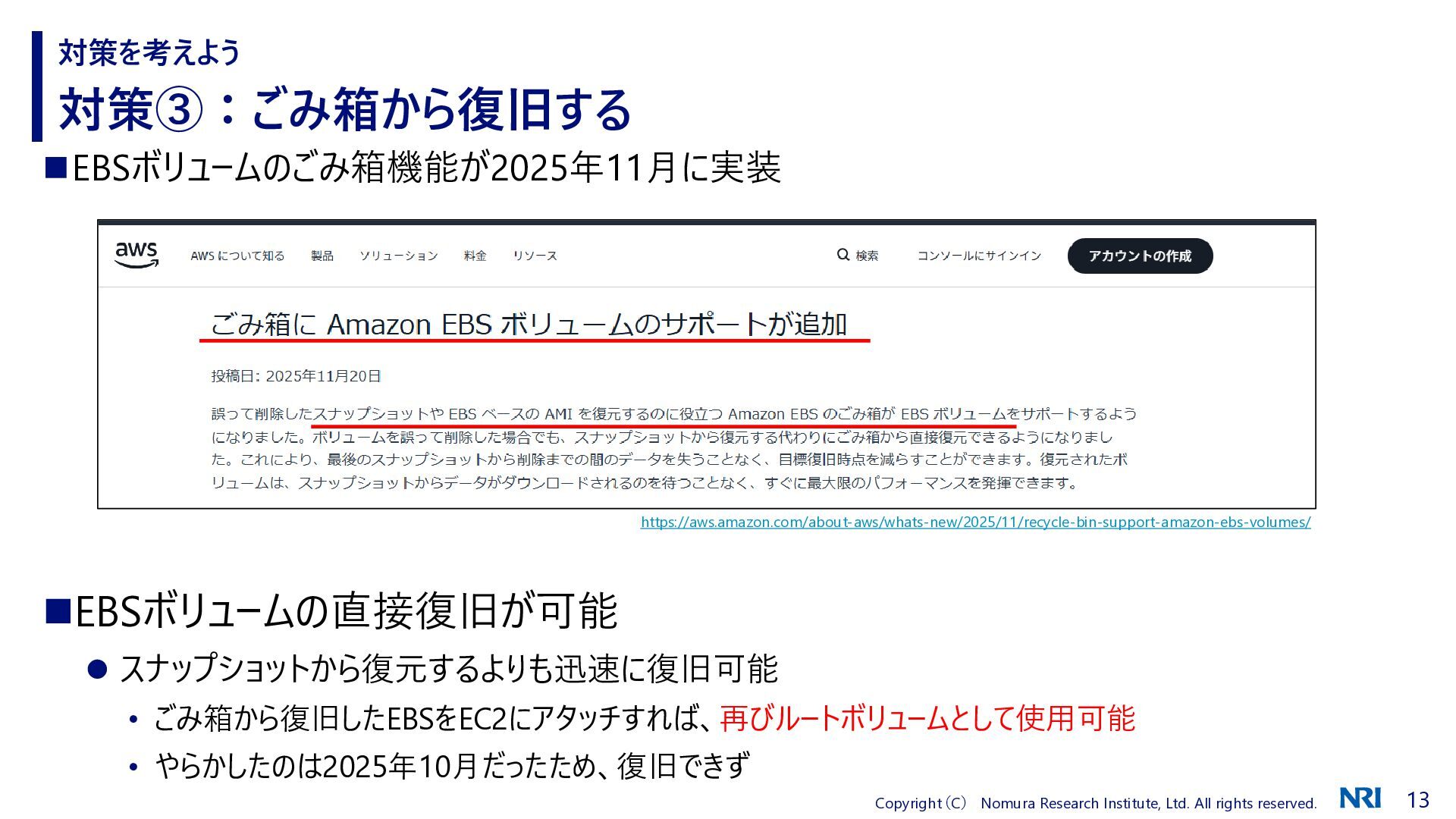 対策③:ごみ箱から復旧する 対策を考えよう ◼EBSボリュームのごみ箱機能が2025年11月に実装 ◼EBSボリュームの直接復旧が可能 ⚫ スナップショットから復元するよりも迅速に復旧可能 • ごみ箱から復旧したEBSをEC2にアタッチすれば、再びルートボリュームとして使用可能 • やらかしたのは2025年10月だったため、復旧できず https://aws.amazon.com/about-aws/whats-new/2025/11/recycle-bin-support-amazon-ebs-volumes/