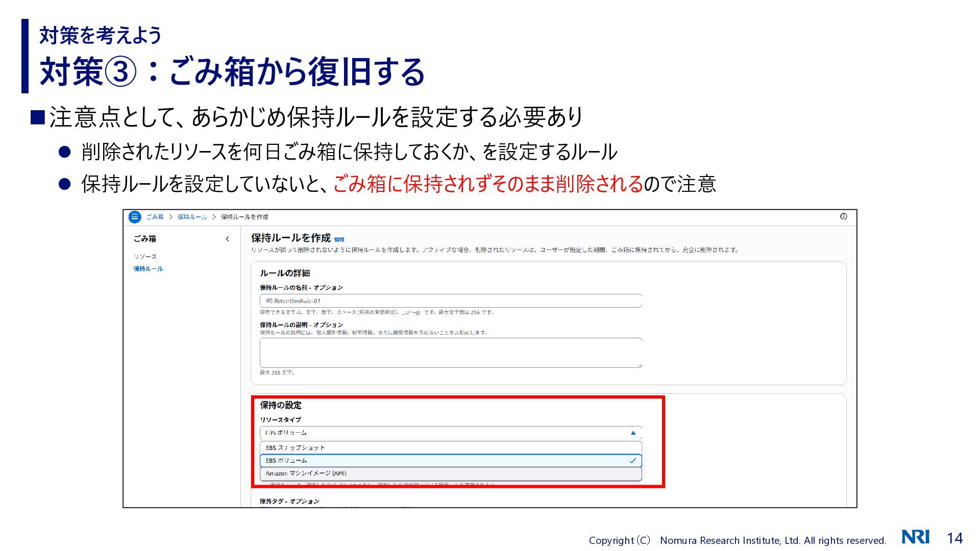 対策③:ごみ箱から復旧する 対策を考えよう ◼注意点として、あらかじめ保持ルールを設定する必要あり ⚫ 削除されたリソースを何日ごみ箱に保持しておくか、を設定するルール ⚫ 保持ルールを設定していないと、ごみ箱に保持されずそのまま削除されるので注意