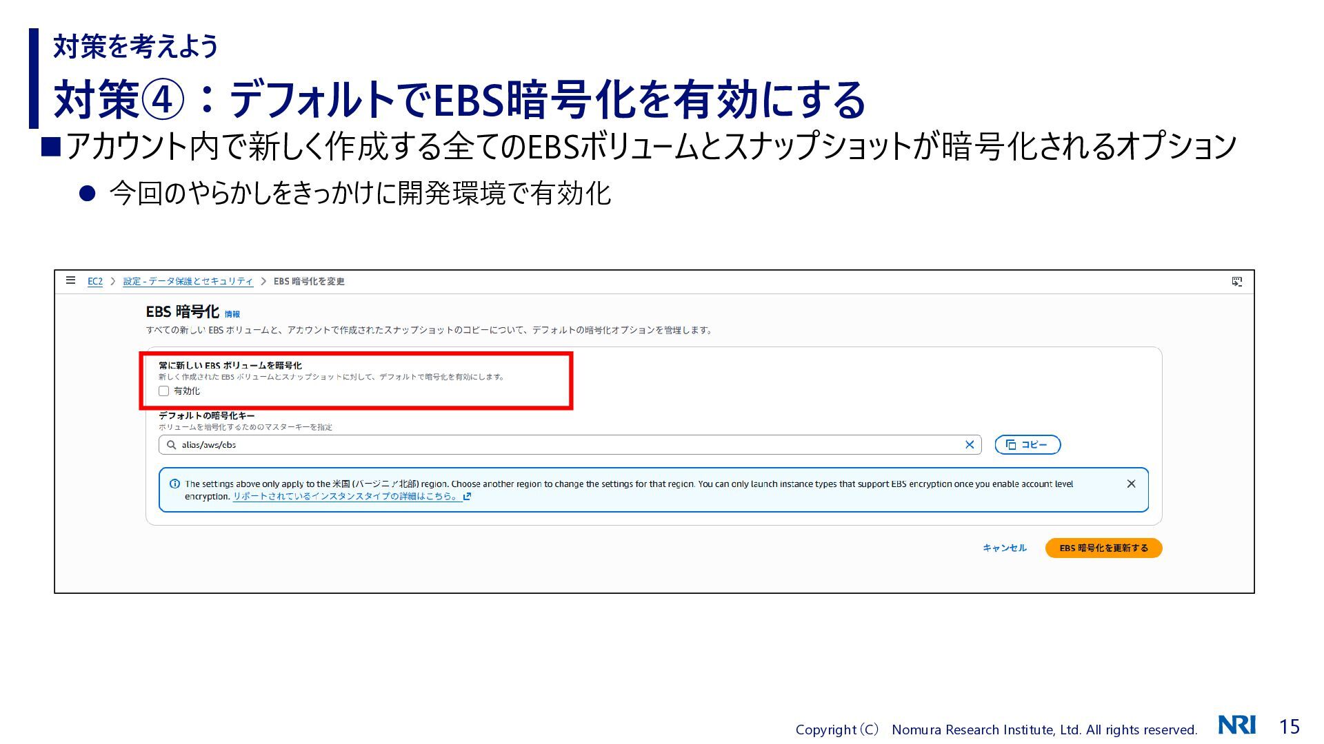 対策④:デフォルトでEBS暗号化を有効にする 対策を考えよう ◼アカウント内で新しく作成する全てのEBSボリュームとスナップショットが暗号化されるオプション ⚫ 今回のやらかしをきっかけに開発環境で有効化