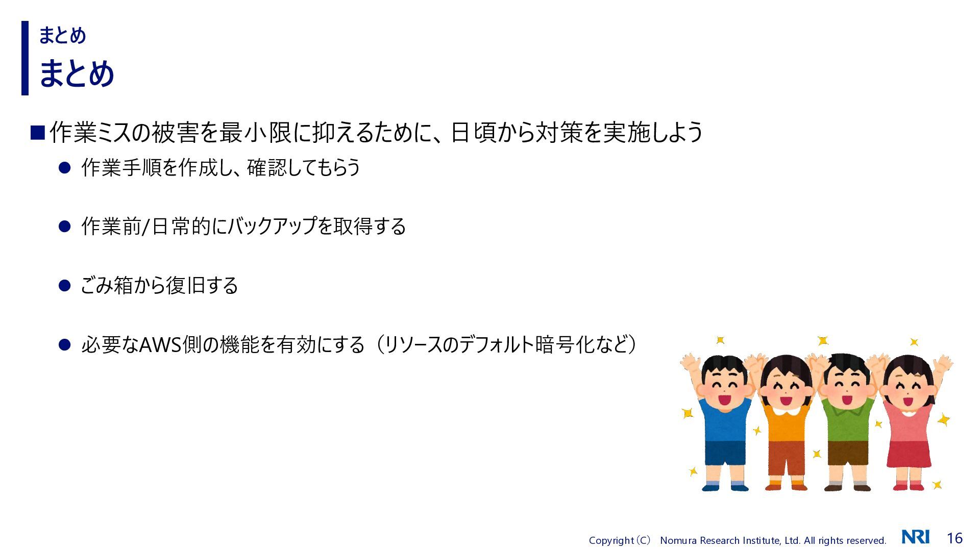 まとめ まとめ ◼作業ミスの被害を最小限に抑えるために、日頃から対策を実施しよう ⚫ 作業手順を作成し、確認してもらう ⚫ 作業前/日常的にバックアップを取得する ⚫ ごみ箱から復旧する ⚫ 必要なAWS側の機能を有効にする(リソースのデフォルト暗号化など)