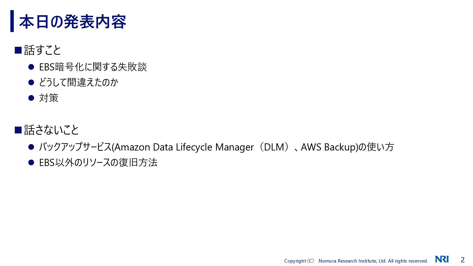 ◼話すこと ⚫ EBS暗号化に関する失敗談 ⚫ どうして間違えたのか ⚫ 対策 ◼話さないこと ⚫ バックアップサービス(Amazon Data Lifecycle Manager(DLM)、AWS Backup)の使い方 ⚫ EBS以外のリソースの復旧方法 本日の発表内容