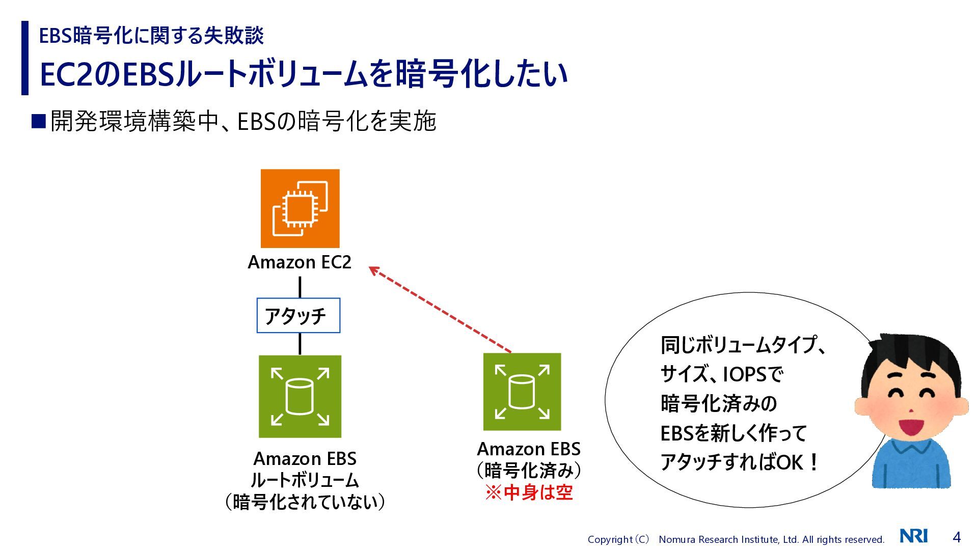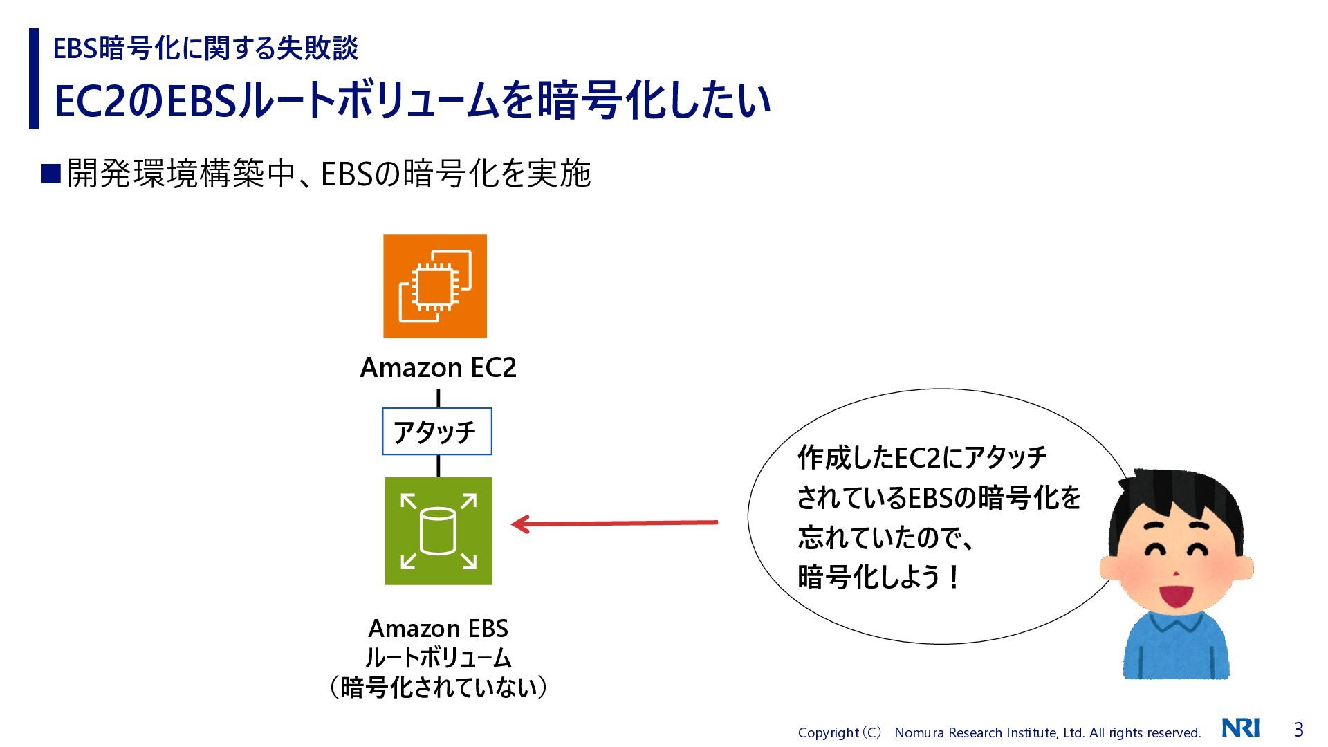 EC2のEBSルートボリュームを暗号化したい EBS暗号化に関する失敗談 Amazon EBS ルートボリューム (暗号化されていない) アタッチ Amazon EC2 Amazon EBS (暗号化済み) ※中身は空 同じボリュームタイプ、 サイズ、IOPSで 暗号化済みの EBSを新しく作って アタッチすればOK! ◼開発環境構築中、EBSの暗号化を実施