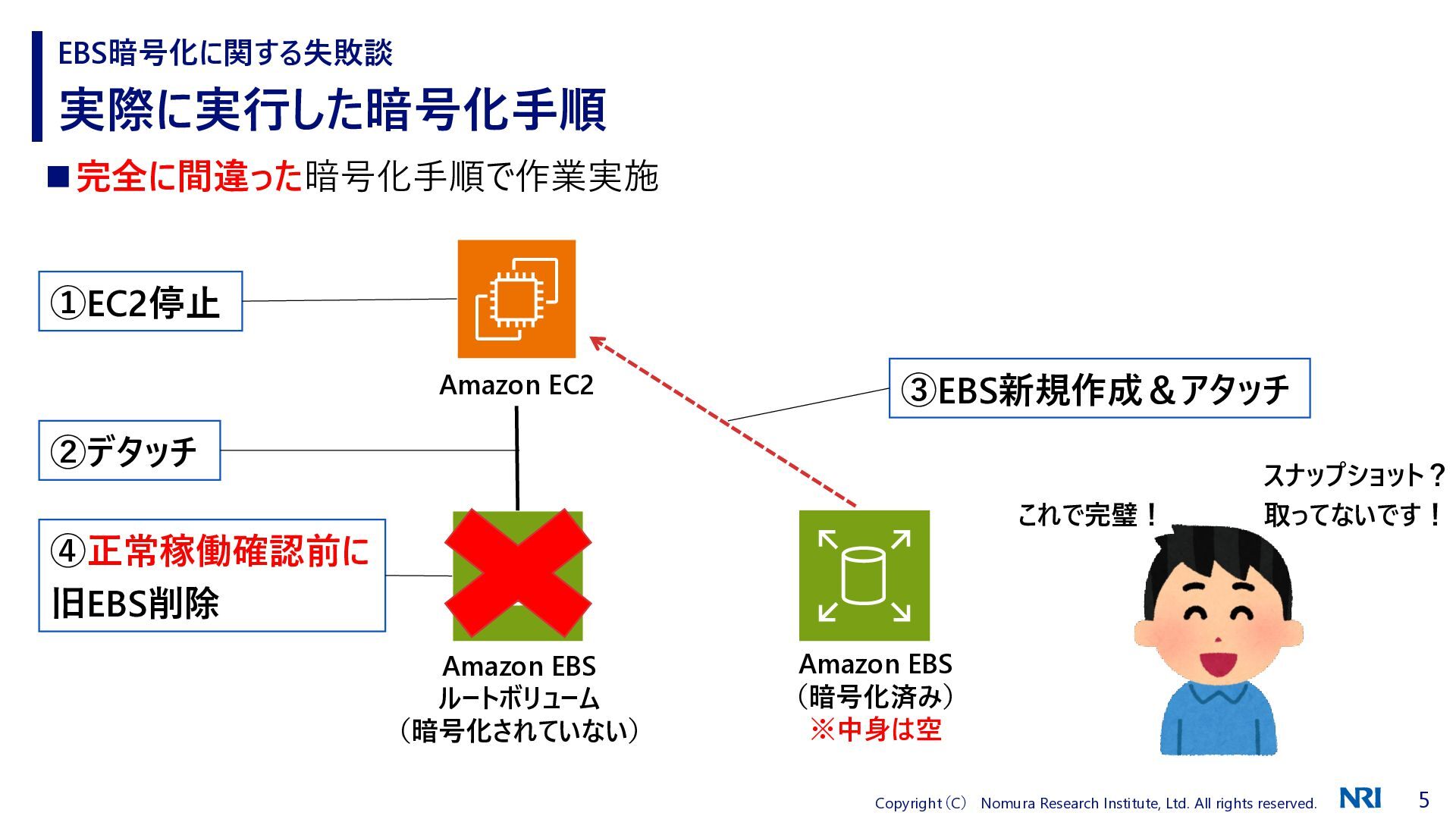 ◼完全に間違った暗号化手順で作業実施 実際に実行した暗号化手順 EBS暗号化に関する失敗談 Amazon EBS ルートボリューム (暗号化されていない) Amazon EC2 Amazon EBS (暗号化済み) ※中身は空 ②デタッチ ③EBS新規作成&アタッチ ④正常稼働確認前に 旧EBS削除 これで完璧! スナップショット? 取ってないです! ①EC2停止