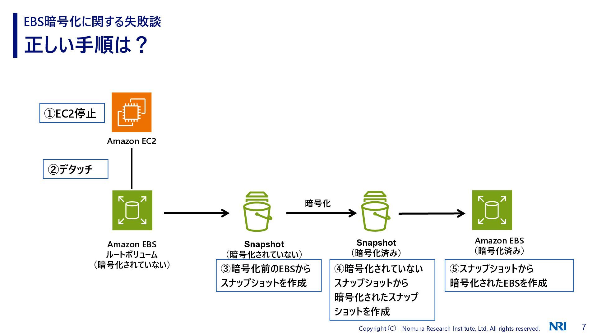 正しい手順は? EBS暗号化に関する失敗談 Amazon EBS ルートボリューム (暗号化されていない) Amazon EC2 Amazon EBS (暗号化済み) Snapshot (暗号化されていない) ③暗号化前のEBSから スナップショットを作成 ⑤スナップショットから 暗号化されたEBSを作成 ②デタッチ ①EC2停止 Snapshot (暗号化済み) ④暗号化されていない スナップショットから 暗号化されたスナップ ショットを作成 暗号化