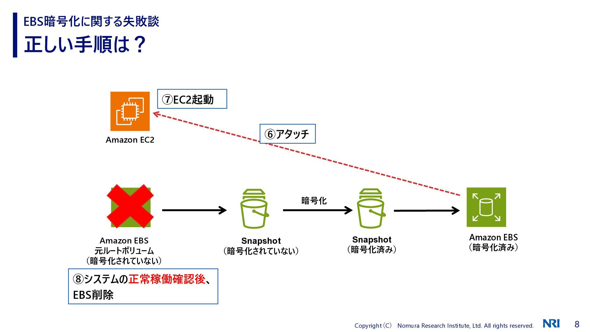 正しい手順は? EBS暗号化に関する失敗談 Amazon EBS 元ルートボリューム (暗号化されていない) Amazon EC2 Amazon EBS (暗号化済み) Snapshot (暗号化されていない) Snapshot (暗号化済み) 暗号化 ⑥アタッチ ⑧システムの正常稼働確認後、 EBS削除 ⑦EC2起動