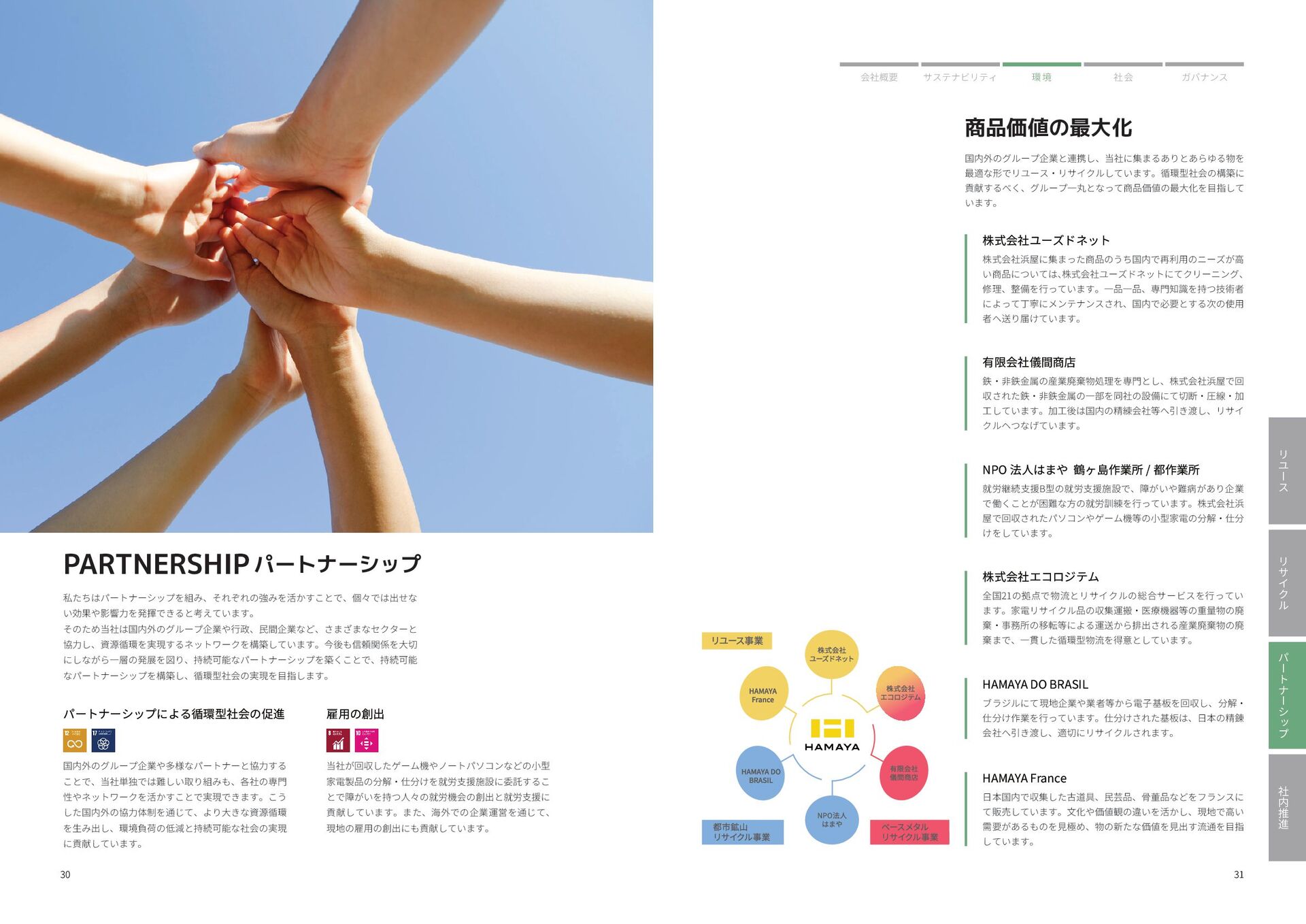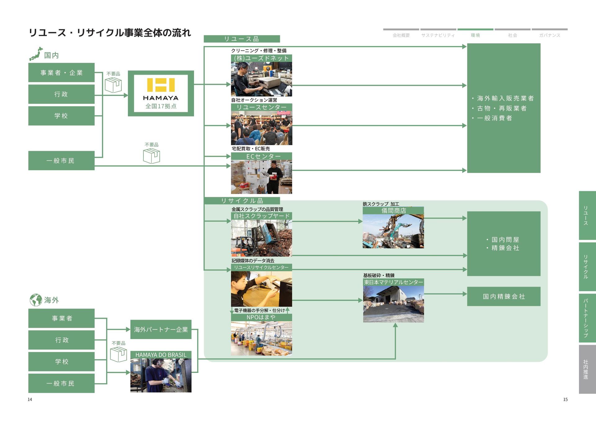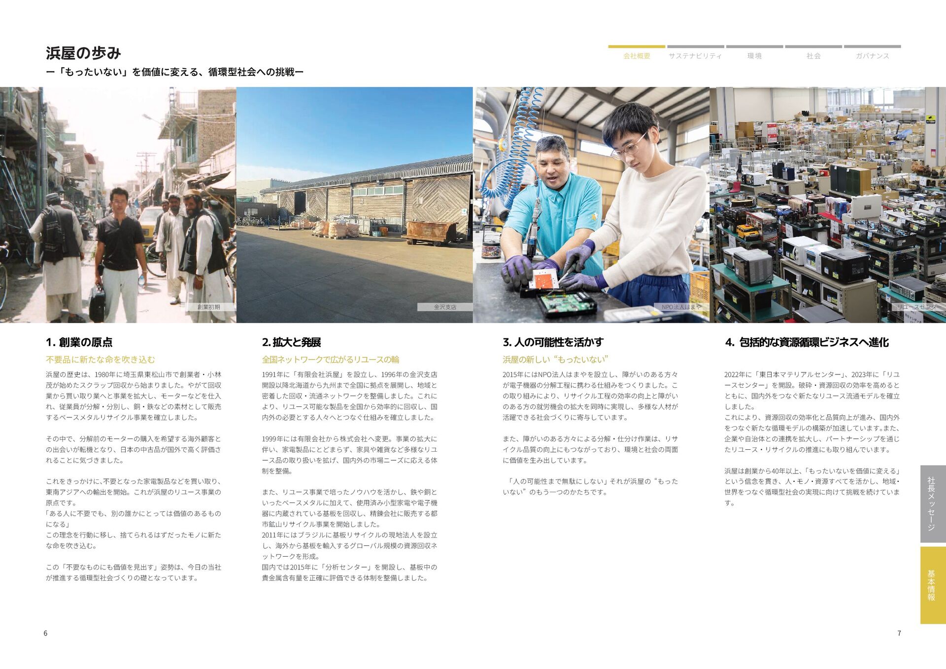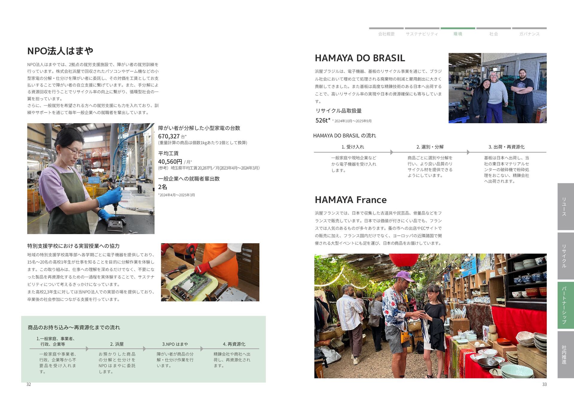 2. 選別・分解 商品ごとに選別や分解を 行い、より良い品質のリ サイクル材を提供できる ようにしています。 基板は日本へ出荷し、当 社の東日本マテリアルセ ンターの破砕機で粉砕処 理をおこない、精錬会社 へ出荷されます。 3. 出荷・再資源化 リサイクル品取扱量 526t* * 2024年10月~2025年9月 NPO法人はまや NPO法人はまやでは、2拠点の就労支援施設で、障がい者の就労訓練を 行っています。株式会社浜屋で回収されたパソコンやゲーム機などの小 型家電の分解・仕分けを障がい者に委託し、その対価を工賃としてお支 払いすることで障がい者の自立支援に繋げています。また、手分解によ る資源回収を行うことでリサイクル率の向上に繋がり、循環型社会の一 翼を担っています。 さらに、一般就労を希望される方への就労支援にも力を入れており、訓 練やサポートを通じて毎年一般企業への就職者を輩出しています。 特別支援学校における実習授業への協力 地域の特別支援学校高等部へ各学期ごとに電子機器を提供しており、 15名~20名の高校1年生が仕事を知ることを目的に分解作業を体験し ます。この取り組みは、仕事への理解を深めるだけでなく、不要にな った製品を再資源化するための一過程を実体験することで、サステナ ビリティについて考えるきっかけになっています。 また高校2,3年生に対しては当NPO法人での実習の場を提供しており、 卒業後の社会参加につながる支援を行っています。 一般企業への就職者輩出数 (参考)埼玉県平均工賃 20,287円/月(2023年4月~2024年3月) / 月* 40,560円 平均工賃 (重量計算の商品は個数1㎏あたり1個として換算) 台* 670,327 障がい者が分解した小型家電の台数 商品のお持ち込み~再資源化までの流れ 一般家庭や事業者、 行政、企業等から不 要品を受け入れま す。 2. 浜屋 お預かりした商品 の分解と仕分けを NPO はまやに委託 します。 3.NPO はまや 障がい者が商品の分 解・仕分け作業を行 います。 精錬会社や商社へ出 荷し、再資源化され ます。 4. 再資源化 1.一般家庭、事業者、 行政、企業等 *2024年4月~2025年3月 HAMAYA DO BRASIL 浜屋ブラジルは、電子機器、基板のリサイクル事業を通じて、ブラジ ル社会において埋め立て処理される廃棄物の削減と雇用創出に大きく 貢献してきました。また基板は高度な精錬技術のある日本へ出荷する ことで、高いリサイクル率の実現や日本の資源確保にも寄与していま す。 HAMAYA France 浜屋フランスでは、日本で収集した古道具や民芸品、骨董品などをフ ランスで販売しています。日本では価値が付きにくい品でも、フラン スでは人気のあるものが多々あります。蚤の市への出店やECサイトで の販売に加え、フランス国内だけでなく、ヨーロッパの近隣諸国で開 催される大型イベントにも足を運び、日本の商品をお届けしています。 32 33 リ サ イ ク ル リ ユ ー ス パ ー ト ナ ー シ ッ プ 社 内 推 進 会社概要 サステナビリティ 環境 社会 ガバナンス