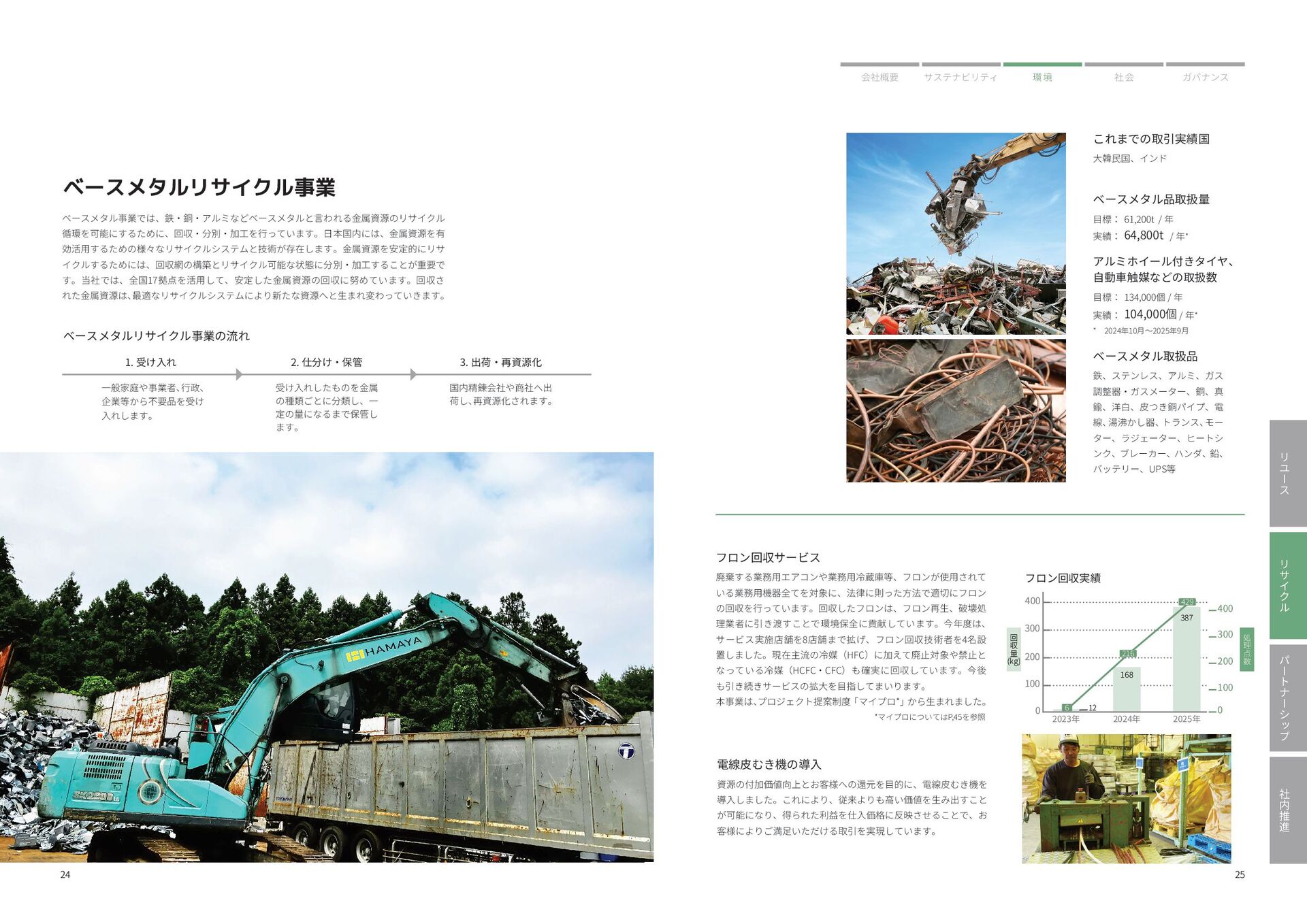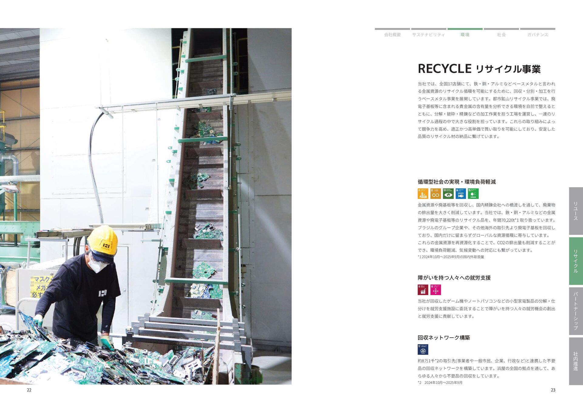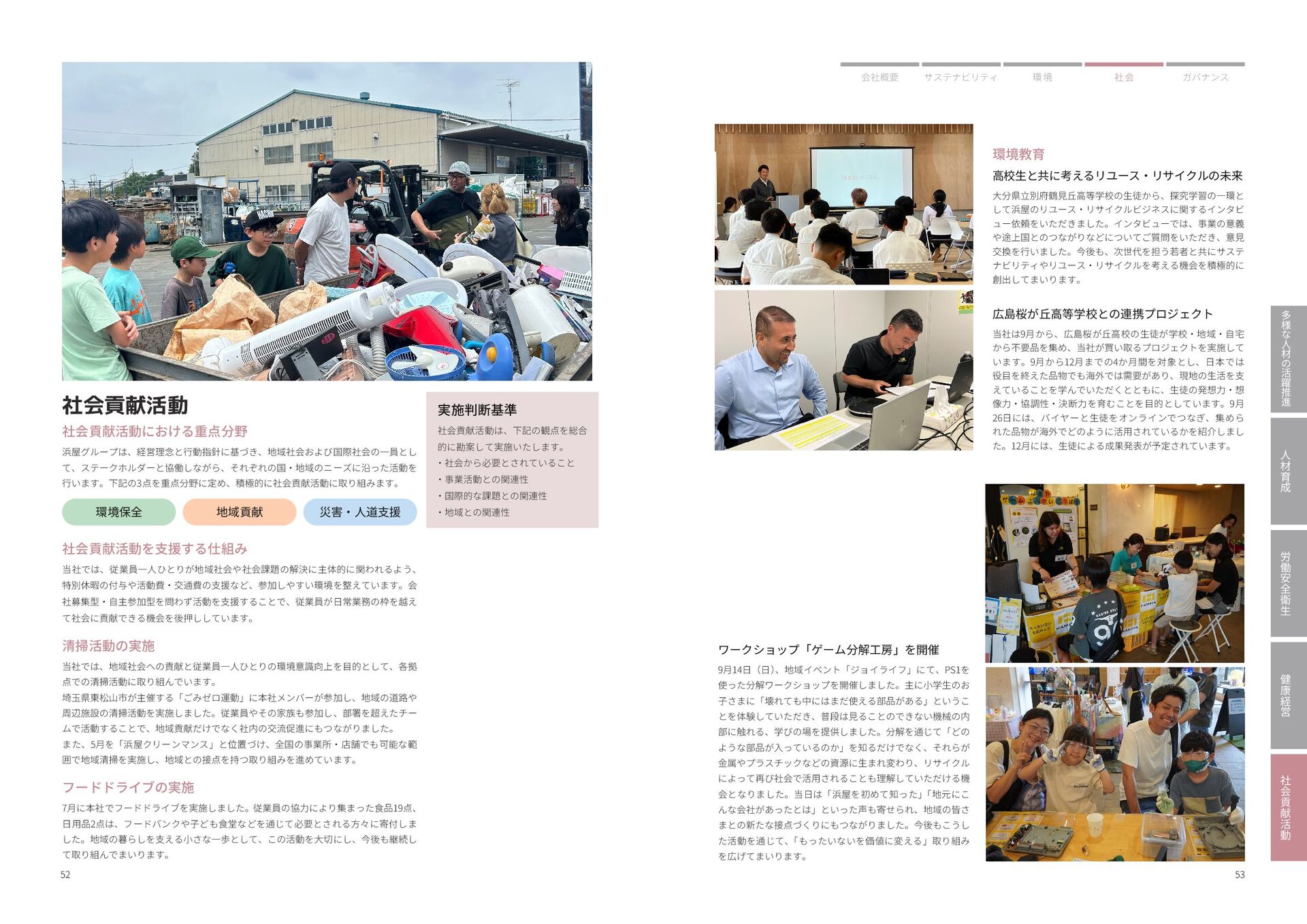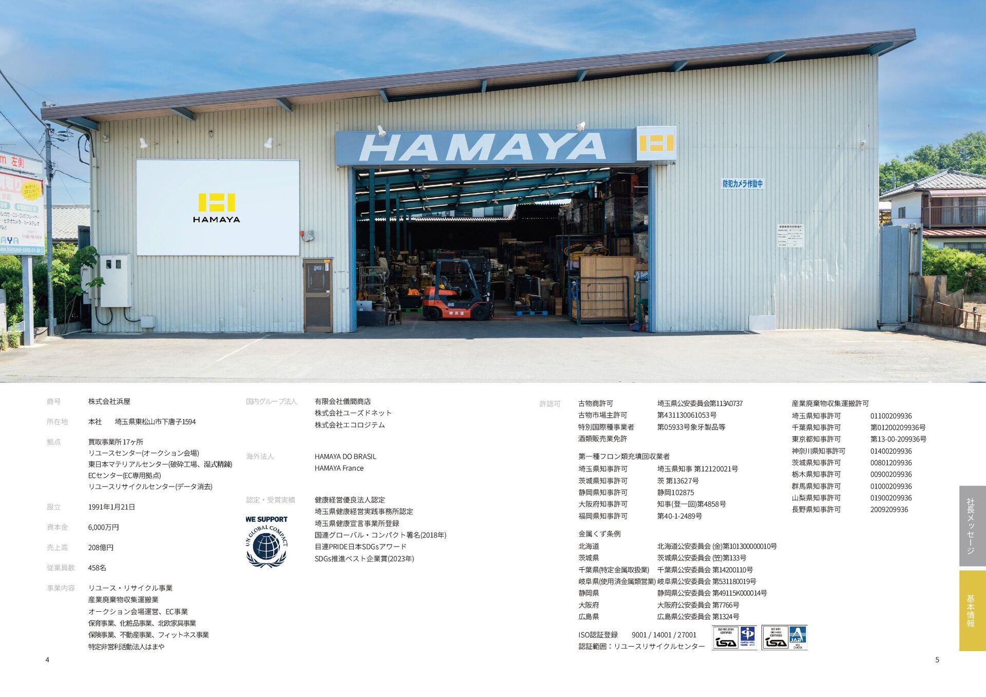 2. 選別・分解 商品ごとに選別や分解を 行い、より良い品質のリ サイクル材を提供できる ようにしています。 基板は日本へ出荷し、当 社の東日本マテリアルセ ンターの破砕機で粉砕処 理をおこない、精錬会社 へ出荷されます。 3. 出荷・再資源化 リサイクル品取扱量 526t* * 2024年10月~2025年9月 NPO法人はまや NPO法人はまやでは、2拠点の就労支援施設で、障がい者の就労訓練を 行っています。株式会社浜屋で回収されたパソコンやゲーム機などの小 型家電の分解・仕分けを障がい者に委託し、その対価を工賃としてお支 払いすることで障がい者の自立支援に繋げています。また、手分解によ る資源回収を行うことでリサイクル率の向上に繋がり、循環型社会の一 翼を担っています。 さらに、一般就労を希望される方への就労支援にも力を入れており、訓 練やサポートを通じて毎年一般企業への就職者を輩出しています。 特別支援学校における実習授業への協力 地域の特別支援学校高等部へ各学期ごとに電子機器を提供しており、 15名~20名の高校1年生が仕事を知ることを目的に分解作業を体験し ます。この取り組みは、仕事への理解を深めるだけでなく、不要にな った製品を再資源化するための一過程を実体験することで、サステナ ビリティについて考えるきっかけになっています。 また高校2,3年生に対しては当NPO法人での実習の場を提供しており、 卒業後の社会参加につながる支援を行っています。 一般企業への就職者輩出数 (参考)埼玉県平均工賃 20,287円/月(2023年4月~2024年3月) / 月* 40,560円 平均工賃 (重量計算の商品は個数1㎏あたり1個として換算) 台* 670,327 障がい者が分解した小型家電の台数 商品のお持ち込み~再資源化までの流れ 一般家庭や事業者、 行政、企業等から不 要品を受け入れま す。 2. 浜屋 お預かりした商品 の分解と仕分けを NPO はまやに委託 します。 3.NPO はまや 障がい者が商品の分 解・仕分け作業を行 います。 精錬会社や商社へ出 荷し、再資源化され ます。 4. 再資源化 1.一般家庭、事業者、 行政、企業等 *2024年4月~2025年3月 HAMAYA DO BRASIL 浜屋ブラジルは、電子機器、基板のリサイクル事業を通じて、ブラジ ル社会において埋め立て処理される廃棄物の削減と雇用創出に大きく 貢献してきました。また基板は高度な精錬技術のある日本へ出荷する ことで、高いリサイクル率の実現や日本の資源確保にも寄与していま す。 HAMAYA France 浜屋フランスでは、日本で収集した古道具や民芸品、骨董品などをフ ランスで販売しています。日本では価値が付きにくい品でも、フラン スでは人気のあるものが多々あります。蚤の市への出店やECサイトで の販売に加え、フランス国内だけでなく、ヨーロッパの近隣諸国で開 催される大型イベントにも足を運び、日本の商品をお届けしています。 32 33 リ サ イ ク ル リ ユ ー ス パ ー ト ナ ー シ ッ プ 社 内 推 進 会社概要 サステナビリティ 環境 社会 ガバナンス