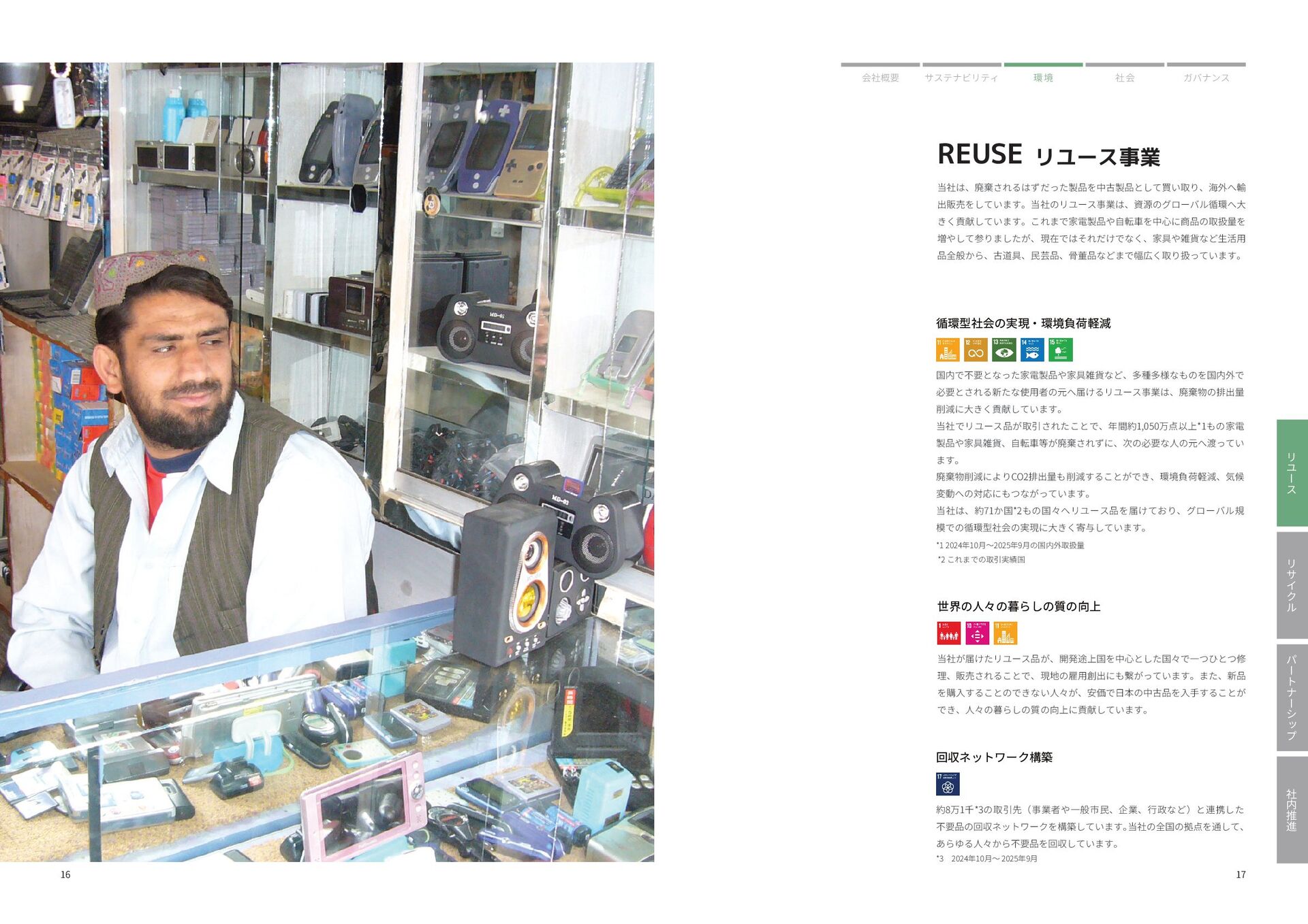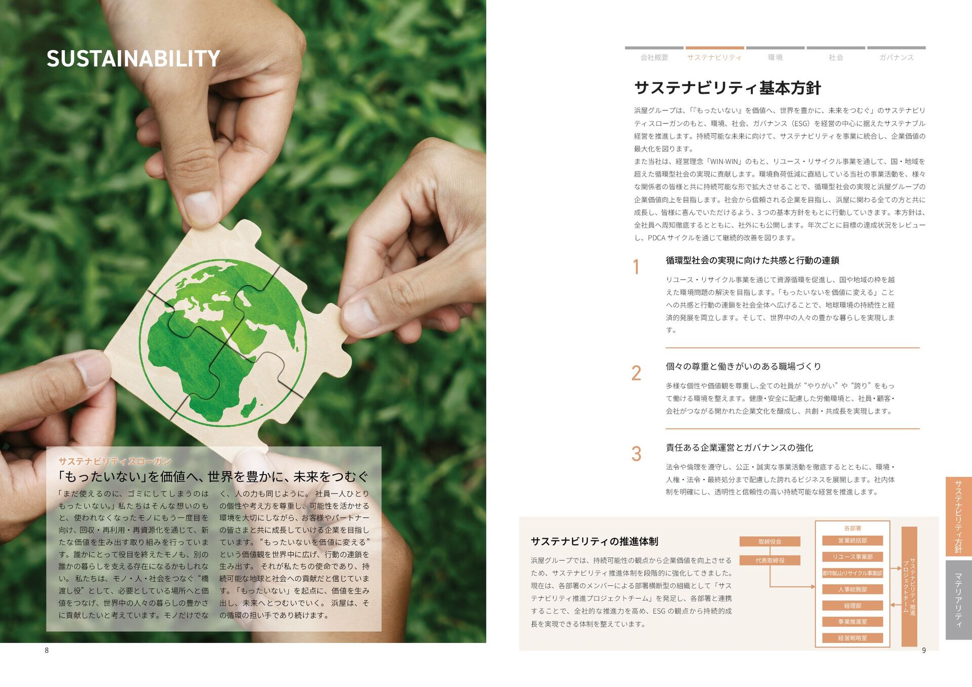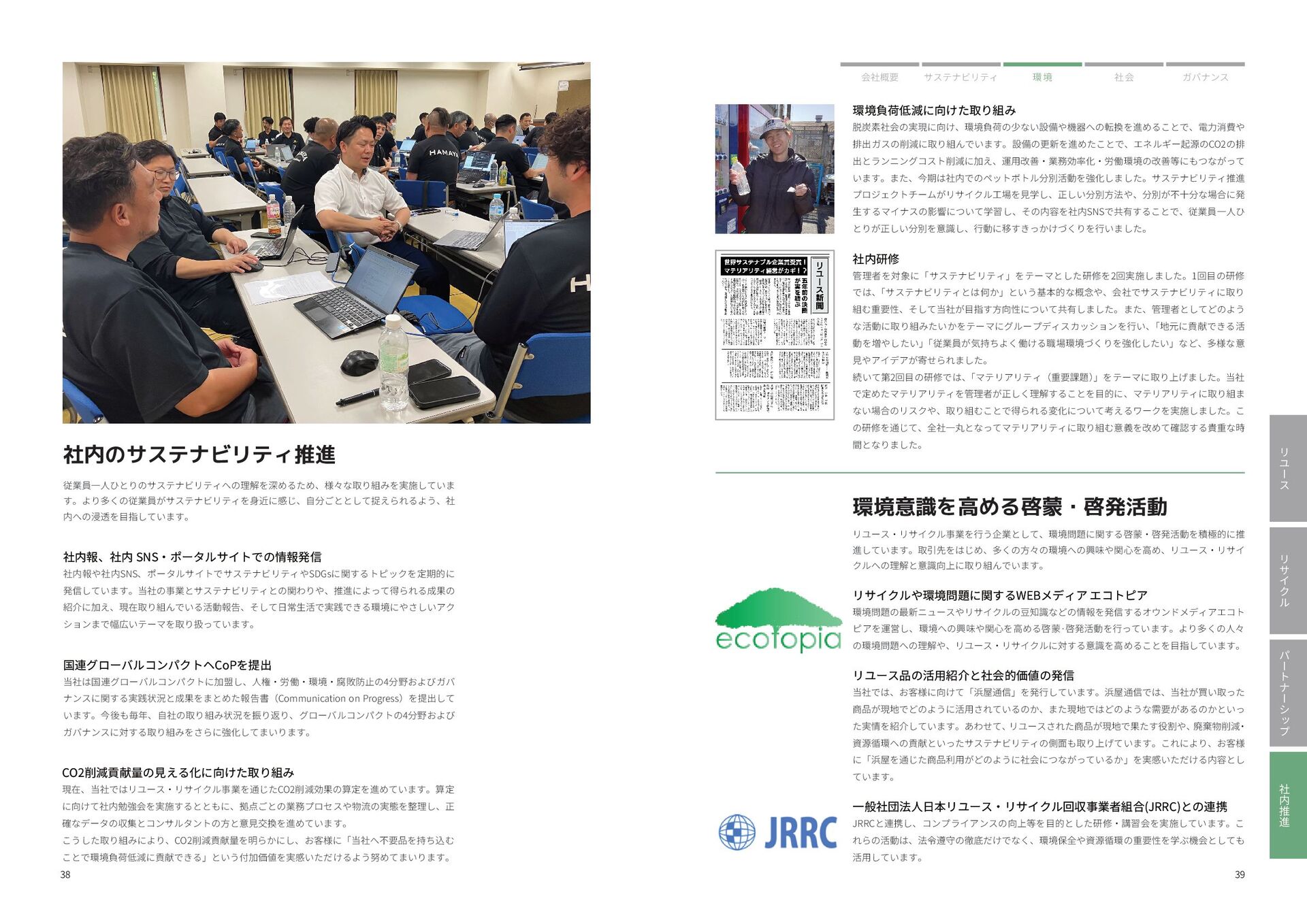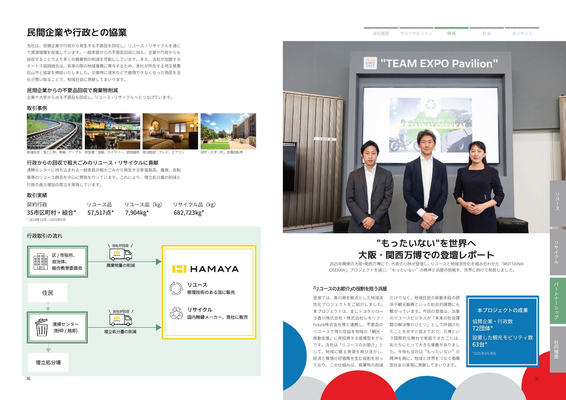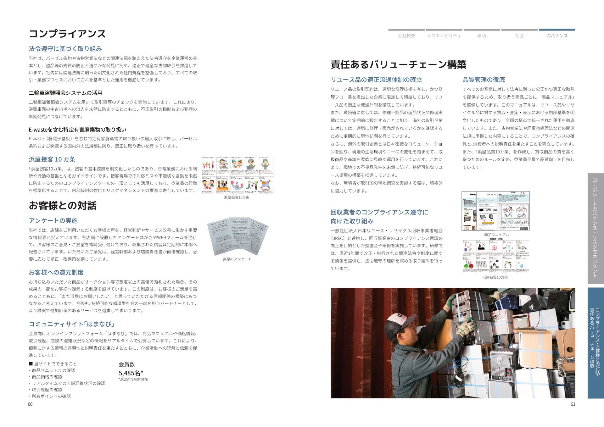 2. 選別・分解 商品ごとに選別や分解を 行い、より良い品質のリ サイクル材を提供できる ようにしています。 基板は日本へ出荷し、当 社の東日本マテリアルセ ンターの破砕機で粉砕処 理をおこない、精錬会社 へ出荷されます。 3. 出荷・再資源化 リサイクル品取扱量 526t* * 2024年10月~2025年9月 NPO法人はまや NPO法人はまやでは、2拠点の就労支援施設で、障がい者の就労訓練を 行っています。株式会社浜屋で回収されたパソコンやゲーム機などの小 型家電の分解・仕分けを障がい者に委託し、その対価を工賃としてお支 払いすることで障がい者の自立支援に繋げています。また、手分解によ る資源回収を行うことでリサイクル率の向上に繋がり、循環型社会の一 翼を担っています。 さらに、一般就労を希望される方への就労支援にも力を入れており、訓 練やサポートを通じて毎年一般企業への就職者を輩出しています。 特別支援学校における実習授業への協力 地域の特別支援学校高等部へ各学期ごとに電子機器を提供しており、 15名~20名の高校1年生が仕事を知ることを目的に分解作業を体験し ます。この取り組みは、仕事への理解を深めるだけでなく、不要にな った製品を再資源化するための一過程を実体験することで、サステナ ビリティについて考えるきっかけになっています。 また高校2,3年生に対しては当NPO法人での実習の場を提供しており、 卒業後の社会参加につながる支援を行っています。 一般企業への就職者輩出数 (参考)埼玉県平均工賃 20,287円/月(2023年4月~2024年3月) / 月* 40,560円 平均工賃 (重量計算の商品は個数1㎏あたり1個として換算) 台* 670,327 障がい者が分解した小型家電の台数 商品のお持ち込み~再資源化までの流れ 一般家庭や事業者、 行政、企業等から不 要品を受け入れま す。 2. 浜屋 お預かりした商品 の分解と仕分けを NPO はまやに委託 します。 3.NPO はまや 障がい者が商品の分 解・仕分け作業を行 います。 精錬会社や商社へ出 荷し、再資源化され ます。 4. 再資源化 1.一般家庭、事業者、 行政、企業等 *2024年4月~2025年3月 HAMAYA DO BRASIL 浜屋ブラジルは、電子機器、基板のリサイクル事業を通じて、ブラジ ル社会において埋め立て処理される廃棄物の削減と雇用創出に大きく 貢献してきました。また基板は高度な精錬技術のある日本へ出荷する ことで、高いリサイクル率の実現や日本の資源確保にも寄与していま す。 HAMAYA France 浜屋フランスでは、日本で収集した古道具や民芸品、骨董品などをフ ランスで販売しています。日本では価値が付きにくい品でも、フラン スでは人気のあるものが多々あります。蚤の市への出店やECサイトで の販売に加え、フランス国内だけでなく、ヨーロッパの近隣諸国で開 催される大型イベントにも足を運び、日本の商品をお届けしています。 32 33 リ サ イ ク ル リ ユ ー ス パ ー ト ナ ー シ ッ プ 社 内 推 進 会社概要 サステナビリティ 環境 社会 ガバナンス