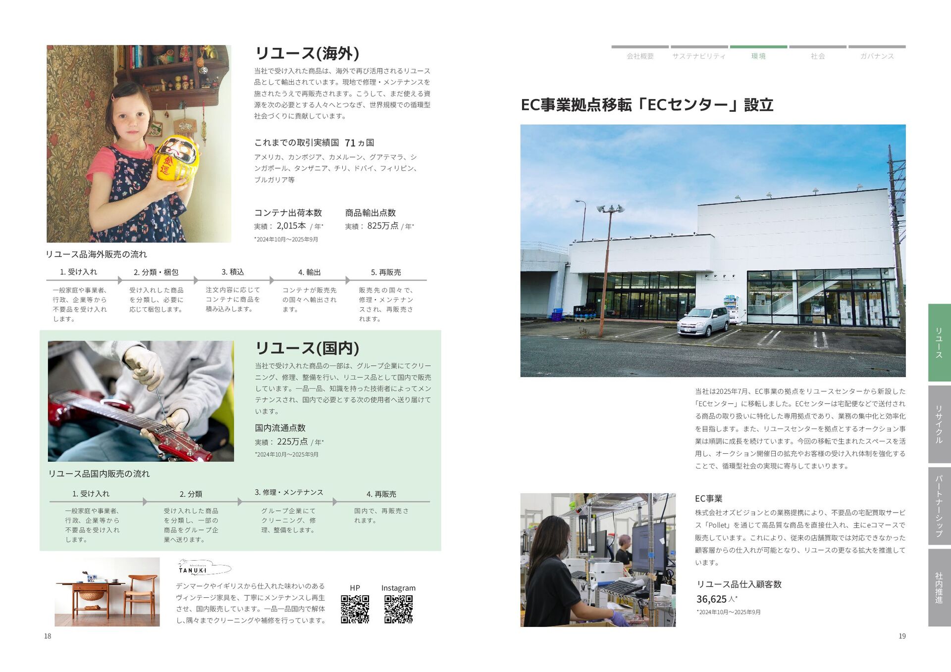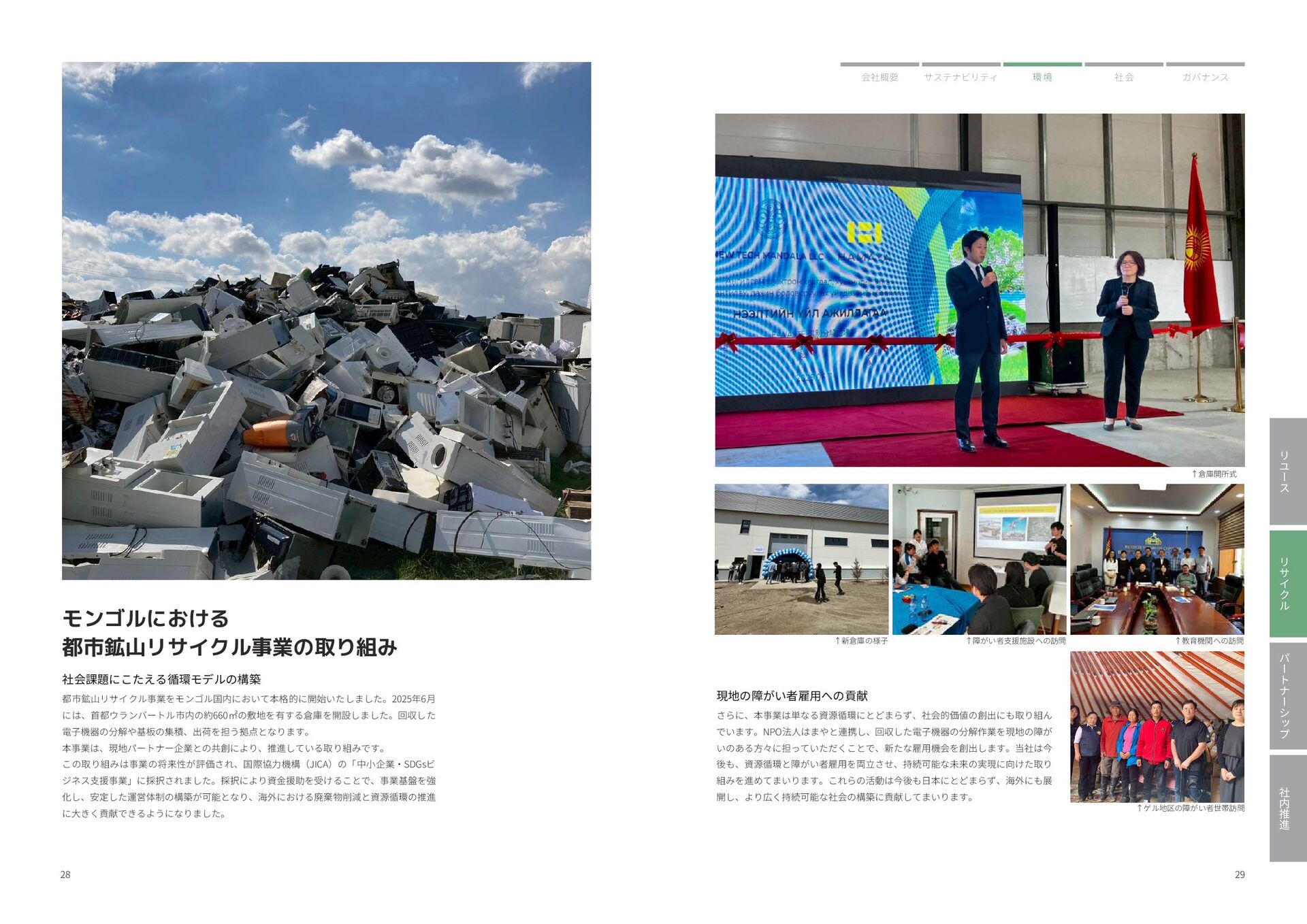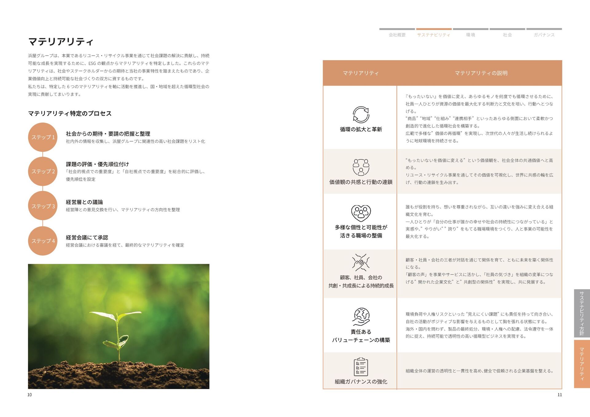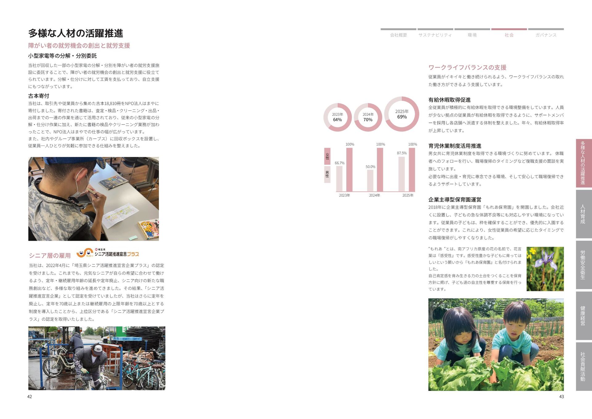 2. 選別・分解 商品ごとに選別や分解を 行い、より良い品質のリ サイクル材を提供できる ようにしています。 基板は日本へ出荷し、当 社の東日本マテリアルセ ンターの破砕機で粉砕処 理をおこない、精錬会社 へ出荷されます。 3. 出荷・再資源化 リサイクル品取扱量 526t* * 2024年10月~2025年9月 NPO法人はまや NPO法人はまやでは、2拠点の就労支援施設で、障がい者の就労訓練を 行っています。株式会社浜屋で回収されたパソコンやゲーム機などの小 型家電の分解・仕分けを障がい者に委託し、その対価を工賃としてお支 払いすることで障がい者の自立支援に繋げています。また、手分解によ る資源回収を行うことでリサイクル率の向上に繋がり、循環型社会の一 翼を担っています。 さらに、一般就労を希望される方への就労支援にも力を入れており、訓 練やサポートを通じて毎年一般企業への就職者を輩出しています。 特別支援学校における実習授業への協力 地域の特別支援学校高等部へ各学期ごとに電子機器を提供しており、 15名~20名の高校1年生が仕事を知ることを目的に分解作業を体験し ます。この取り組みは、仕事への理解を深めるだけでなく、不要にな った製品を再資源化するための一過程を実体験することで、サステナ ビリティについて考えるきっかけになっています。 また高校2,3年生に対しては当NPO法人での実習の場を提供しており、 卒業後の社会参加につながる支援を行っています。 一般企業への就職者輩出数 (参考)埼玉県平均工賃 20,287円/月(2023年4月~2024年3月) / 月* 40,560円 平均工賃 (重量計算の商品は個数1㎏あたり1個として換算) 台* 670,327 障がい者が分解した小型家電の台数 商品のお持ち込み~再資源化までの流れ 一般家庭や事業者、 行政、企業等から不 要品を受け入れま す。 2. 浜屋 お預かりした商品 の分解と仕分けを NPO はまやに委託 します。 3.NPO はまや 障がい者が商品の分 解・仕分け作業を行 います。 精錬会社や商社へ出 荷し、再資源化され ます。 4. 再資源化 1.一般家庭、事業者、 行政、企業等 *2024年4月~2025年3月 HAMAYA DO BRASIL 浜屋ブラジルは、電子機器、基板のリサイクル事業を通じて、ブラジ ル社会において埋め立て処理される廃棄物の削減と雇用創出に大きく 貢献してきました。また基板は高度な精錬技術のある日本へ出荷する ことで、高いリサイクル率の実現や日本の資源確保にも寄与していま す。 HAMAYA France 浜屋フランスでは、日本で収集した古道具や民芸品、骨董品などをフ ランスで販売しています。日本では価値が付きにくい品でも、フラン スでは人気のあるものが多々あります。蚤の市への出店やECサイトで の販売に加え、フランス国内だけでなく、ヨーロッパの近隣諸国で開 催される大型イベントにも足を運び、日本の商品をお届けしています。 32 33 リ サ イ ク ル リ ユ ー ス パ ー ト ナ ー シ ッ プ 社 内 推 進 会社概要 サステナビリティ 環境 社会 ガバナンス