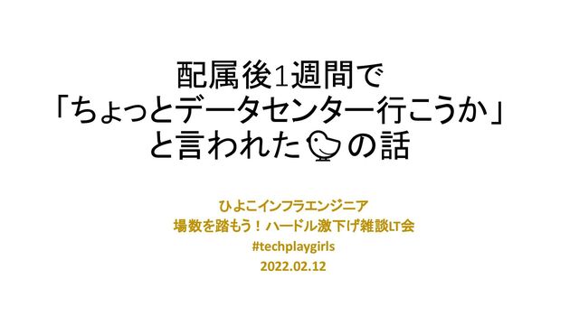配属後1週間で 「ちょっとデータセンター行こうか」 と言われた🐤の話 ひよこインフラエンジニア 場数を踏もう!ハードル激下げ雑談LT会 #techplaygirls 2022.02.12