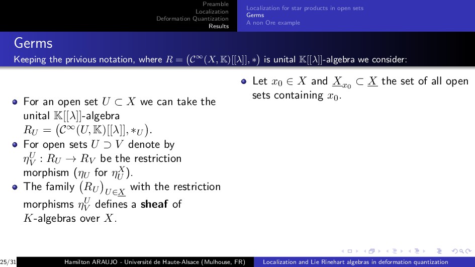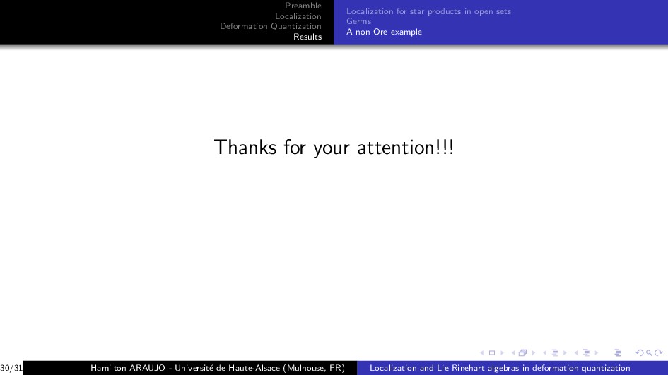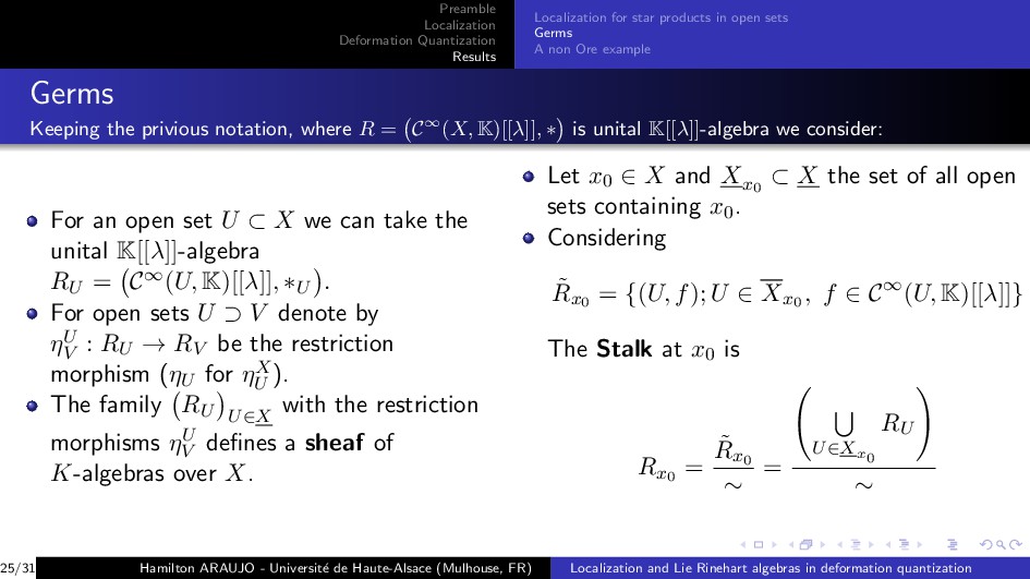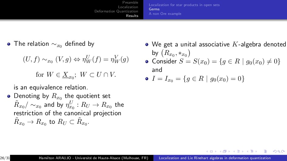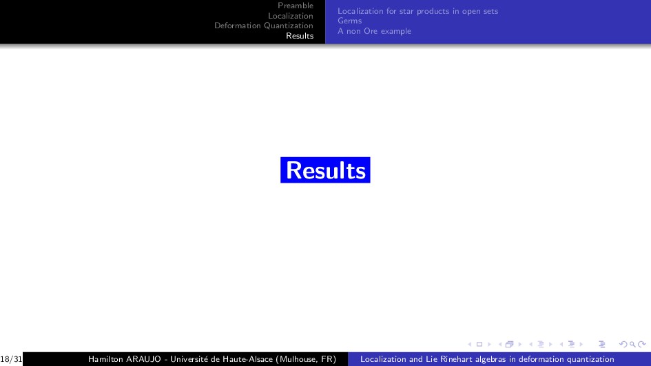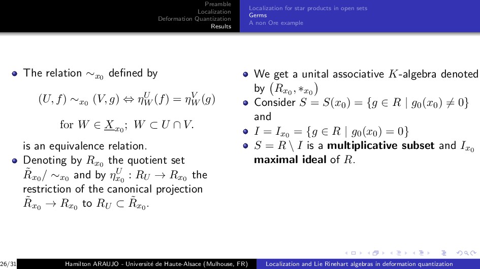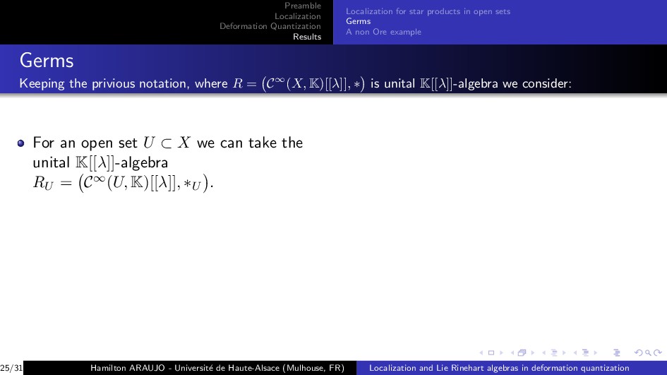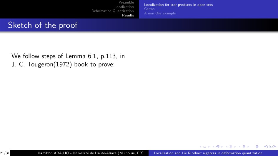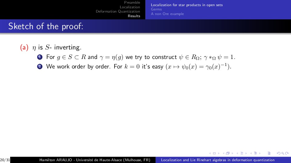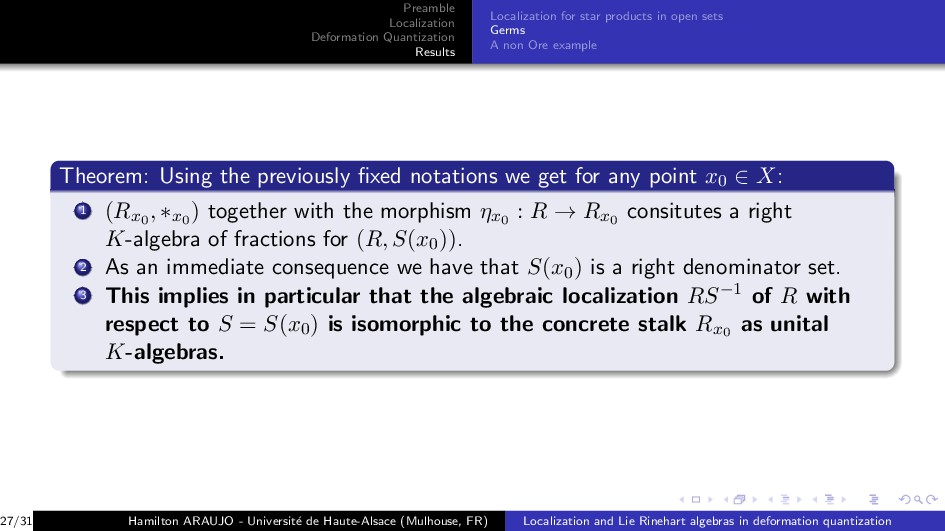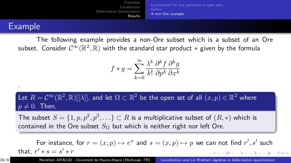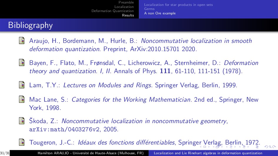 open sets Germs A non Ore example Bibliography Araujo, H., Bordemann, M., Hurle, B.: Noncommutative localization in smooth deformation quantization. Preprint, ArXiv:2010.15701 2020. Bayen, F., Flato, M., Frønsdal, C., Licherowicz, A., Sternheimer, D.: Deformation theory and quantization. I, II. Annals of Phys. 111, 61-110, 111-151 (1978). Lam, T.Y.: Lectures on Modules and Rings. Springer Verlag, Berlin, 1999. Mac Lane, S.: Categories for the Working Mathematician. 2nd ed., Springer, New York, 1998. ˇ Skoda, Z.: Noncommutative localization in noncommutative geometry, arXiv:math/0403276v2, 2005. Tougeron, J.-C.: Id´ eaux des fonctions diff´ erentiables, Springer Verlag, Berlin, 1972. 31/31 Hamilton ARAUJO - Universit´ e de Haute-Alsace (Mulhouse, FR) Localization and Lie Rinehart algebras in deformation quantization