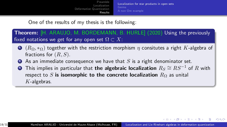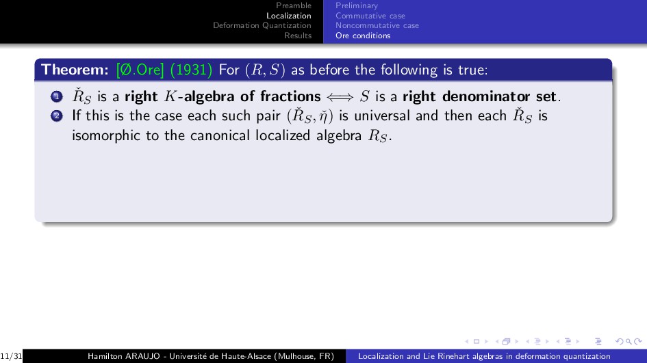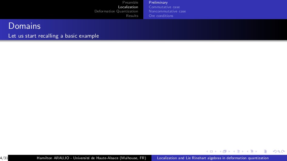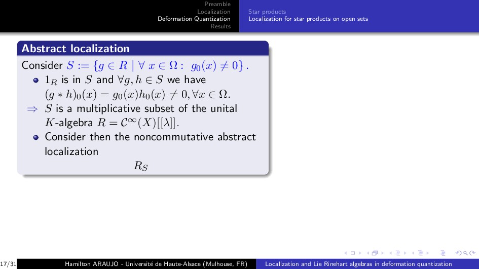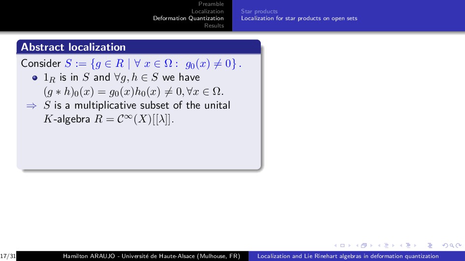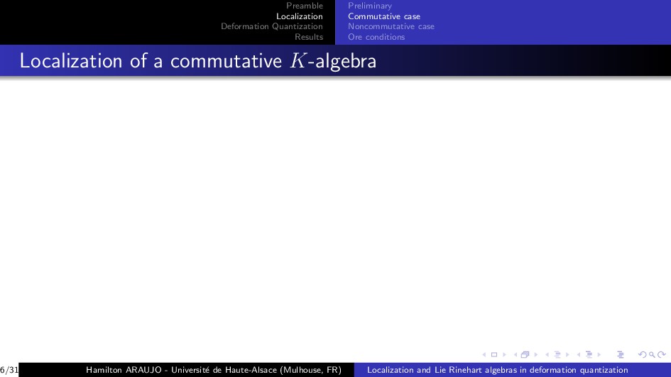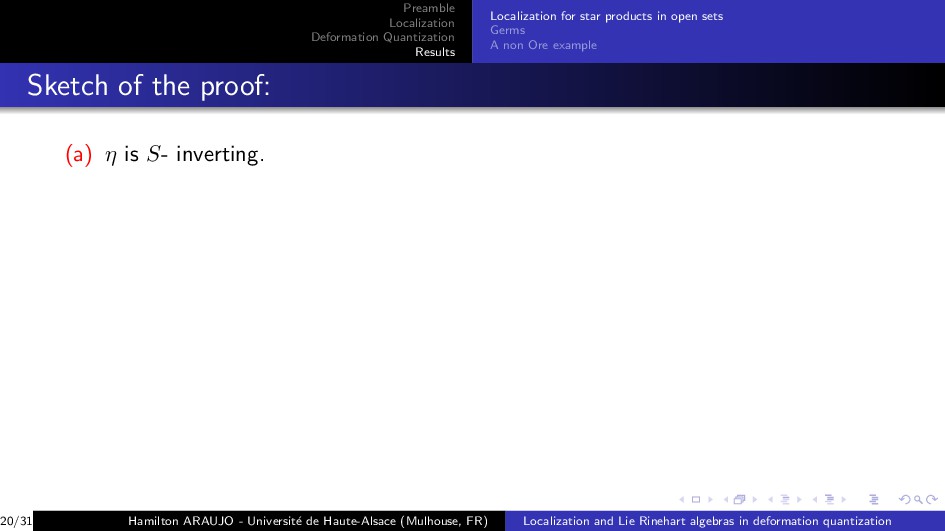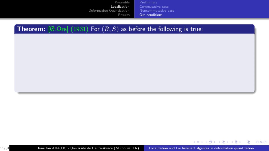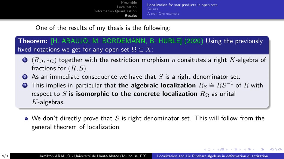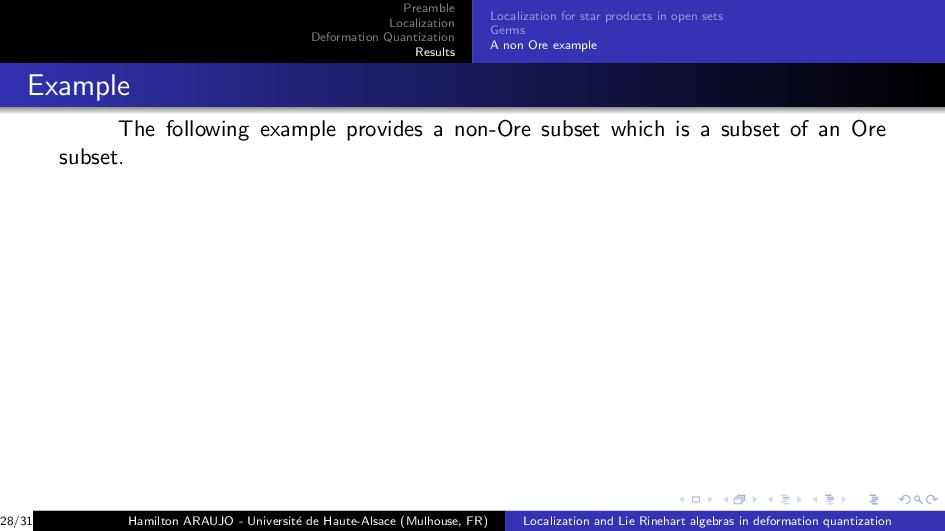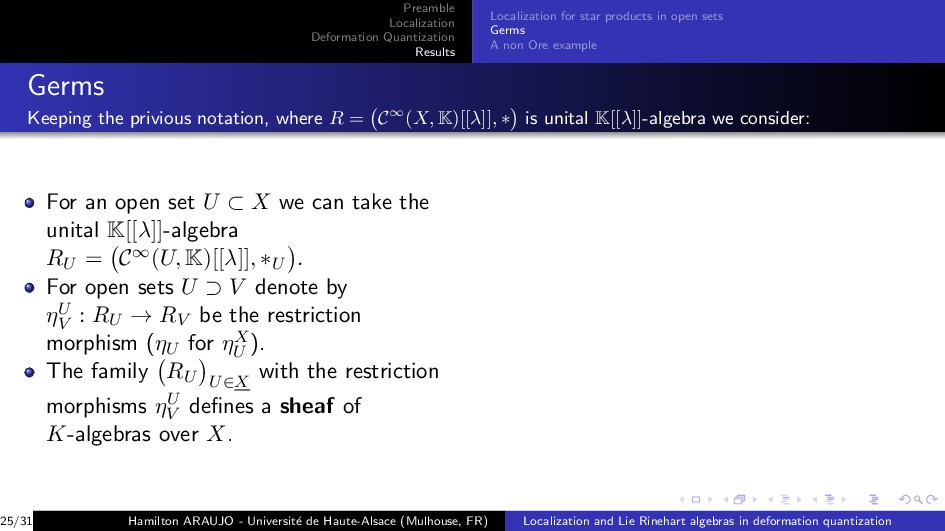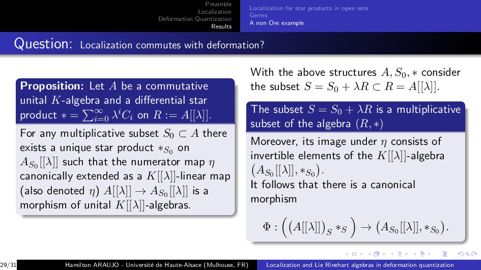 open sets Germs A non Ore example Bibliography Araujo, H., Bordemann, M., Hurle, B.: Noncommutative localization in smooth deformation quantization. Preprint, ArXiv:2010.15701 2020. Bayen, F., Flato, M., Frønsdal, C., Licherowicz, A., Sternheimer, D.: Deformation theory and quantization. I, II. Annals of Phys. 111, 61-110, 111-151 (1978). Lam, T.Y.: Lectures on Modules and Rings. Springer Verlag, Berlin, 1999. Mac Lane, S.: Categories for the Working Mathematician. 2nd ed., Springer, New York, 1998. ˇ Skoda, Z.: Noncommutative localization in noncommutative geometry, arXiv:math/0403276v2, 2005. Tougeron, J.-C.: Id´ eaux des fonctions diff´ erentiables, Springer Verlag, Berlin, 1972. 31/31 Hamilton ARAUJO - Universit´ e de Haute-Alsace (Mulhouse, FR) Localization and Lie Rinehart algebras in deformation quantization