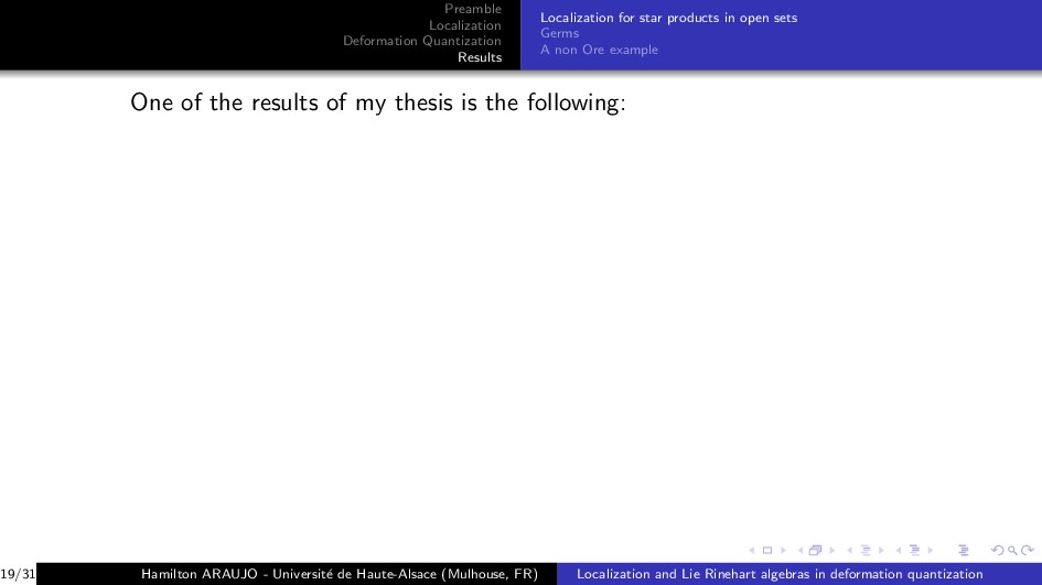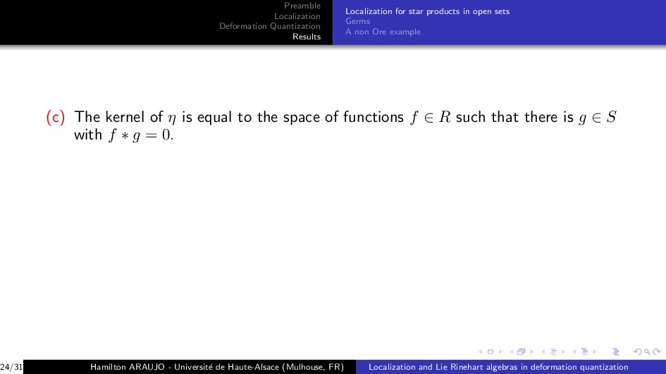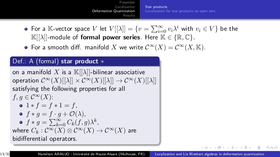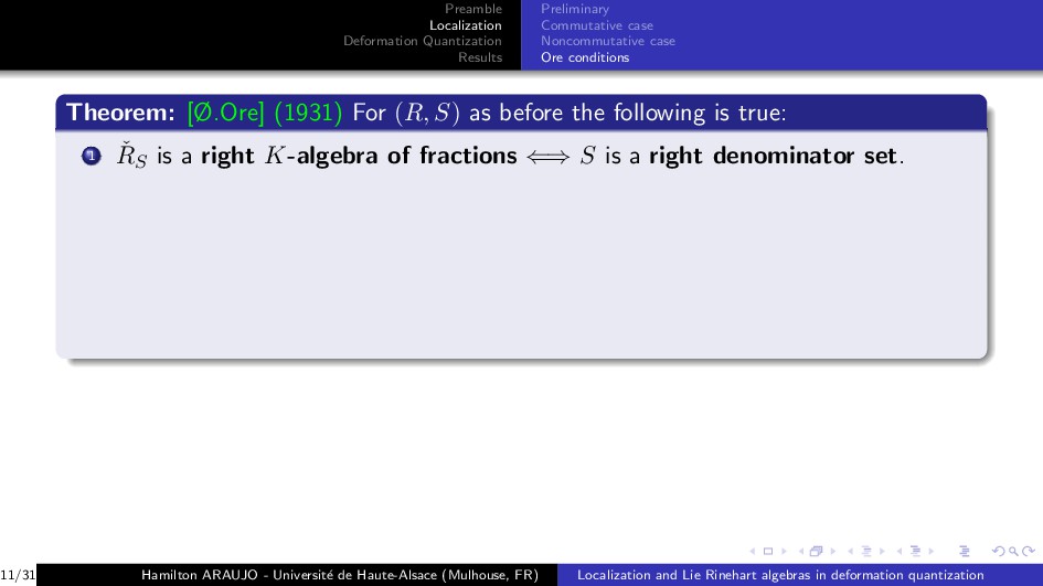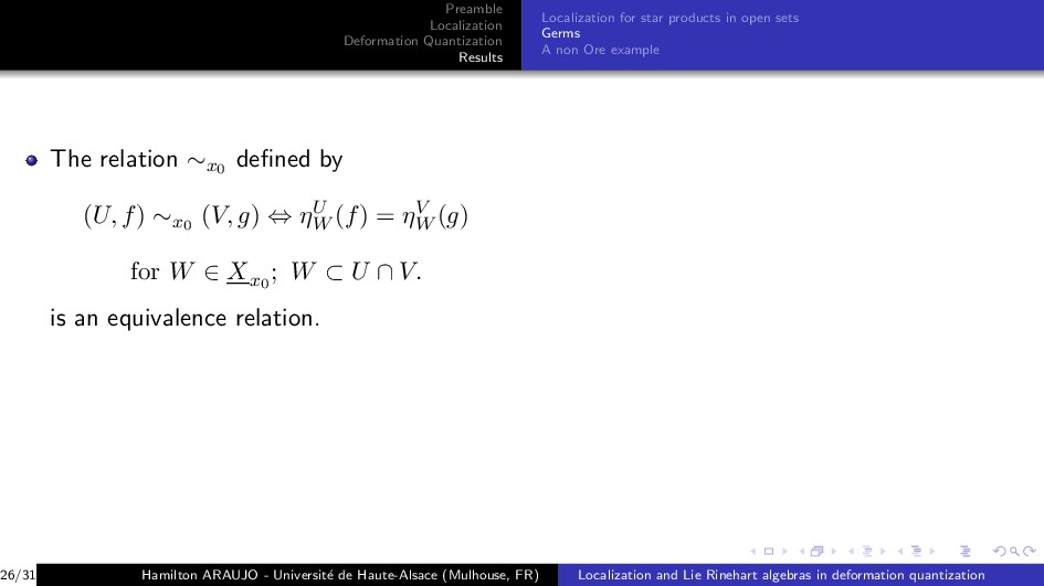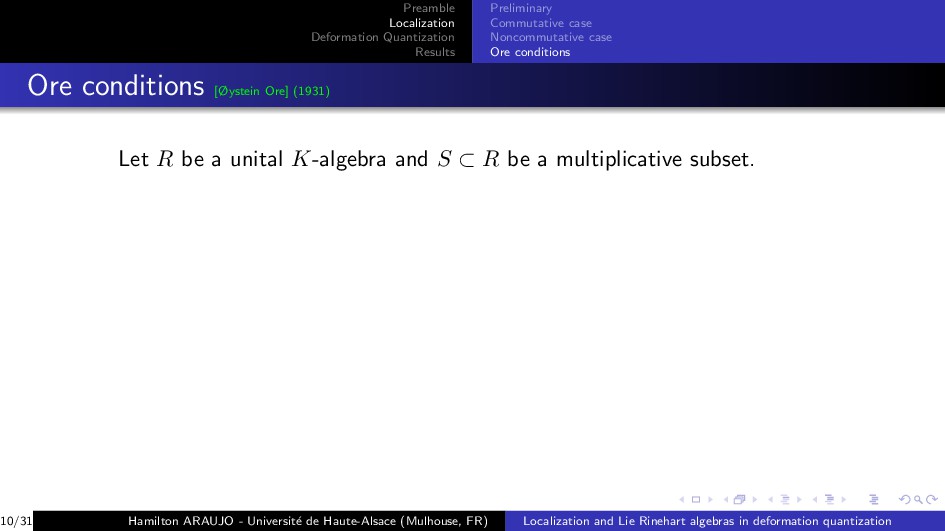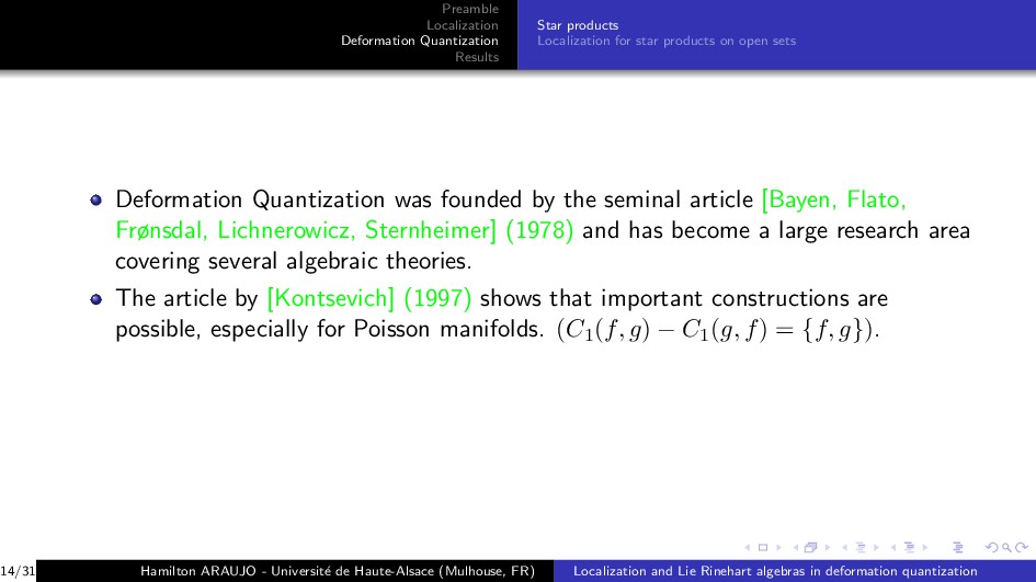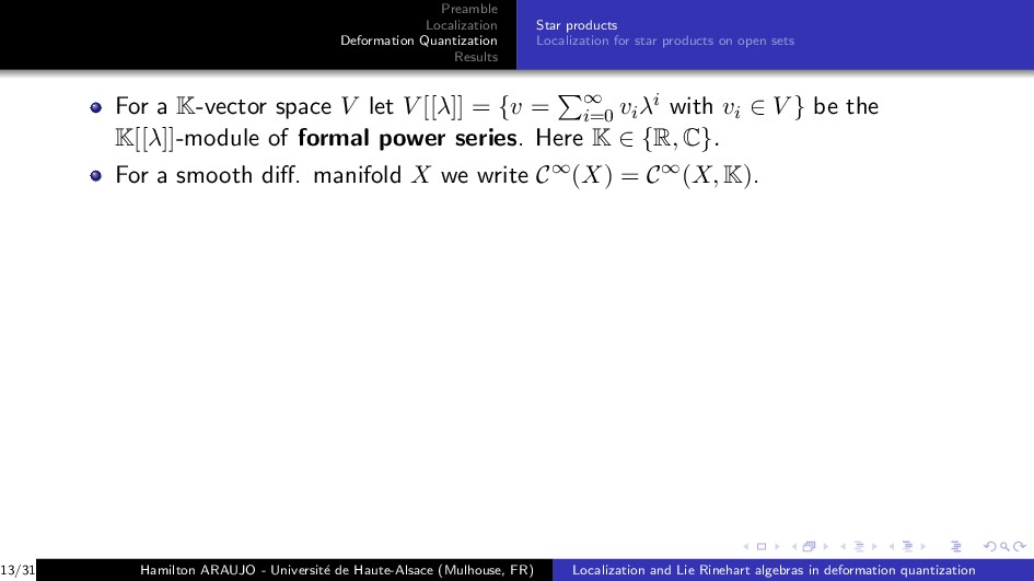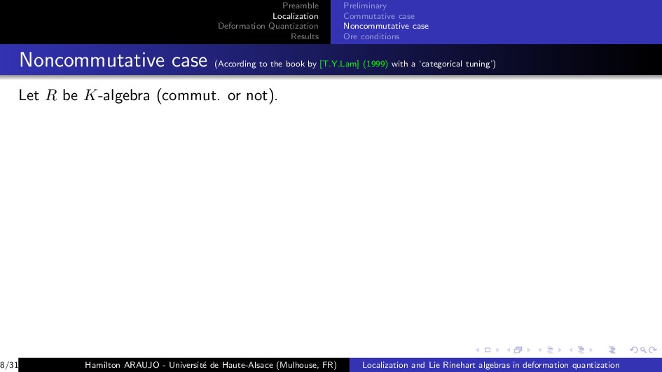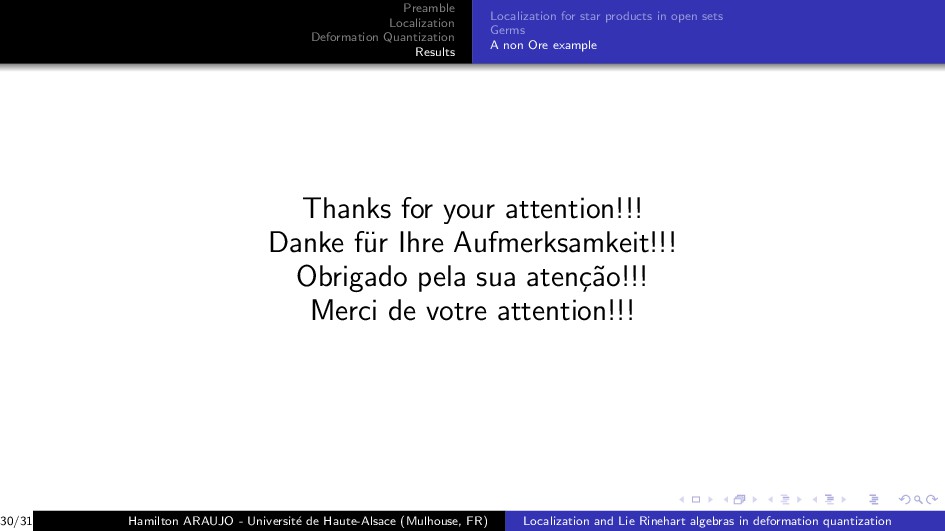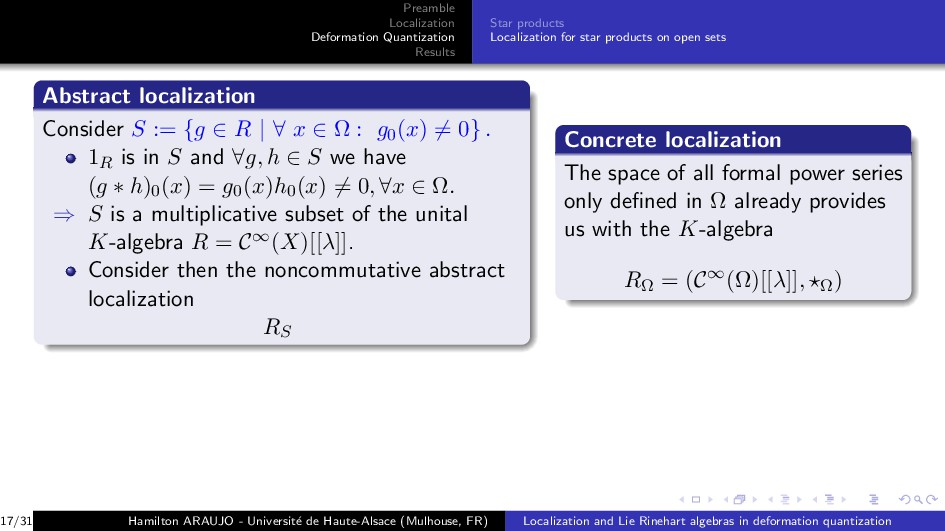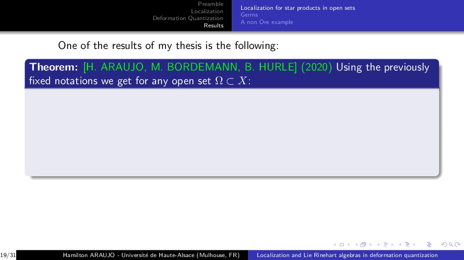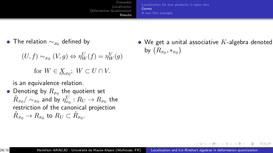 open sets Germs A non Ore example Bibliography Araujo, H., Bordemann, M., Hurle, B.: Noncommutative localization in smooth deformation quantization. Preprint, ArXiv:2010.15701 2020. Bayen, F., Flato, M., Frønsdal, C., Licherowicz, A., Sternheimer, D.: Deformation theory and quantization. I, II. Annals of Phys. 111, 61-110, 111-151 (1978). Lam, T.Y.: Lectures on Modules and Rings. Springer Verlag, Berlin, 1999. Mac Lane, S.: Categories for the Working Mathematician. 2nd ed., Springer, New York, 1998. ˇ Skoda, Z.: Noncommutative localization in noncommutative geometry, arXiv:math/0403276v2, 2005. Tougeron, J.-C.: Id´ eaux des fonctions diff´ erentiables, Springer Verlag, Berlin, 1972. 31/31 Hamilton ARAUJO - Universit´ e de Haute-Alsace (Mulhouse, FR) Localization and Lie Rinehart algebras in deformation quantization