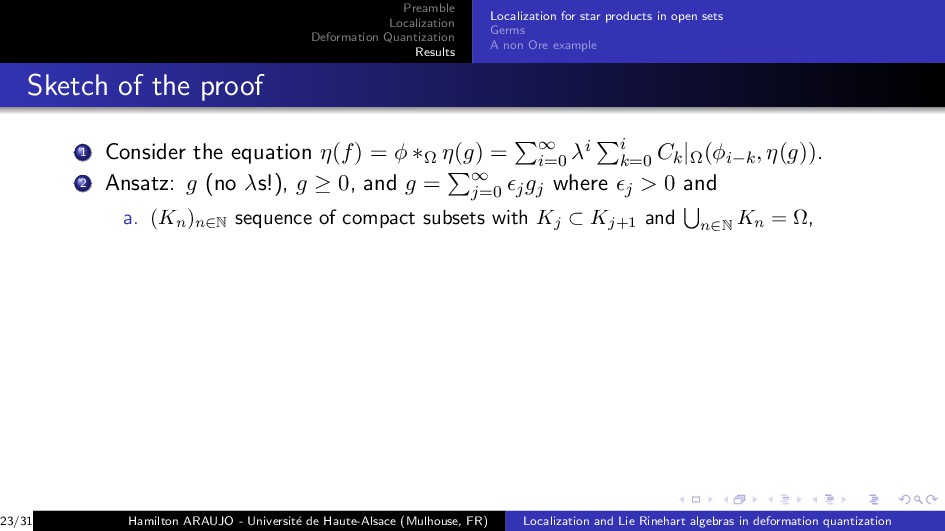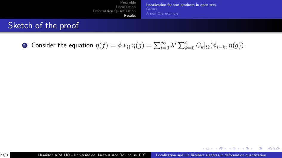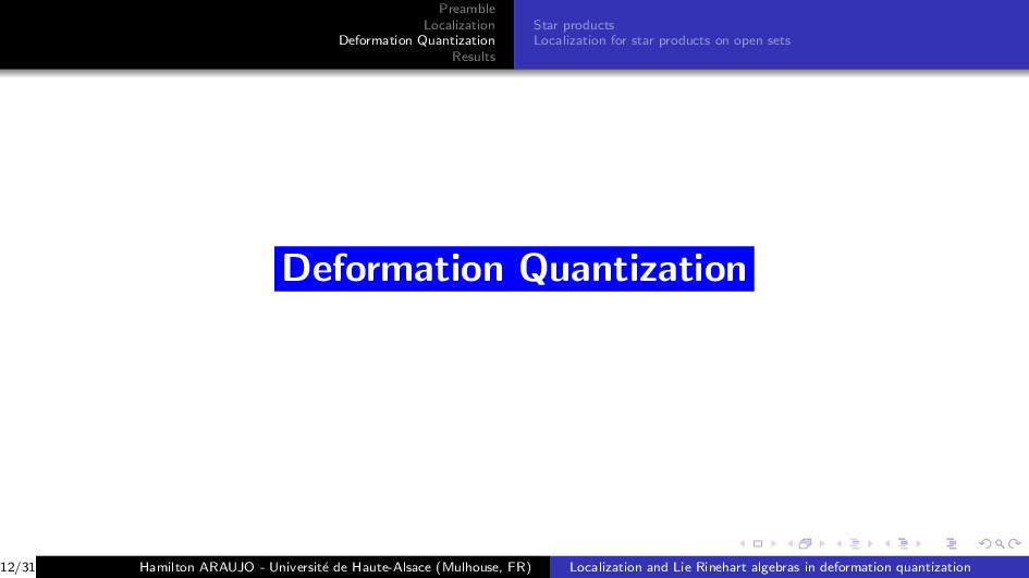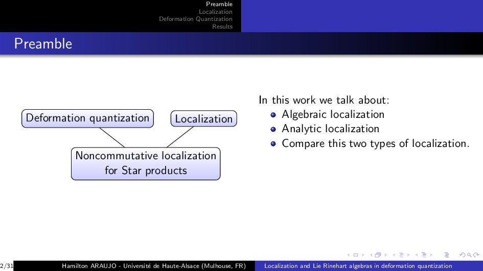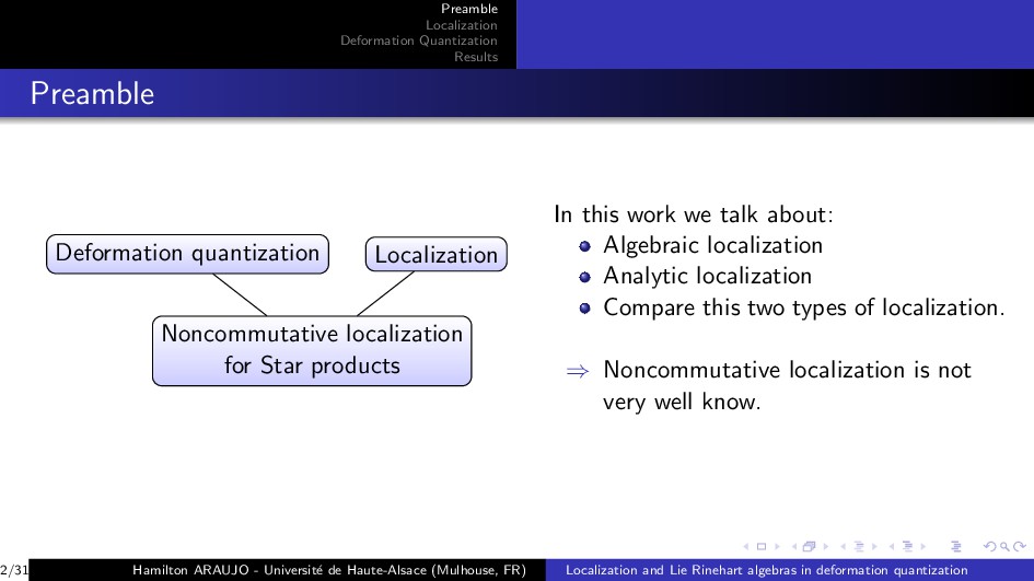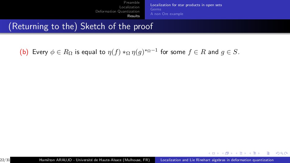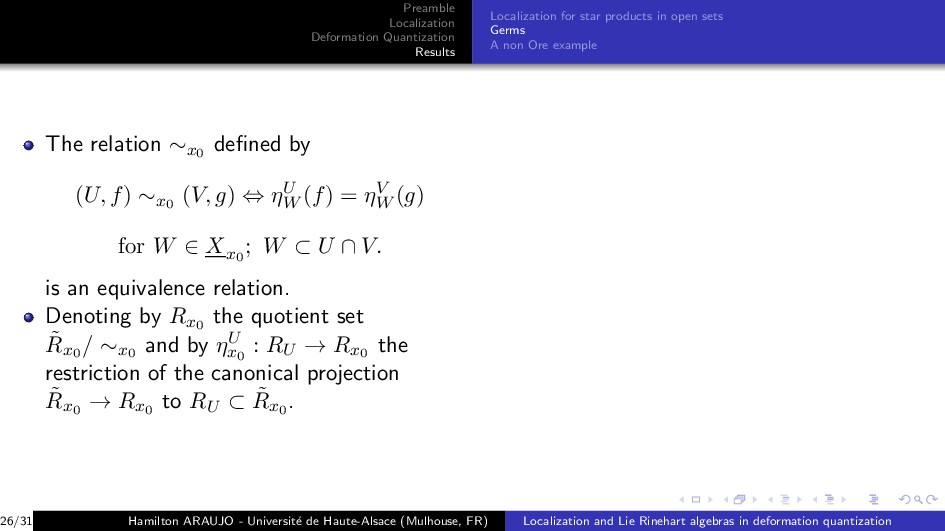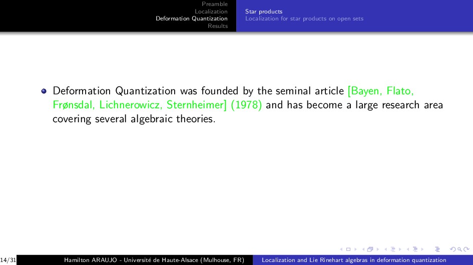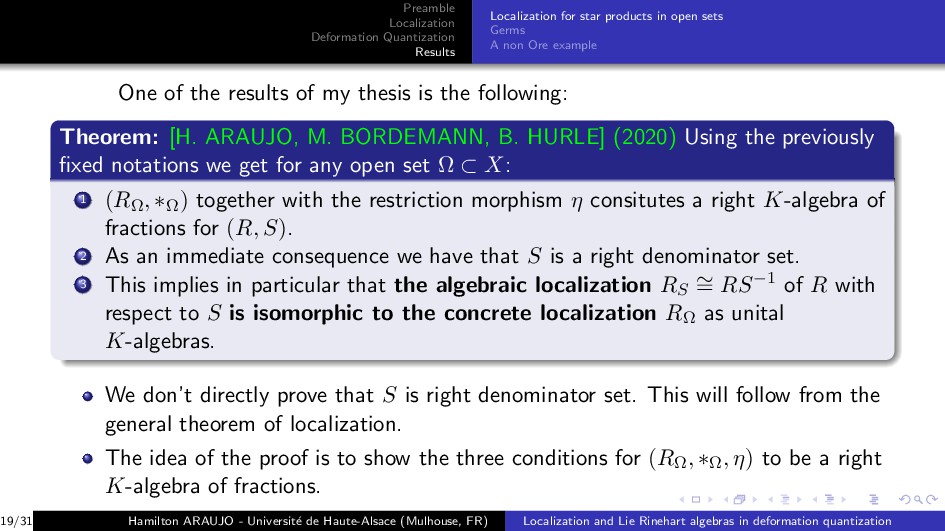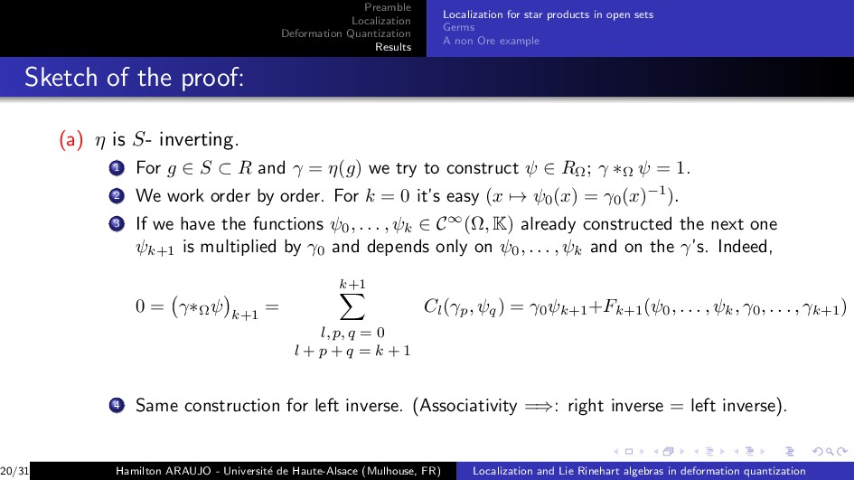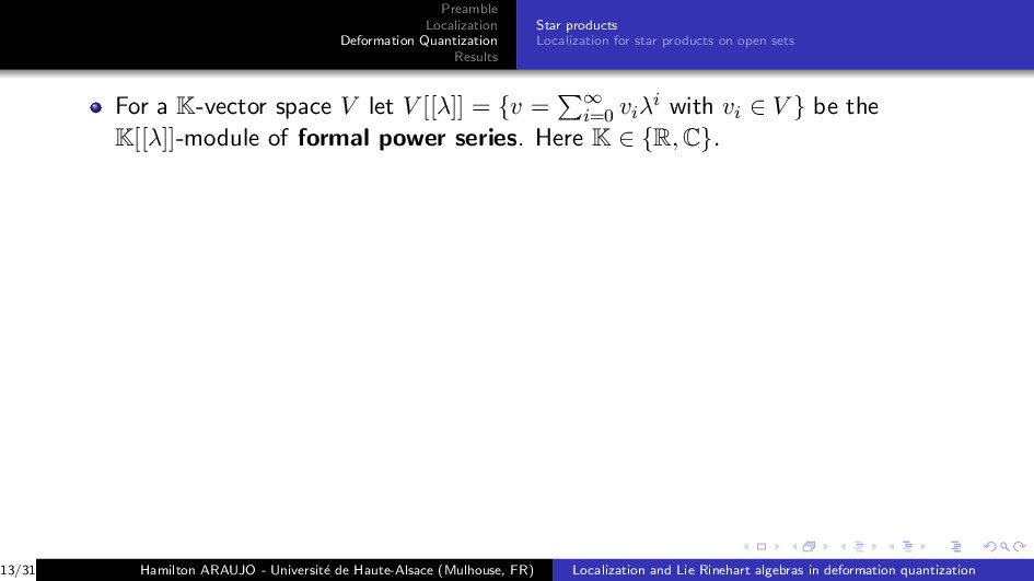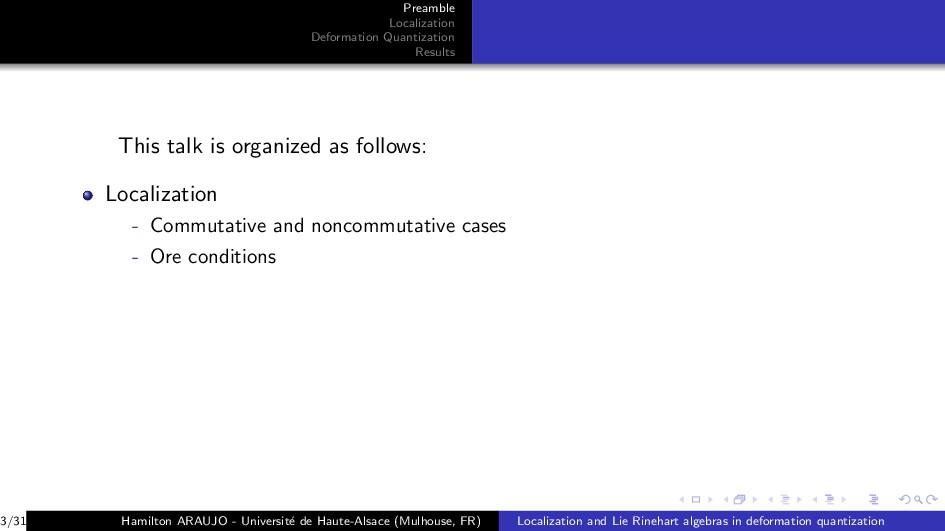 open sets Germs A non Ore example Bibliography Araujo, H., Bordemann, M., Hurle, B.: Noncommutative localization in smooth deformation quantization. Preprint, ArXiv:2010.15701 2020. Bayen, F., Flato, M., Frønsdal, C., Licherowicz, A., Sternheimer, D.: Deformation theory and quantization. I, II. Annals of Phys. 111, 61-110, 111-151 (1978). Lam, T.Y.: Lectures on Modules and Rings. Springer Verlag, Berlin, 1999. Mac Lane, S.: Categories for the Working Mathematician. 2nd ed., Springer, New York, 1998. ˇ Skoda, Z.: Noncommutative localization in noncommutative geometry, arXiv:math/0403276v2, 2005. Tougeron, J.-C.: Id´ eaux des fonctions diff´ erentiables, Springer Verlag, Berlin, 1972. 31/31 Hamilton ARAUJO - Universit´ e de Haute-Alsace (Mulhouse, FR) Localization and Lie Rinehart algebras in deformation quantization