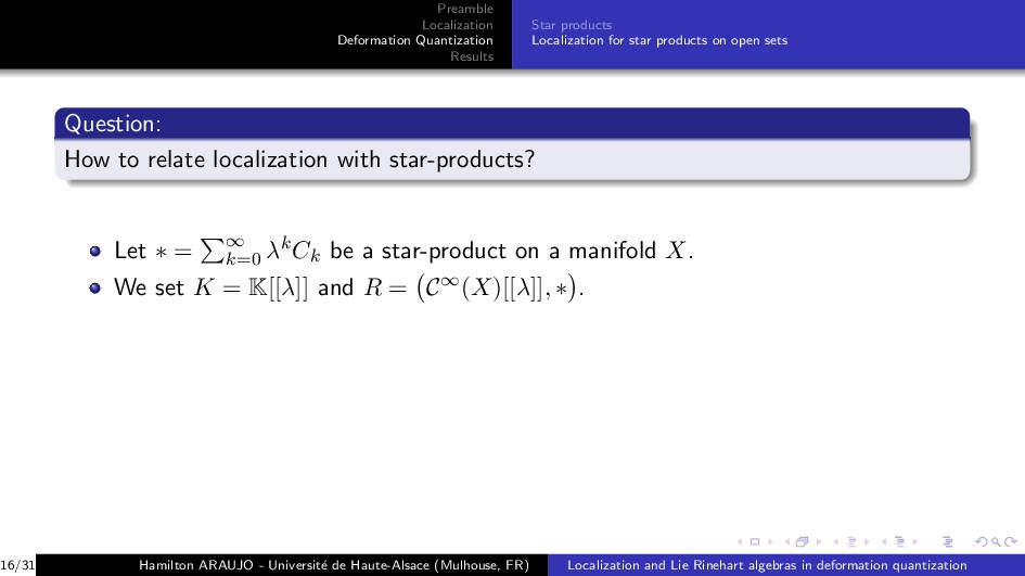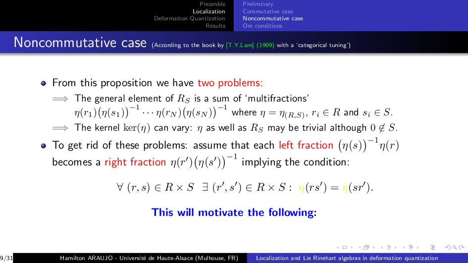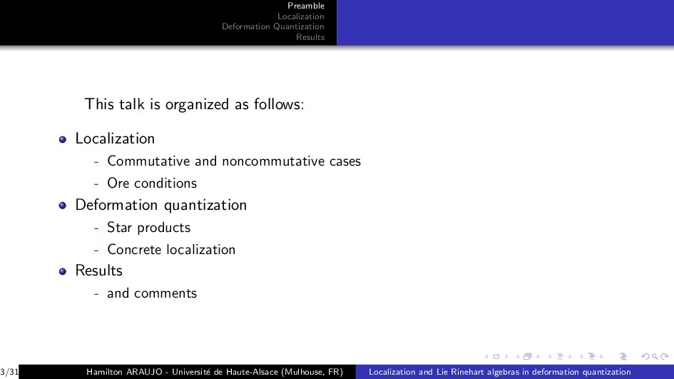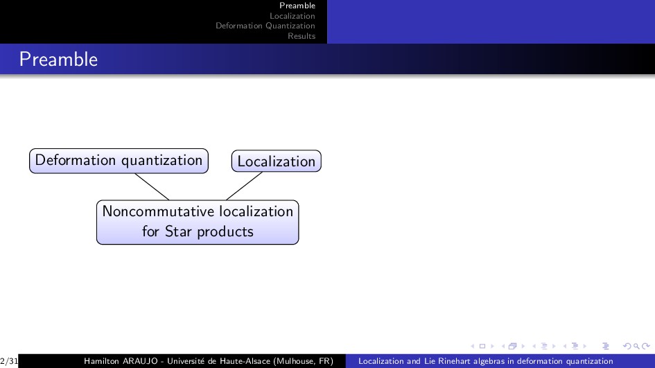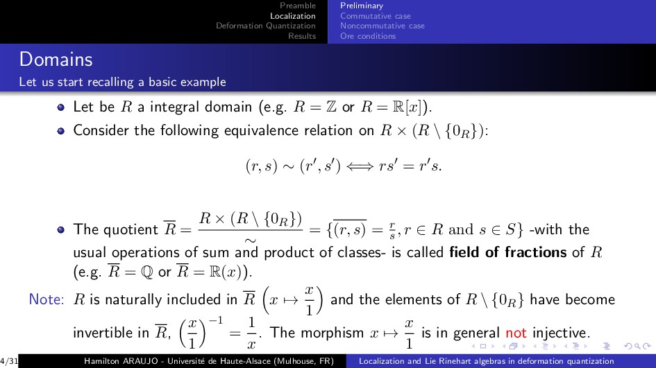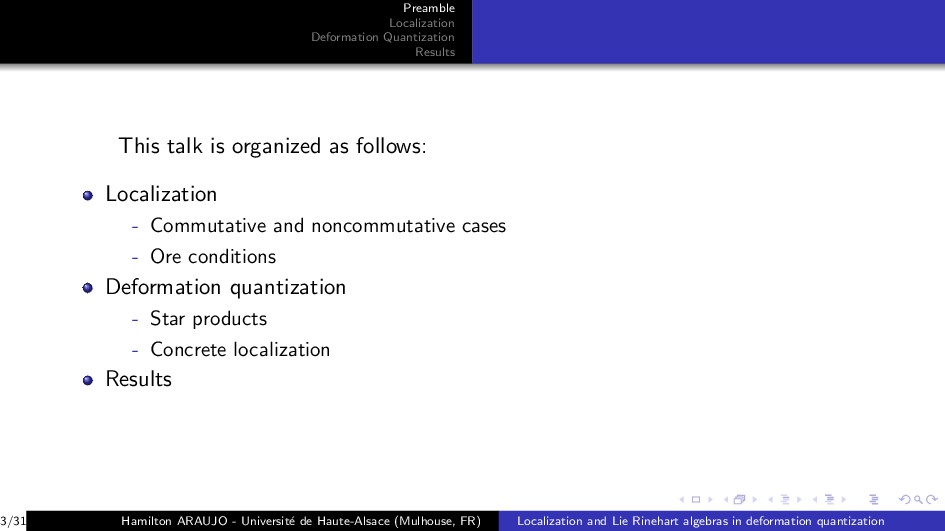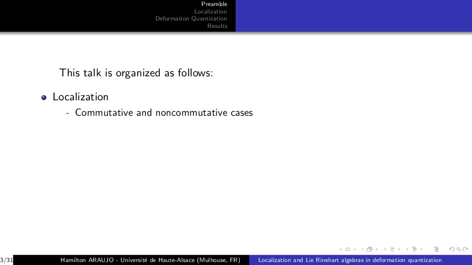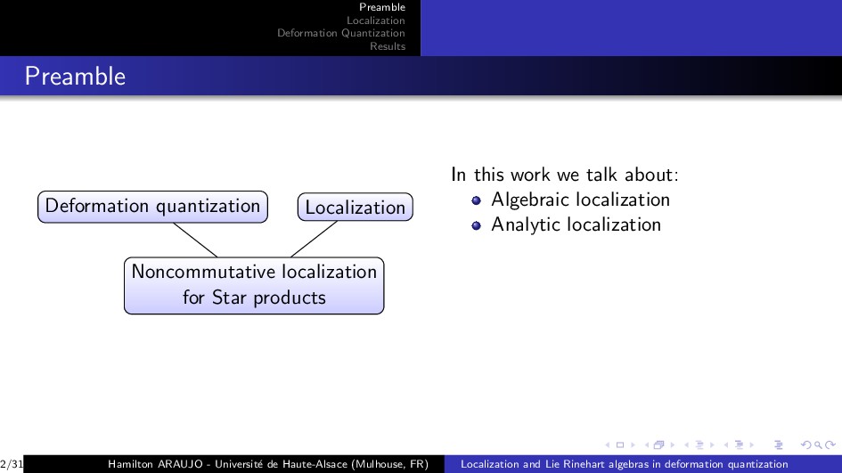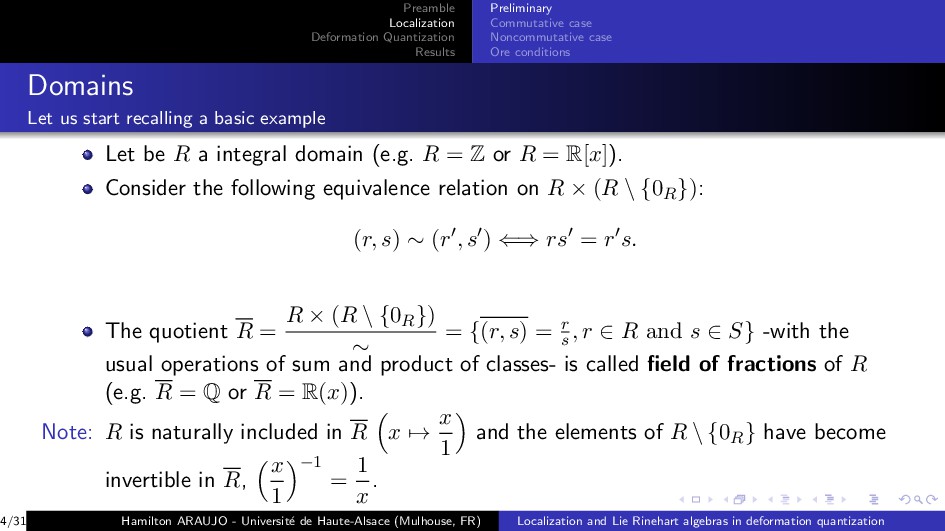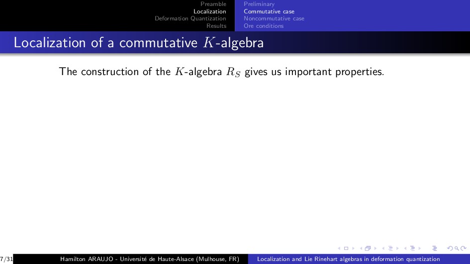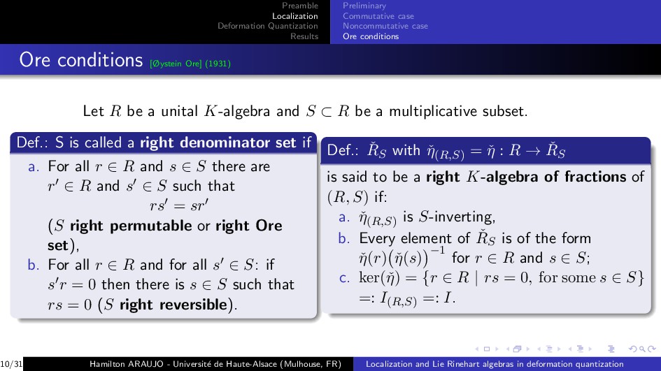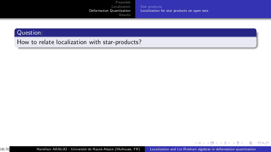open sets Germs A non Ore example Bibliography Araujo, H., Bordemann, M., Hurle, B.: Noncommutative localization in smooth deformation quantization. Preprint, ArXiv:2010.15701 2020. Bayen, F., Flato, M., Frønsdal, C., Licherowicz, A., Sternheimer, D.: Deformation theory and quantization. I, II. Annals of Phys. 111, 61-110, 111-151 (1978). Lam, T.Y.: Lectures on Modules and Rings. Springer Verlag, Berlin, 1999. Mac Lane, S.: Categories for the Working Mathematician. 2nd ed., Springer, New York, 1998. ˇ Skoda, Z.: Noncommutative localization in noncommutative geometry, arXiv:math/0403276v2, 2005. Tougeron, J.-C.: Id´ eaux des fonctions diff´ erentiables, Springer Verlag, Berlin, 1972. 31/31 Hamilton ARAUJO - Universit´ e de Haute-Alsace (Mulhouse, FR) Localization and Lie Rinehart algebras in deformation quantization