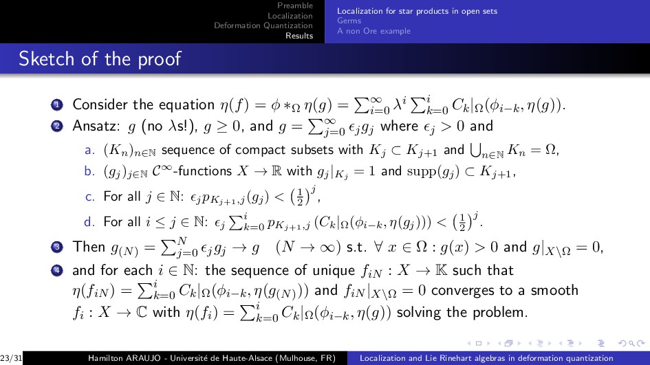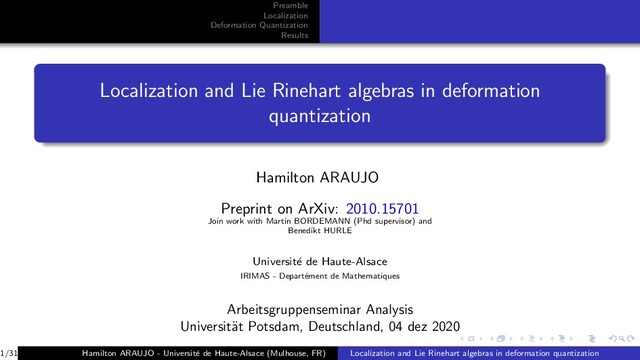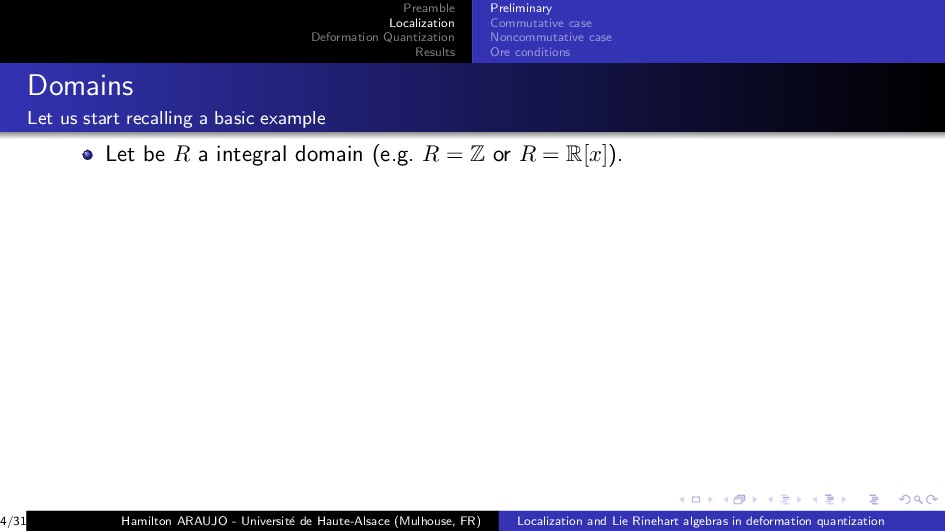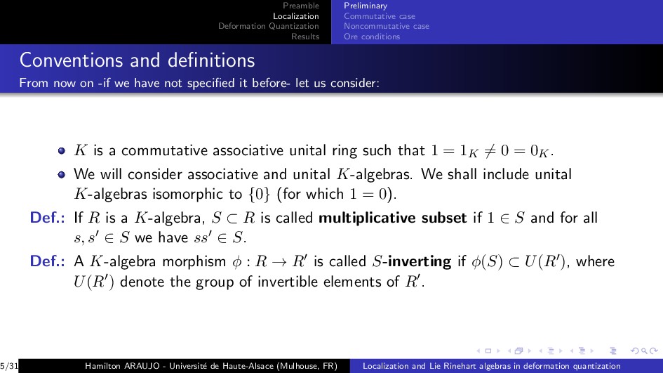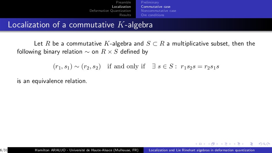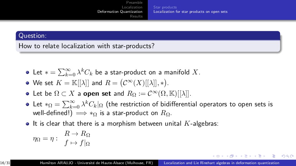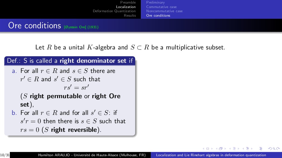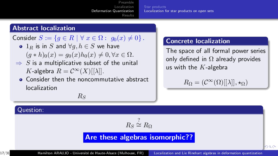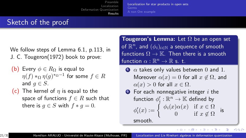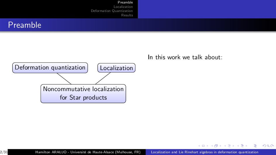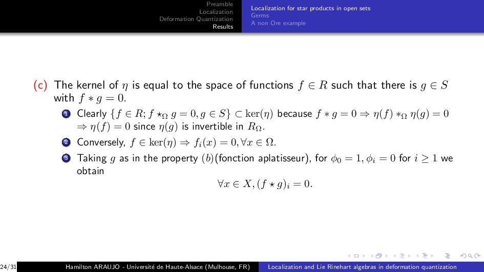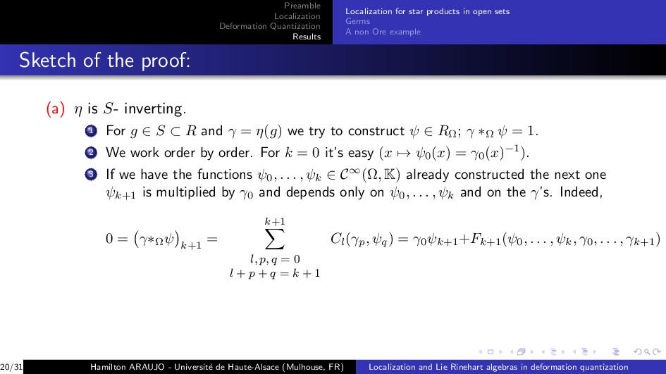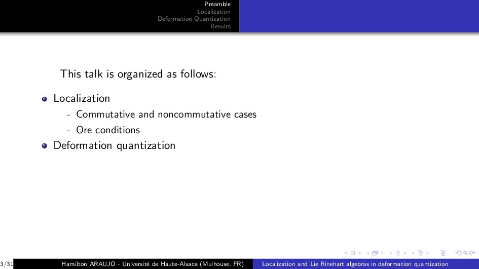 open sets Germs A non Ore example Bibliography Araujo, H., Bordemann, M., Hurle, B.: Noncommutative localization in smooth deformation quantization. Preprint, ArXiv:2010.15701 2020. Bayen, F., Flato, M., Frønsdal, C., Licherowicz, A., Sternheimer, D.: Deformation theory and quantization. I, II. Annals of Phys. 111, 61-110, 111-151 (1978). Lam, T.Y.: Lectures on Modules and Rings. Springer Verlag, Berlin, 1999. Mac Lane, S.: Categories for the Working Mathematician. 2nd ed., Springer, New York, 1998. ˇ Skoda, Z.: Noncommutative localization in noncommutative geometry, arXiv:math/0403276v2, 2005. Tougeron, J.-C.: Id´ eaux des fonctions diff´ erentiables, Springer Verlag, Berlin, 1972. 31/31 Hamilton ARAUJO - Universit´ e de Haute-Alsace (Mulhouse, FR) Localization and Lie Rinehart algebras in deformation quantization