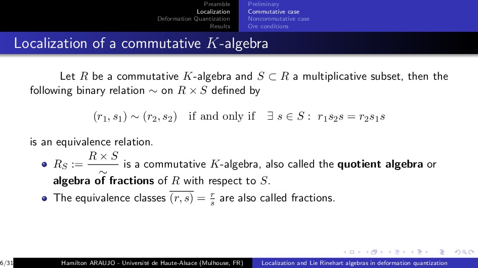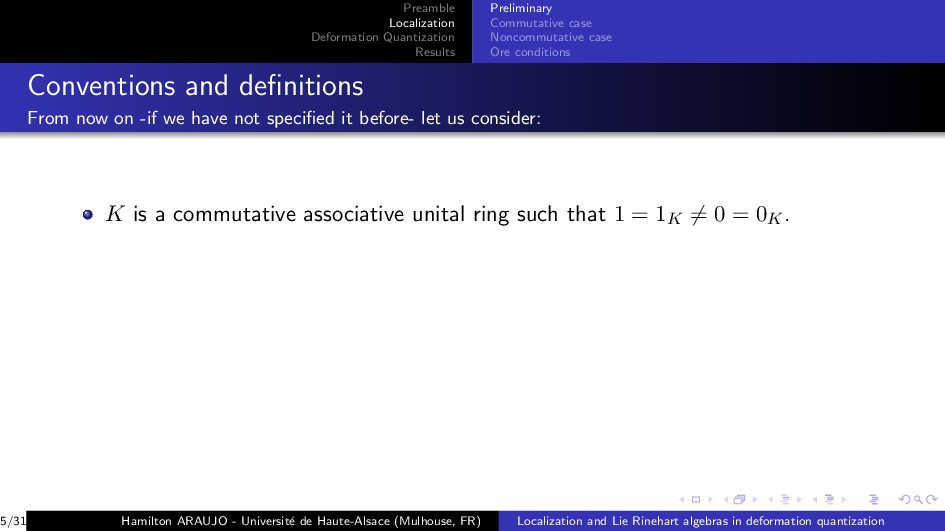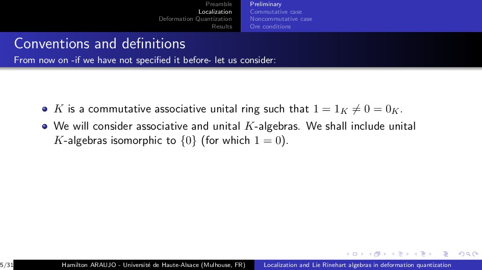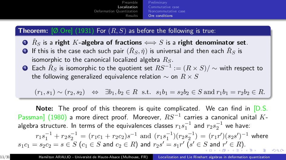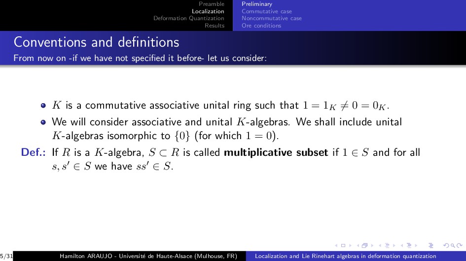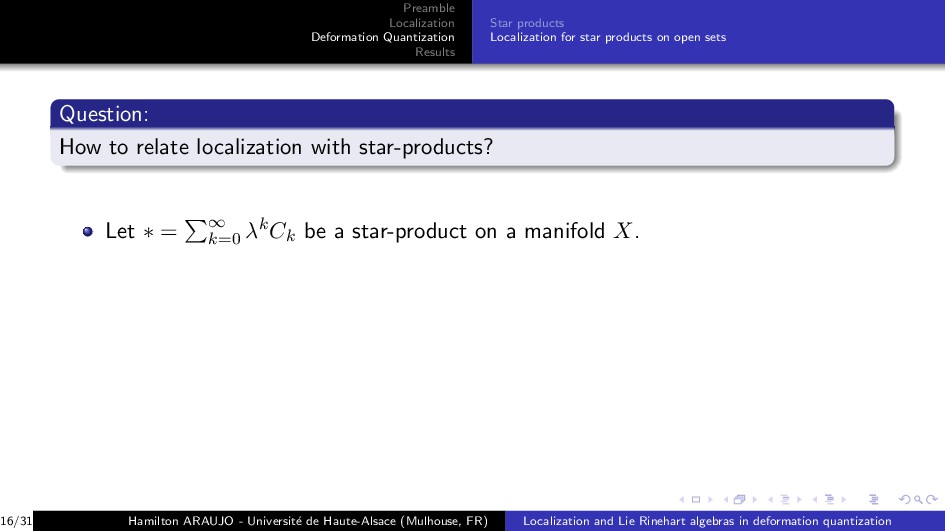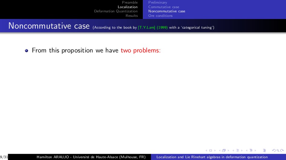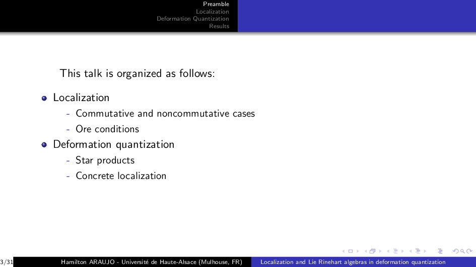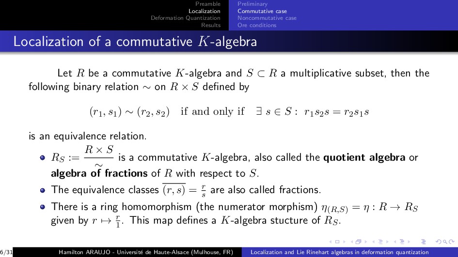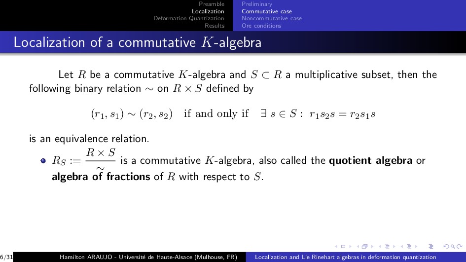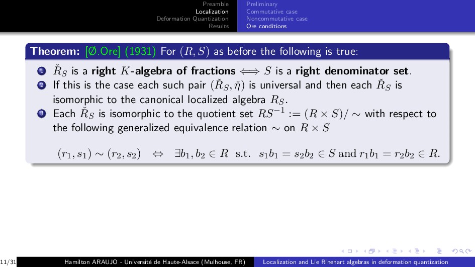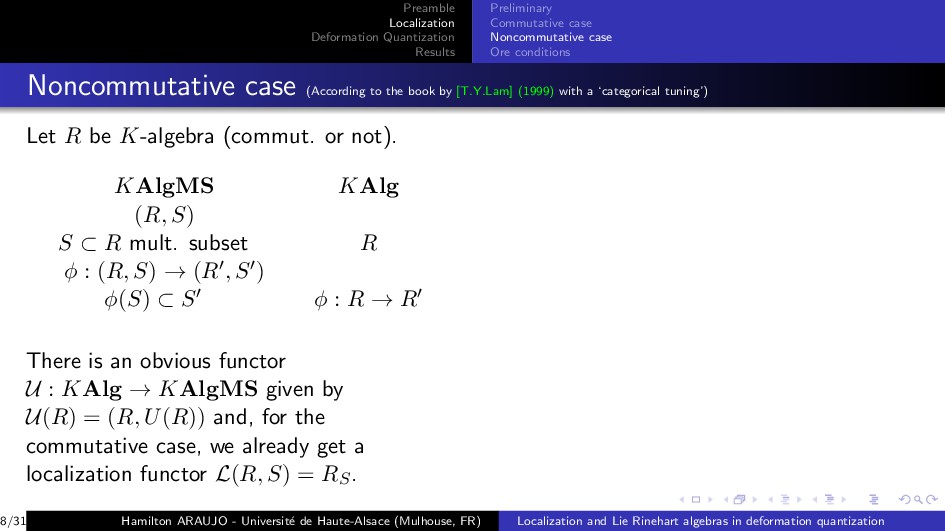 open sets Germs A non Ore example Bibliography Araujo, H., Bordemann, M., Hurle, B.: Noncommutative localization in smooth deformation quantization. Preprint, ArXiv:2010.15701 2020. Bayen, F., Flato, M., Frønsdal, C., Licherowicz, A., Sternheimer, D.: Deformation theory and quantization. I, II. Annals of Phys. 111, 61-110, 111-151 (1978). Lam, T.Y.: Lectures on Modules and Rings. Springer Verlag, Berlin, 1999. Mac Lane, S.: Categories for the Working Mathematician. 2nd ed., Springer, New York, 1998. ˇ Skoda, Z.: Noncommutative localization in noncommutative geometry, arXiv:math/0403276v2, 2005. Tougeron, J.-C.: Id´ eaux des fonctions diff´ erentiables, Springer Verlag, Berlin, 1972. 31/31 Hamilton ARAUJO - Universit´ e de Haute-Alsace (Mulhouse, FR) Localization and Lie Rinehart algebras in deformation quantization