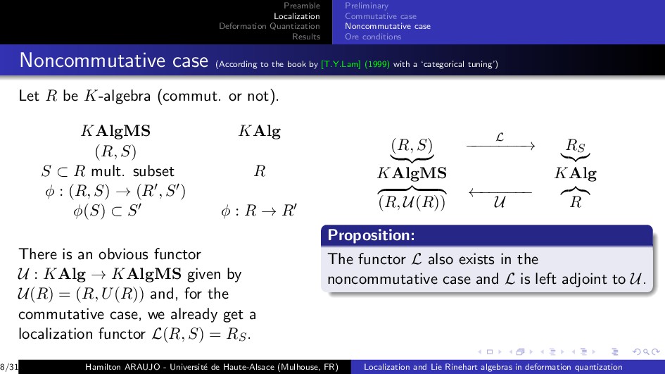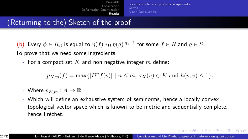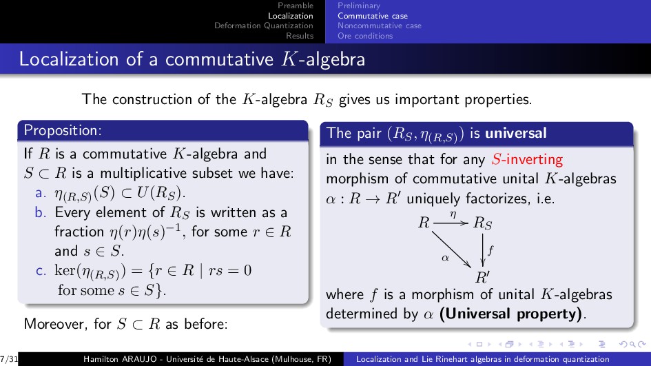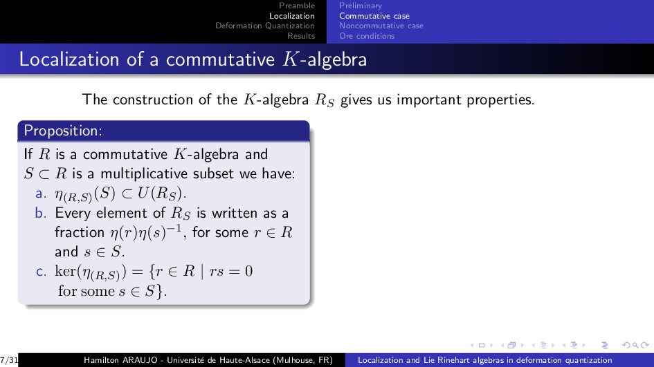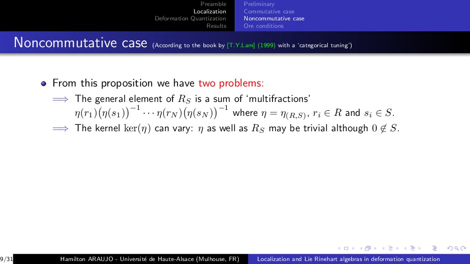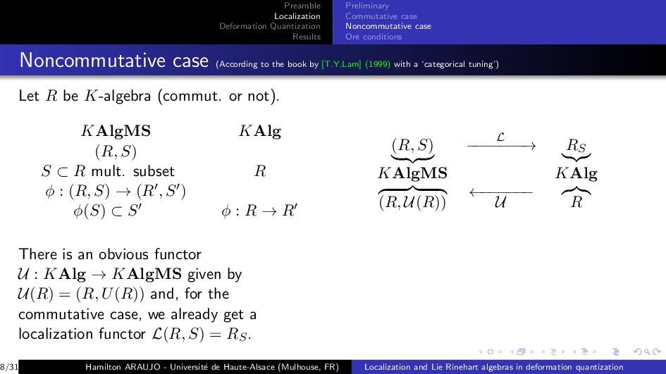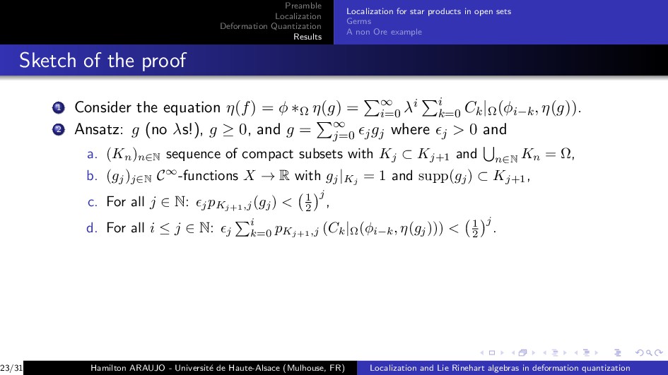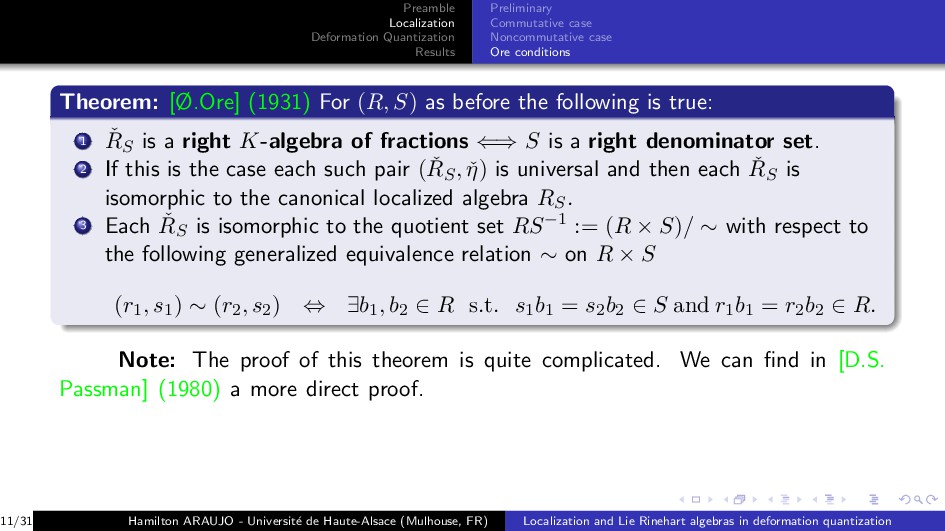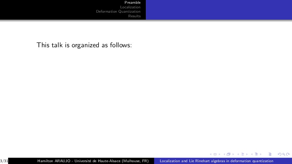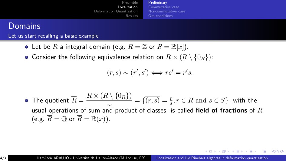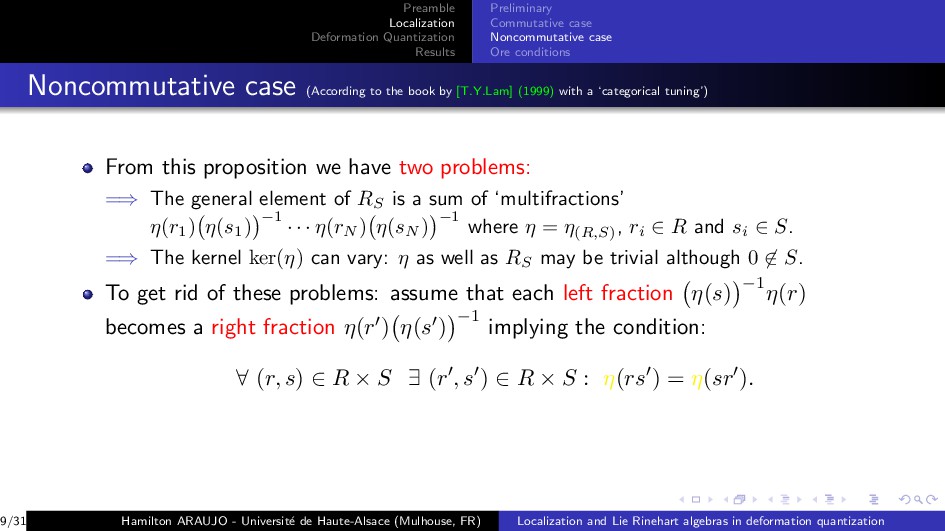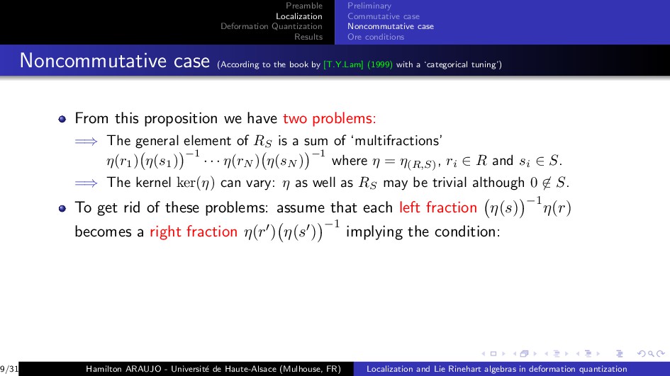 open sets Germs A non Ore example Bibliography Araujo, H., Bordemann, M., Hurle, B.: Noncommutative localization in smooth deformation quantization. Preprint, ArXiv:2010.15701 2020. Bayen, F., Flato, M., Frønsdal, C., Licherowicz, A., Sternheimer, D.: Deformation theory and quantization. I, II. Annals of Phys. 111, 61-110, 111-151 (1978). Lam, T.Y.: Lectures on Modules and Rings. Springer Verlag, Berlin, 1999. Mac Lane, S.: Categories for the Working Mathematician. 2nd ed., Springer, New York, 1998. ˇ Skoda, Z.: Noncommutative localization in noncommutative geometry, arXiv:math/0403276v2, 2005. Tougeron, J.-C.: Id´ eaux des fonctions diff´ erentiables, Springer Verlag, Berlin, 1972. 31/31 Hamilton ARAUJO - Universit´ e de Haute-Alsace (Mulhouse, FR) Localization and Lie Rinehart algebras in deformation quantization