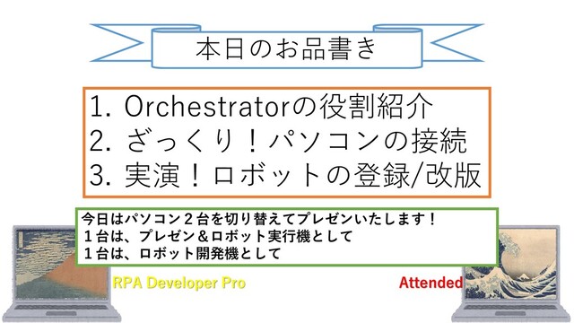 Attended RPA Developer Pro 本日のお品書き 1. Orchestratorの役割紹介 2. ざっくり!パソコンの接続 3.