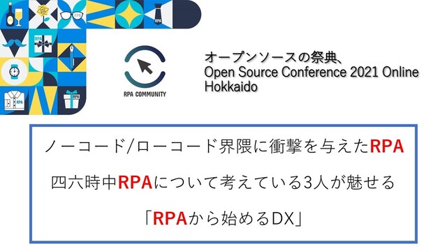 オープンソースの祭典、 Open Source Conference 2021 Online Hokkaido ノーコード/ローコード界隈に衝撃を与えたRPA 四六時中RPAについて考えている3人が魅せる 「RPAから始めるDX」