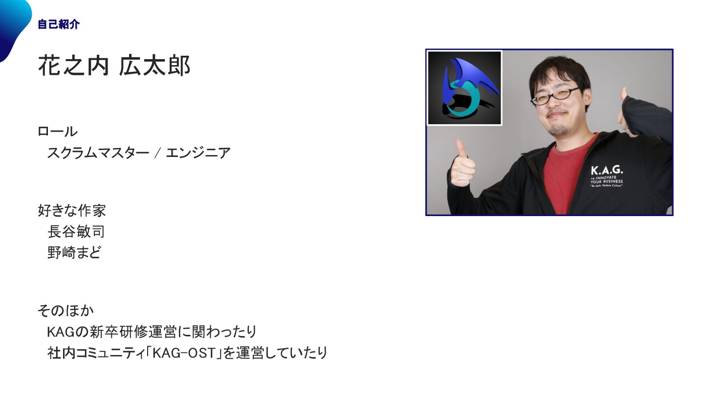 スクラムマスター / エンジニア 好きな作家 長谷敏司 野崎まど そ ほか AG 新卒研修運営に関わったり 社内コミュニティ「 AG- 」を運営していたり 自己紹介
