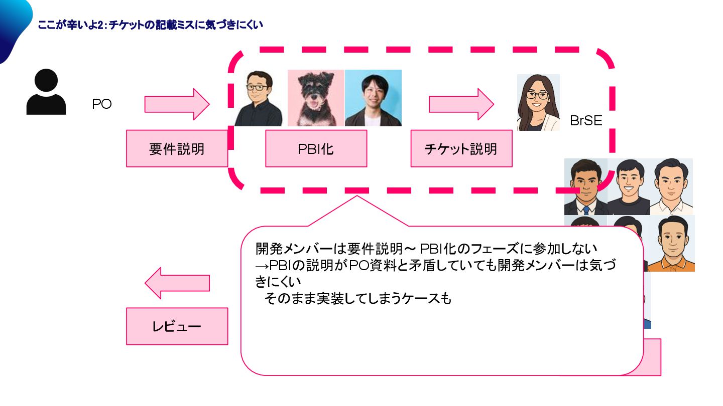 PO BrSE PBI化 チケット説明 開発 受け入れ レビュー 開発メンバー 要件説明〜 PBI化 フェーズに参加しない →PBI 説明がPO資料と矛盾していても開発メンバー 気づ きにくい そ まま実装してしまうケースも