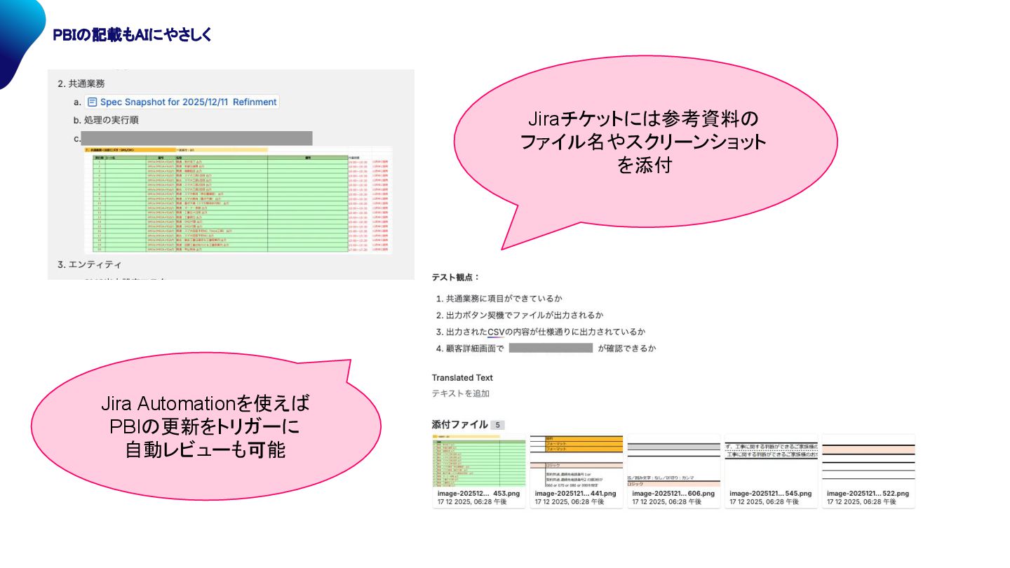 Jiraチケットに 参考資料 ファイル名やスクリーンショット を添付 Jira Automationを使え PBI 更新をトリガーに 自動レビューも可能