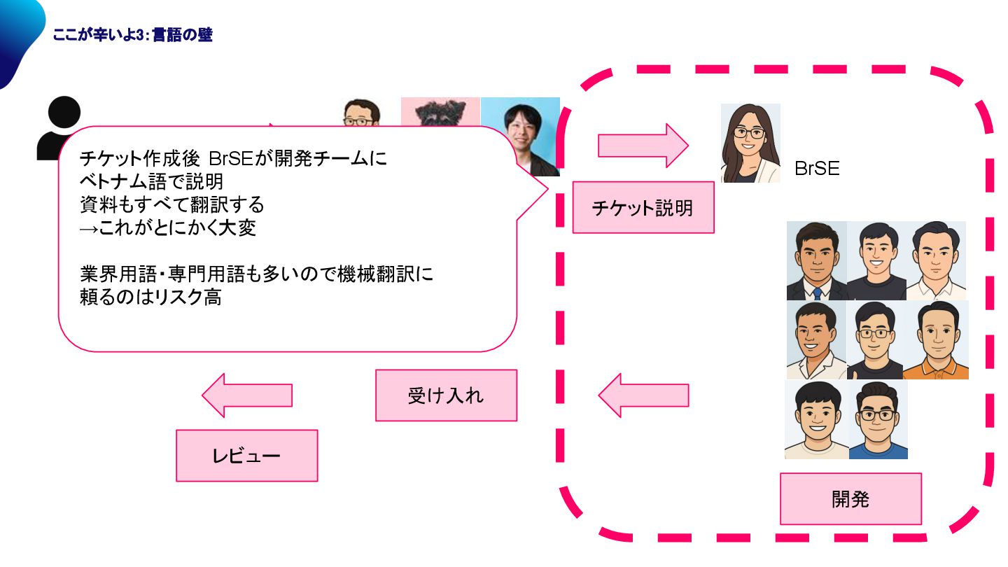 PO BrSE PBI化 チケット説明 開発 受け入れ レビュー チケット作成後 BrSEが開発チームに ベトナム語で説明 資料もすべて翻訳する →これがとにかく大変 業界用語・専門用語も多い で機械翻訳に 頼る リスク高