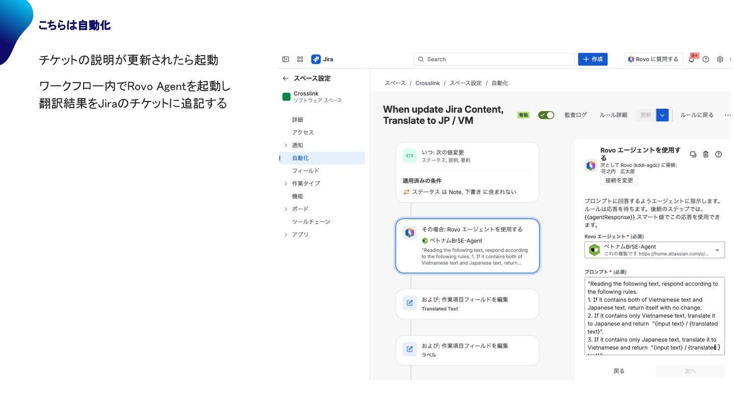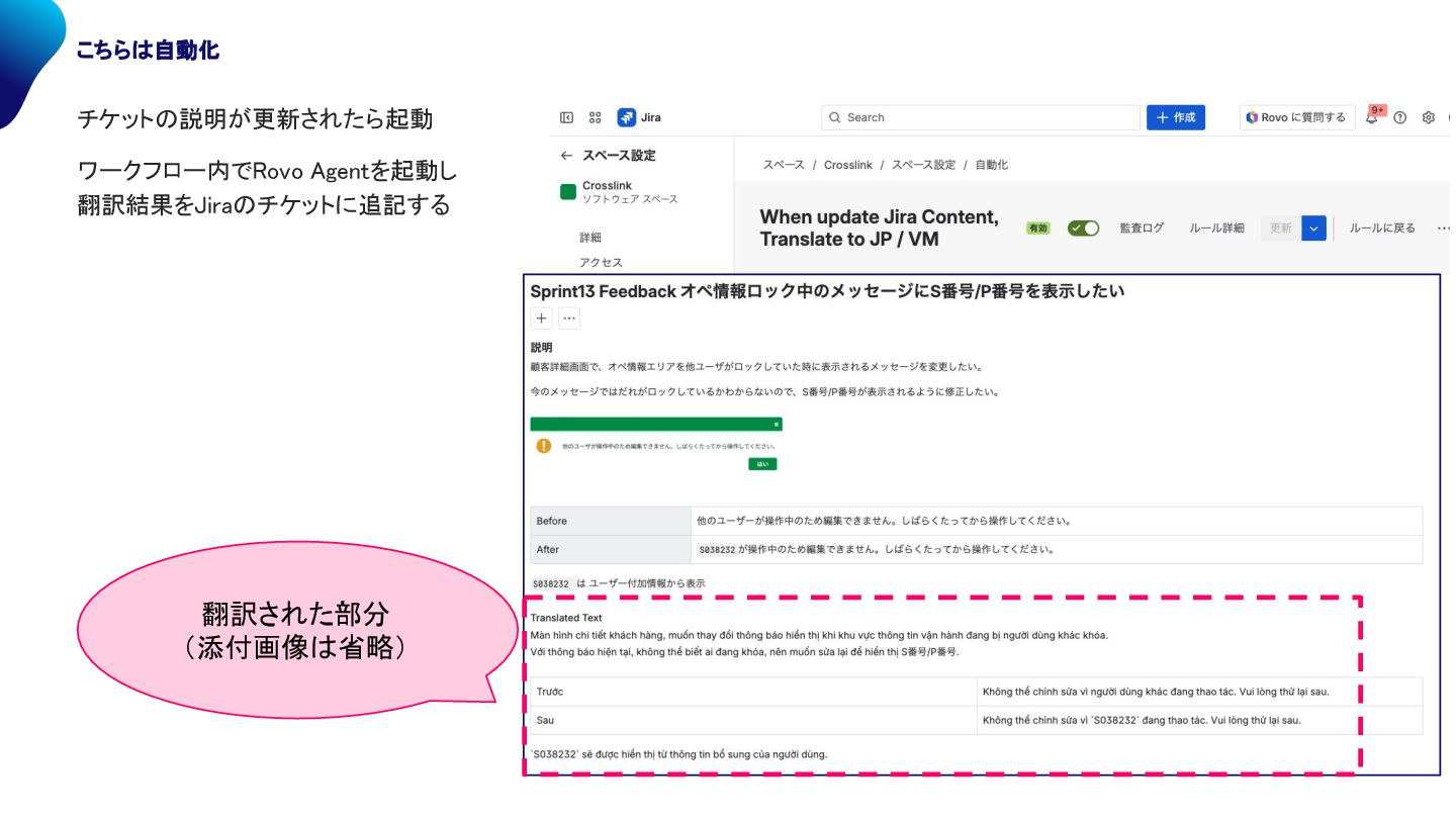 説明が更新されたら起動 ワークフロー内で ovo Agentを起動し 翻訳結果を ira チケットに追記する 翻訳された部分 (添付画像 省略)