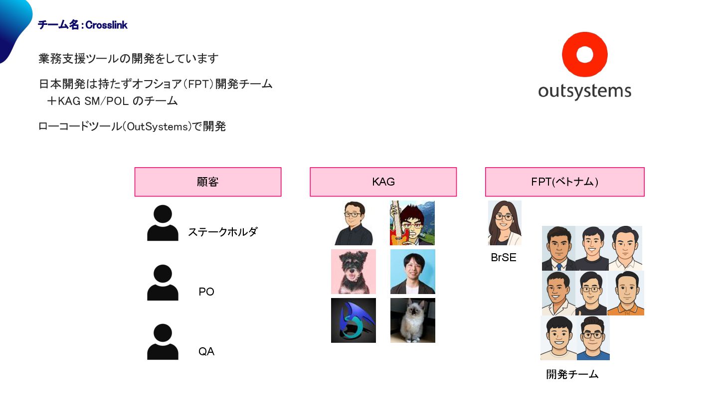 PO QA BrSE 開発チーム 業務支援ツール 開発をしています 日本開発 持たずオフショア(F )開発チーム + AG / チーム ローコードツール( ut ystems)で開発 チーム名:Crosslink