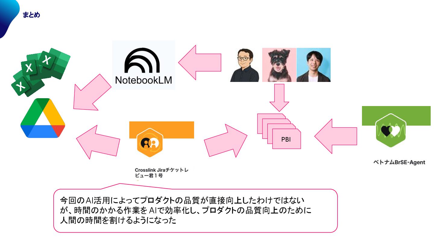PBI PBI 今回 AI活用によってプロダクト 品質が直接向上したわけで ない が、時間 かかる作業を AIで効率化し、プロダクト 品質向上 ために 人間 時間を割けるようになった