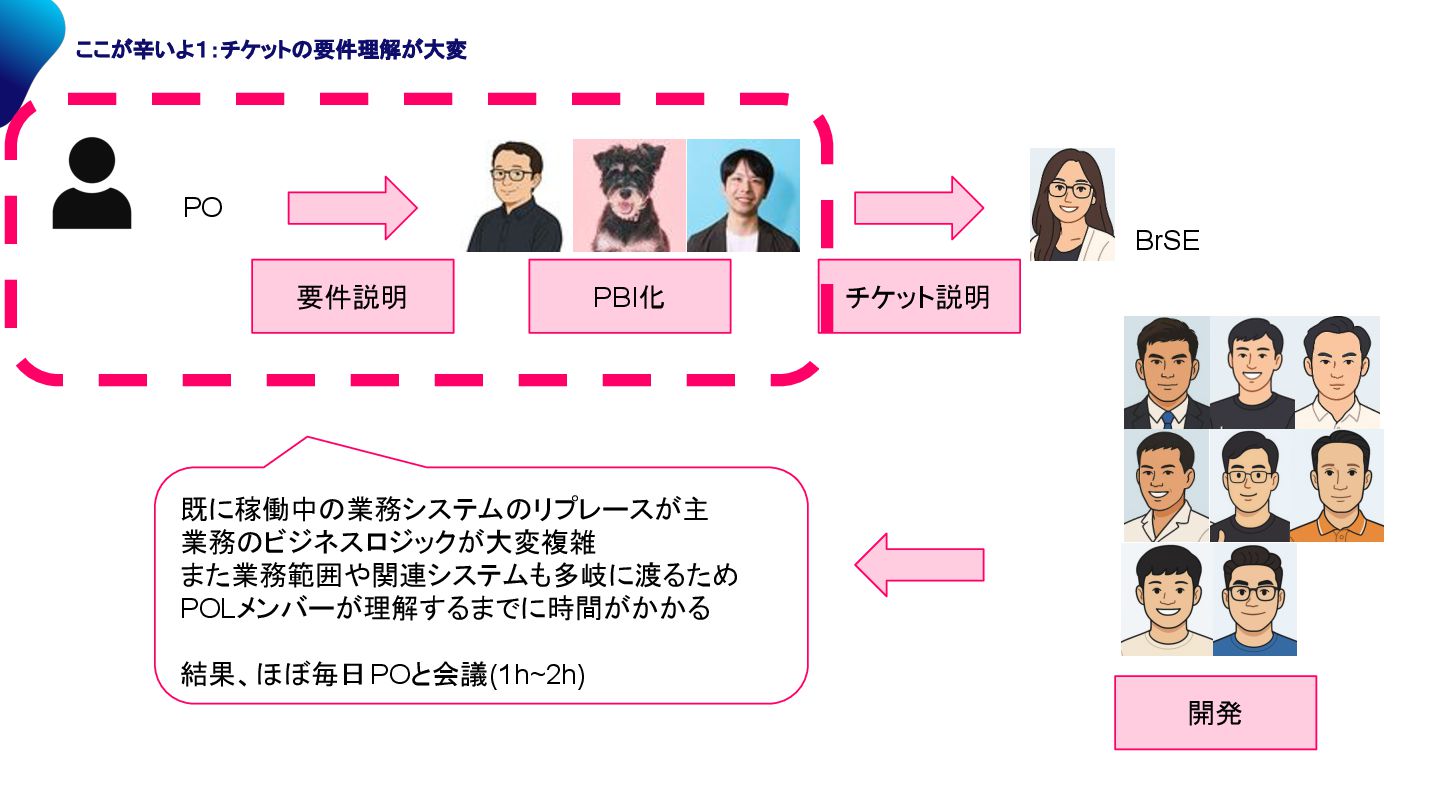PO BrSE PBI化 チケット説明 開発 受け入れ レビュー 既に稼働中 業務システム リプレースが主 業務 ビジネスロジックが大変複雑 また業務範囲や関連システムも多岐に渡るため POLメンバーが理解するまでに時間がかかる 結果、ほぼ毎日POと会議(1h~2h)